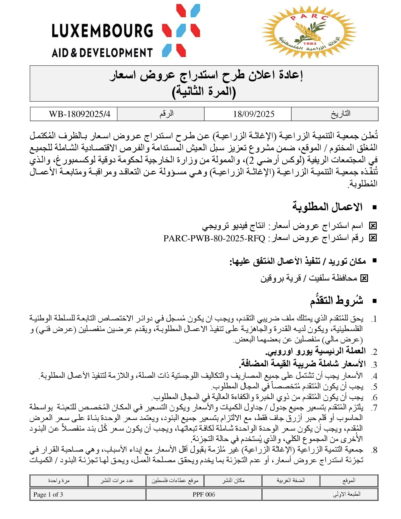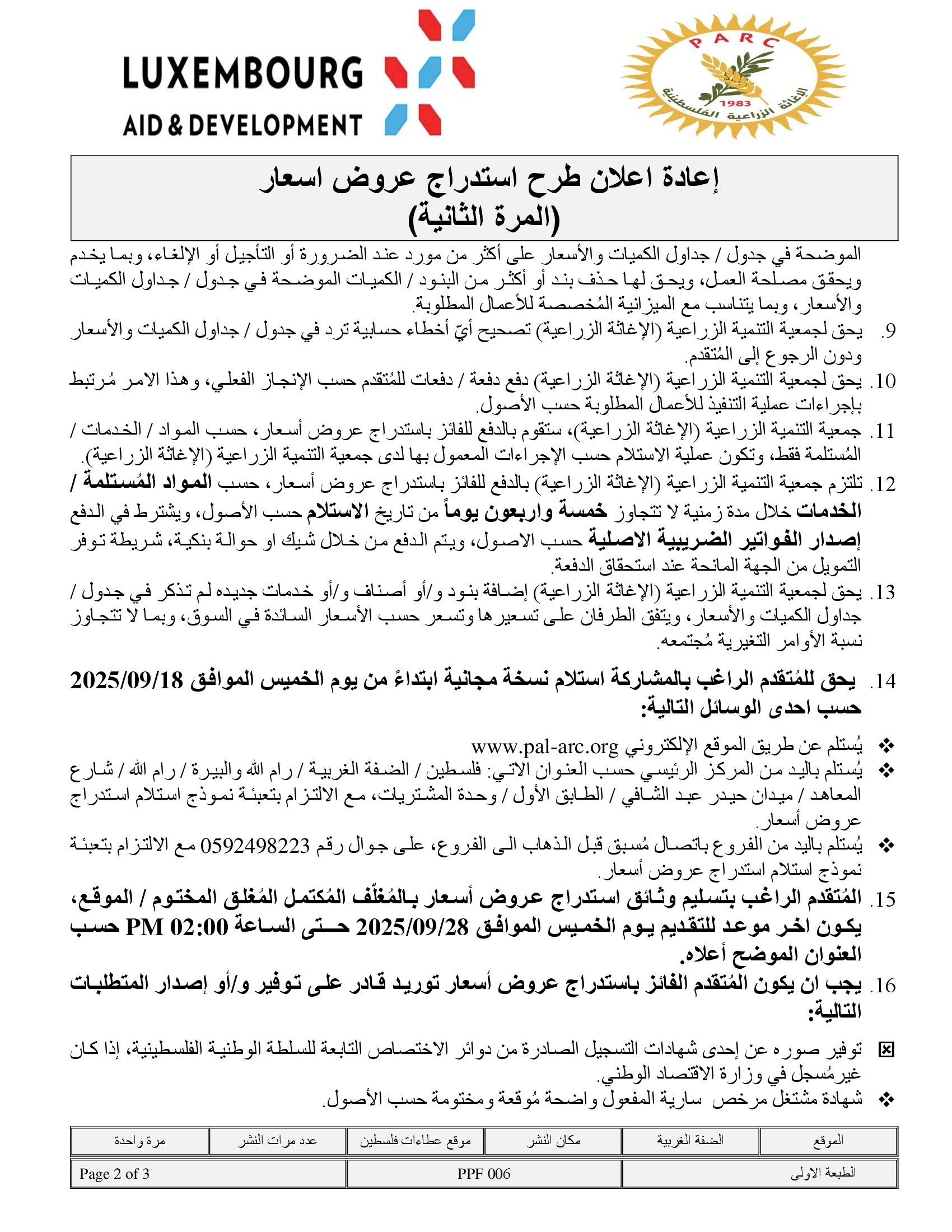 المؤسسة : جمعية التنمية الزراعية موقغ : https://pal-arc.org/tenders/ar بريد : info@pal-arc.org
