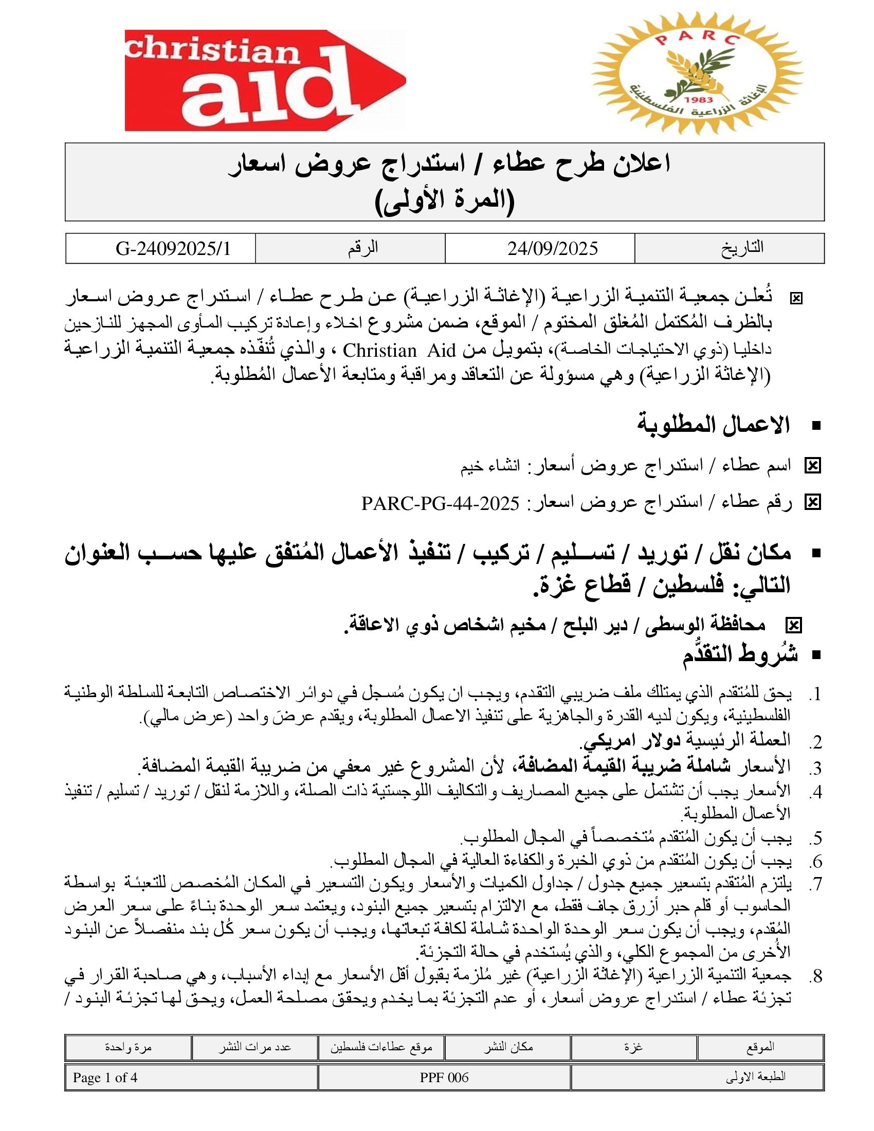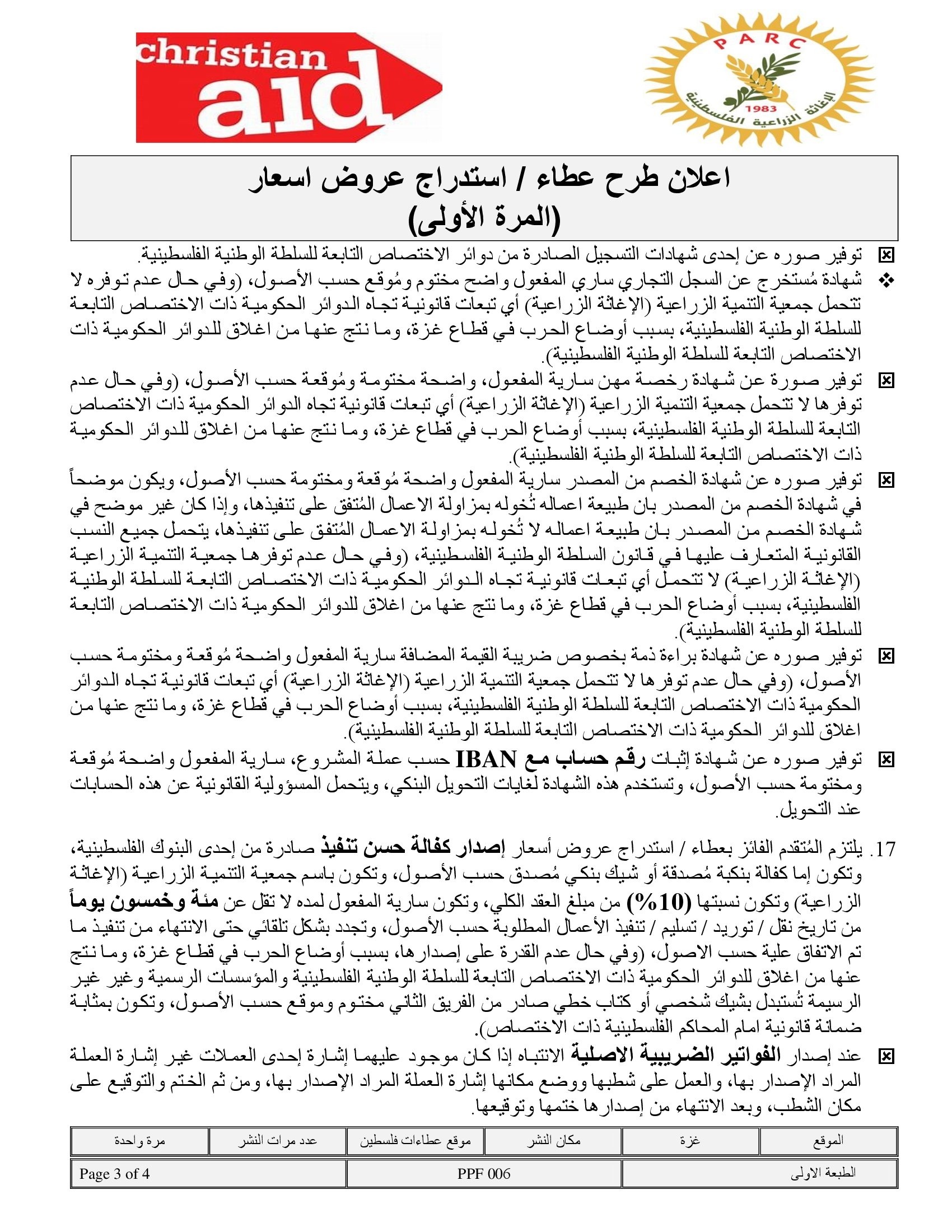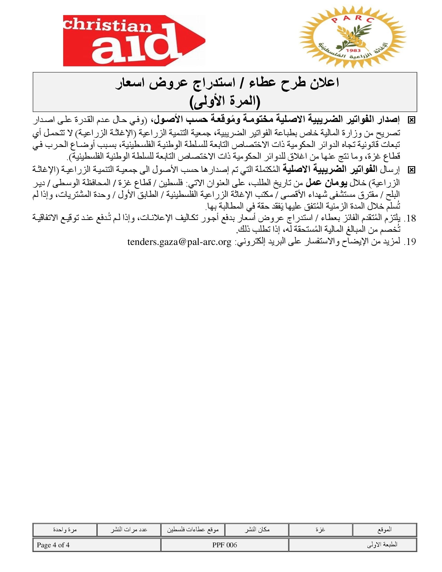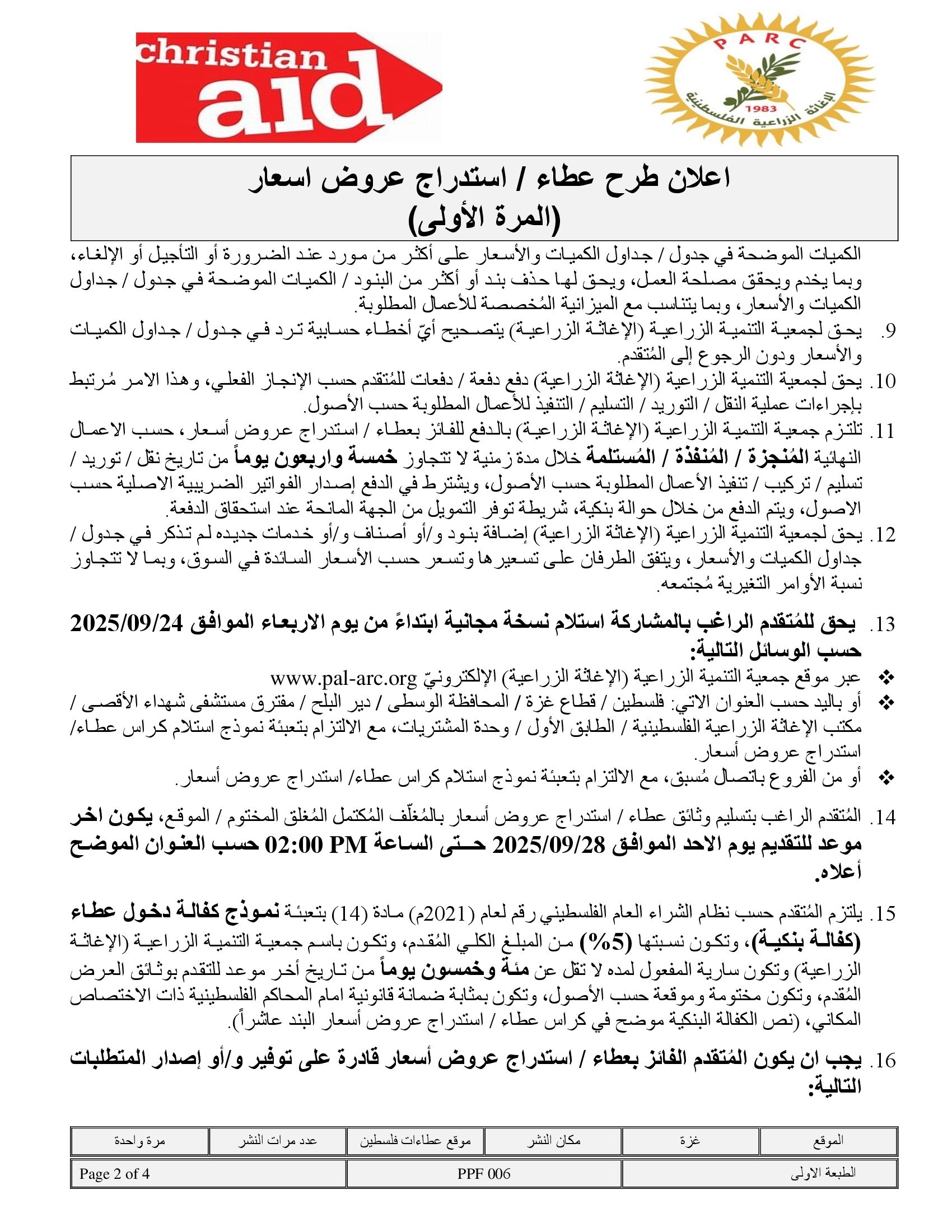 المؤسسة : جمعية التنمية الزراعية موقغ : https://pal-arc.org/tenders/ar بريد : info@pal-arc.org
