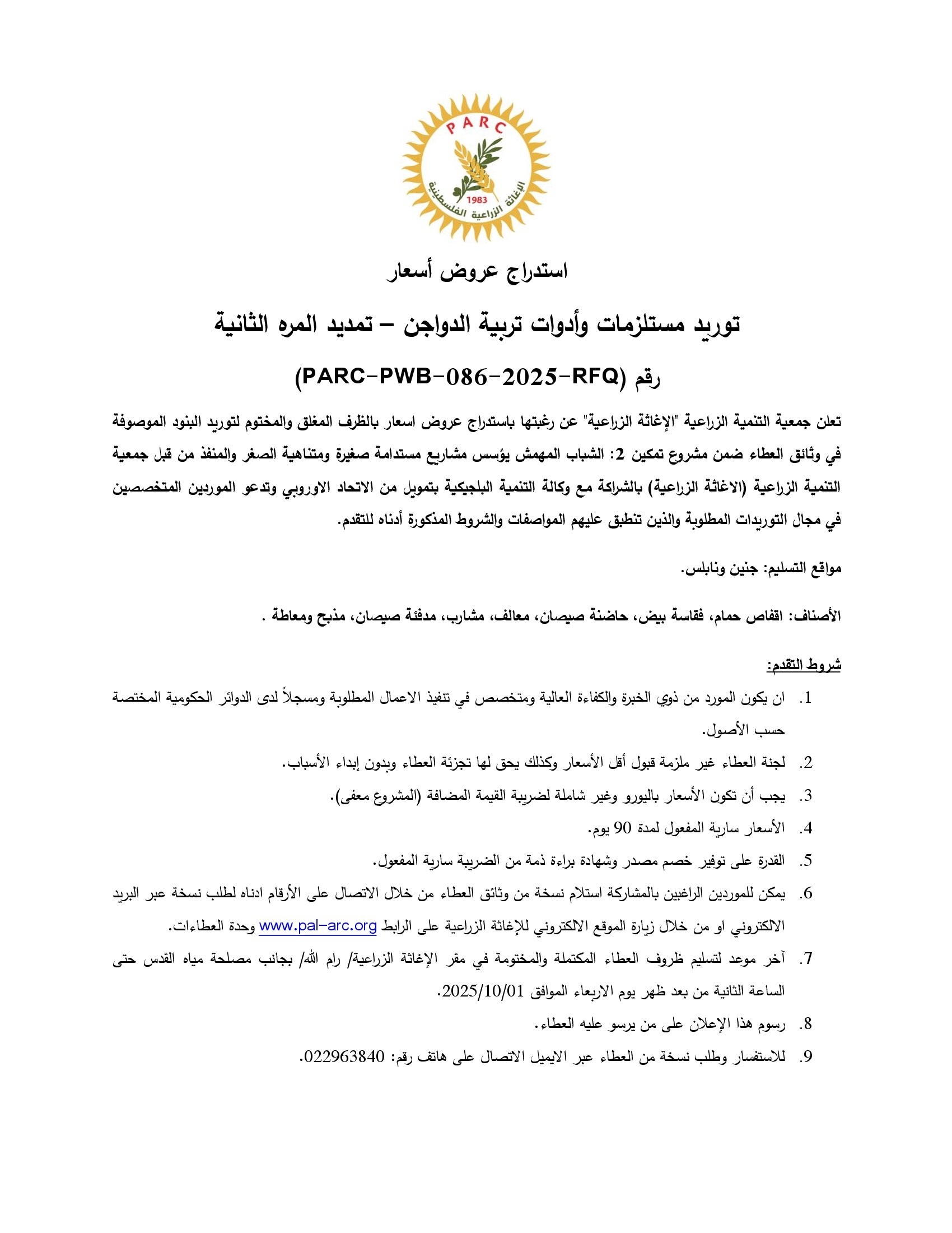 المؤسسة : جمعية التنمية الزراعية موقغ : https://pal-arc.org/tenders/ar بريد : info@pal-arc.org