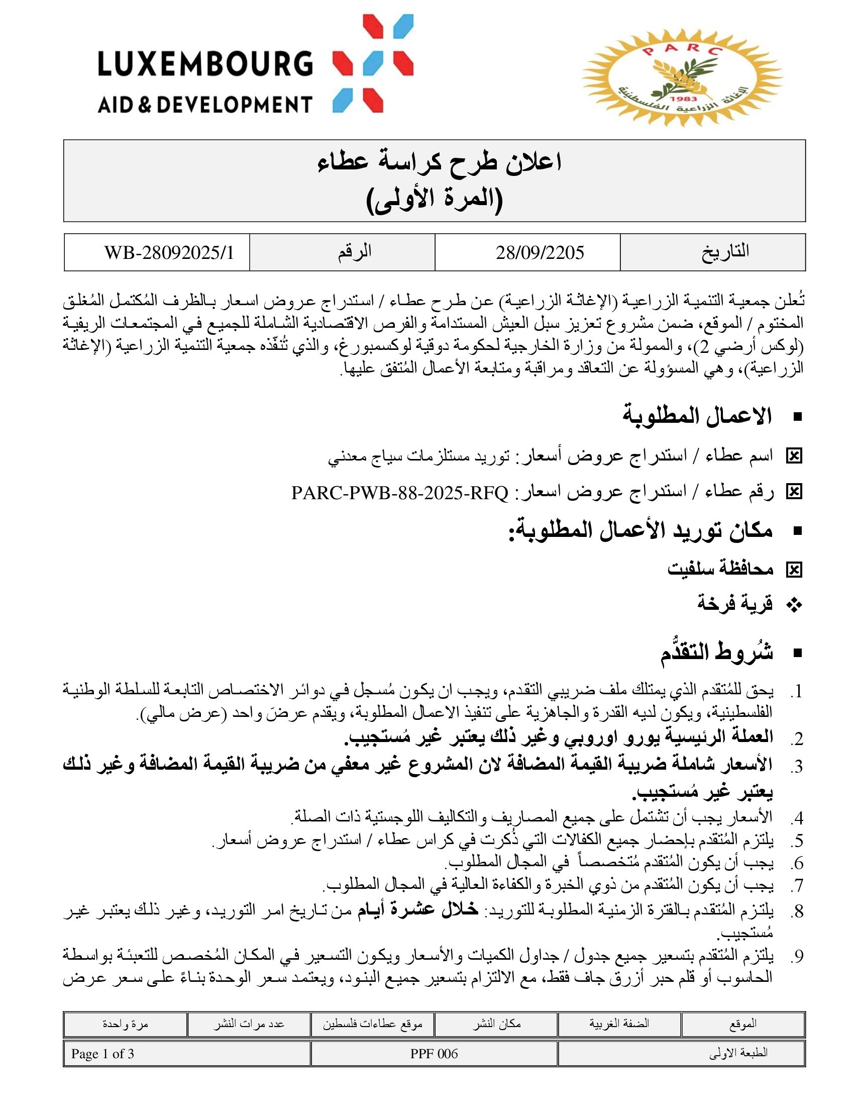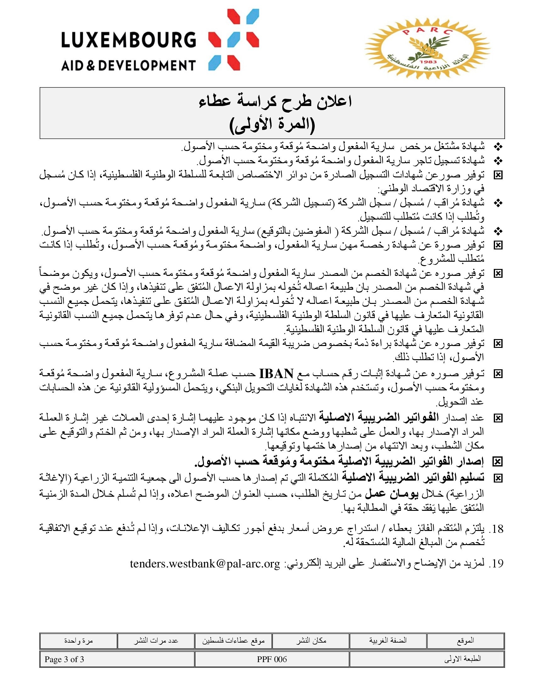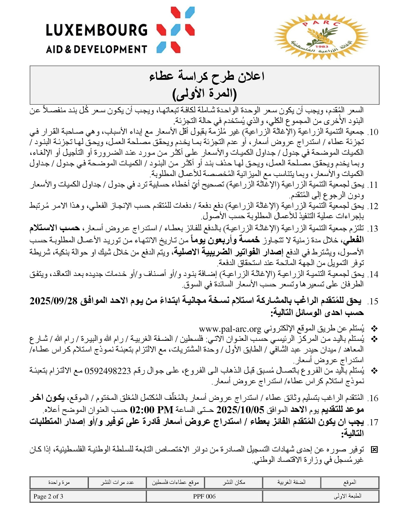 المؤسسة : جمعية التنمية الزراعية موقغ : https://pal-arc.org/tenders/ar بريد : info@pal-arc.org