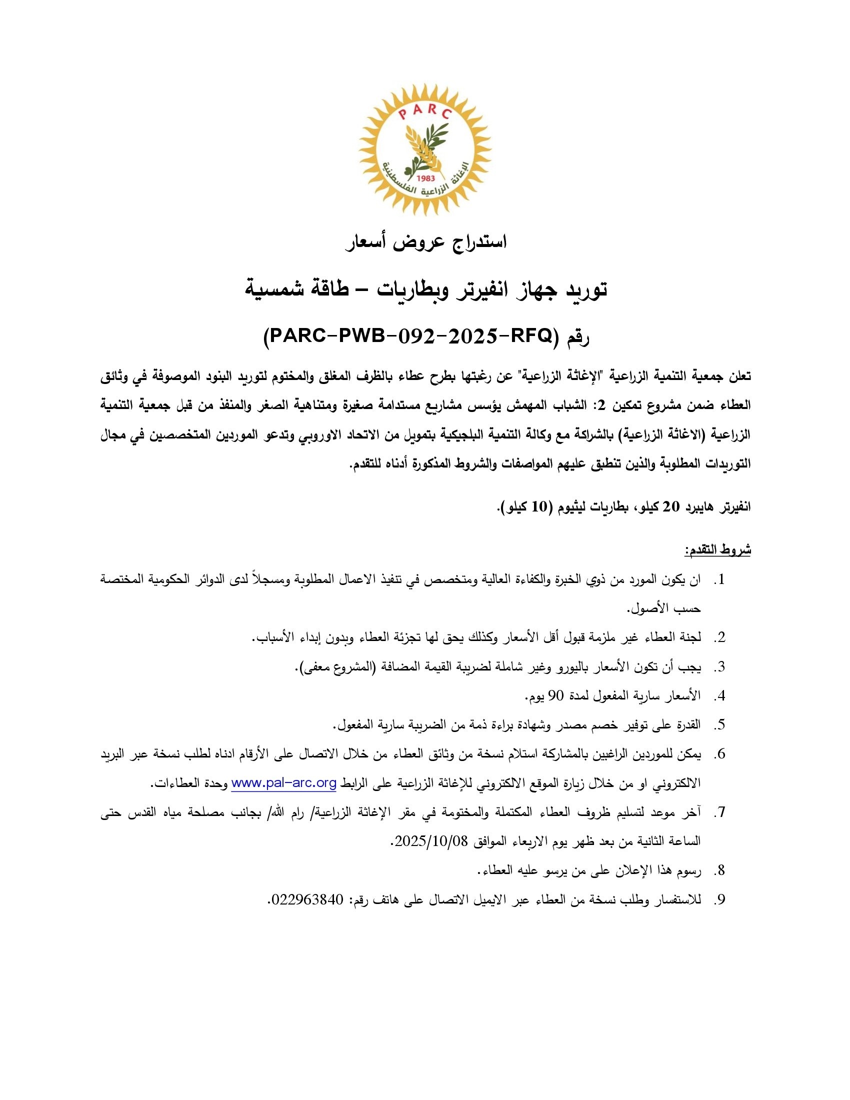 المؤسسة : جمعية التنمية الزراعية موقغ : https://pal-arc.org/tenders/ar بريد : info@pal-arc.org