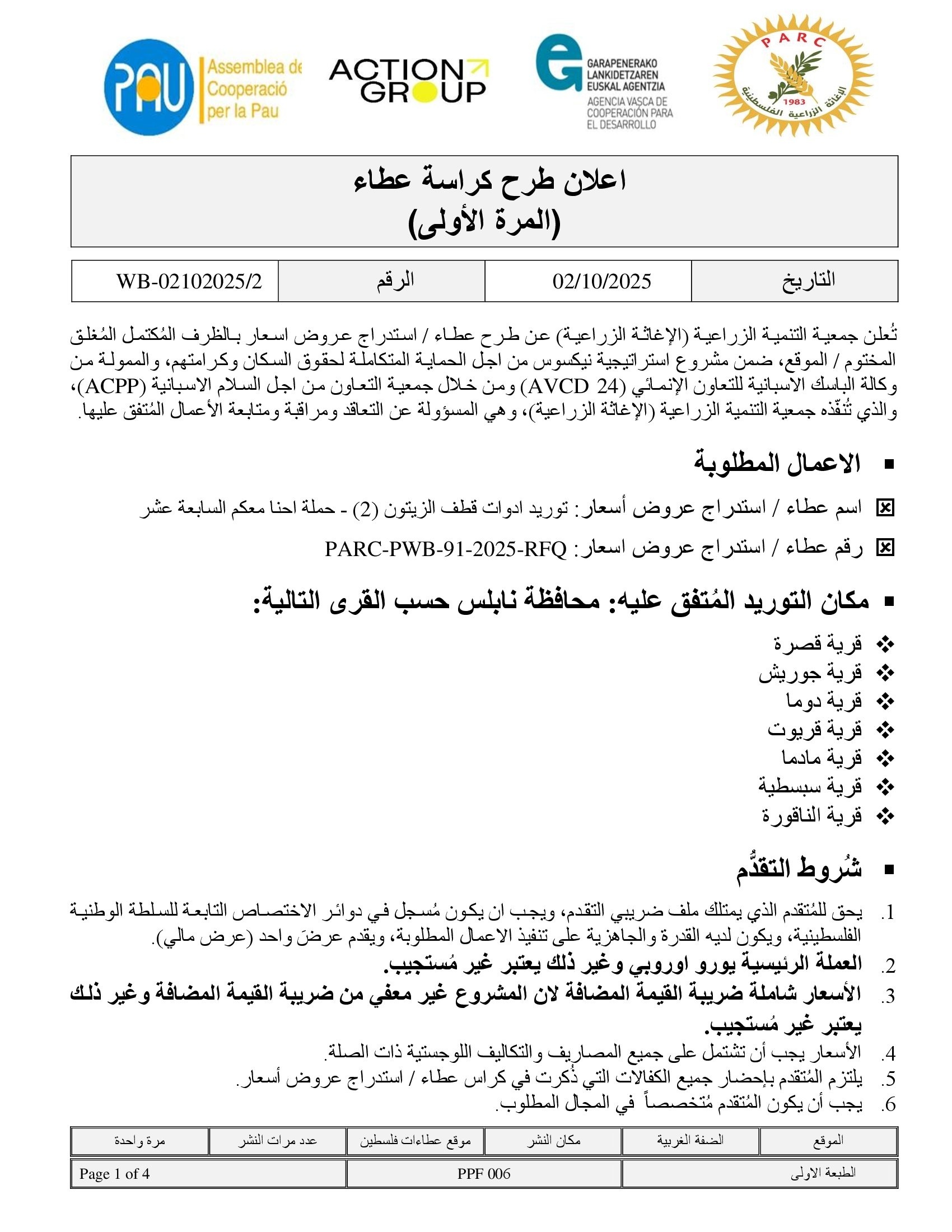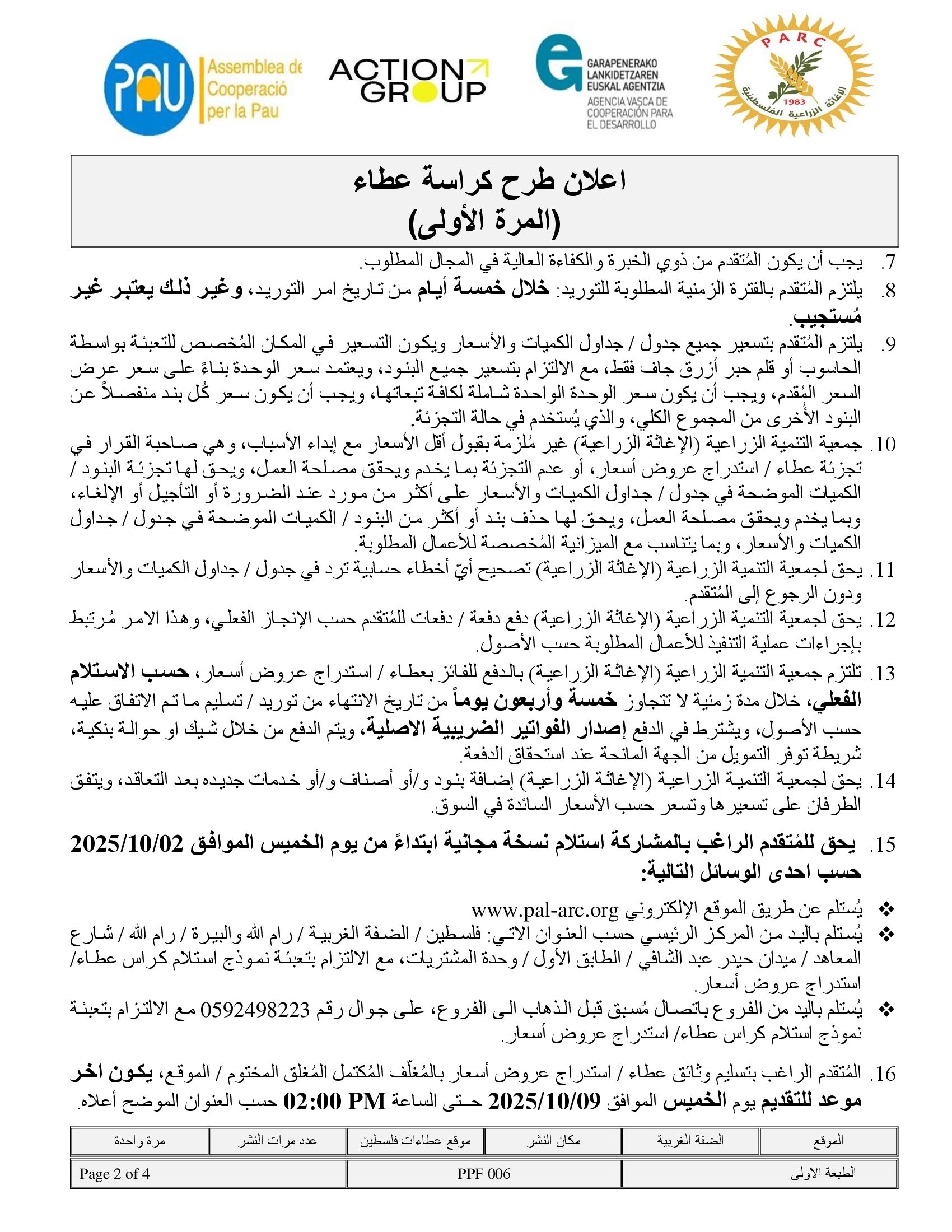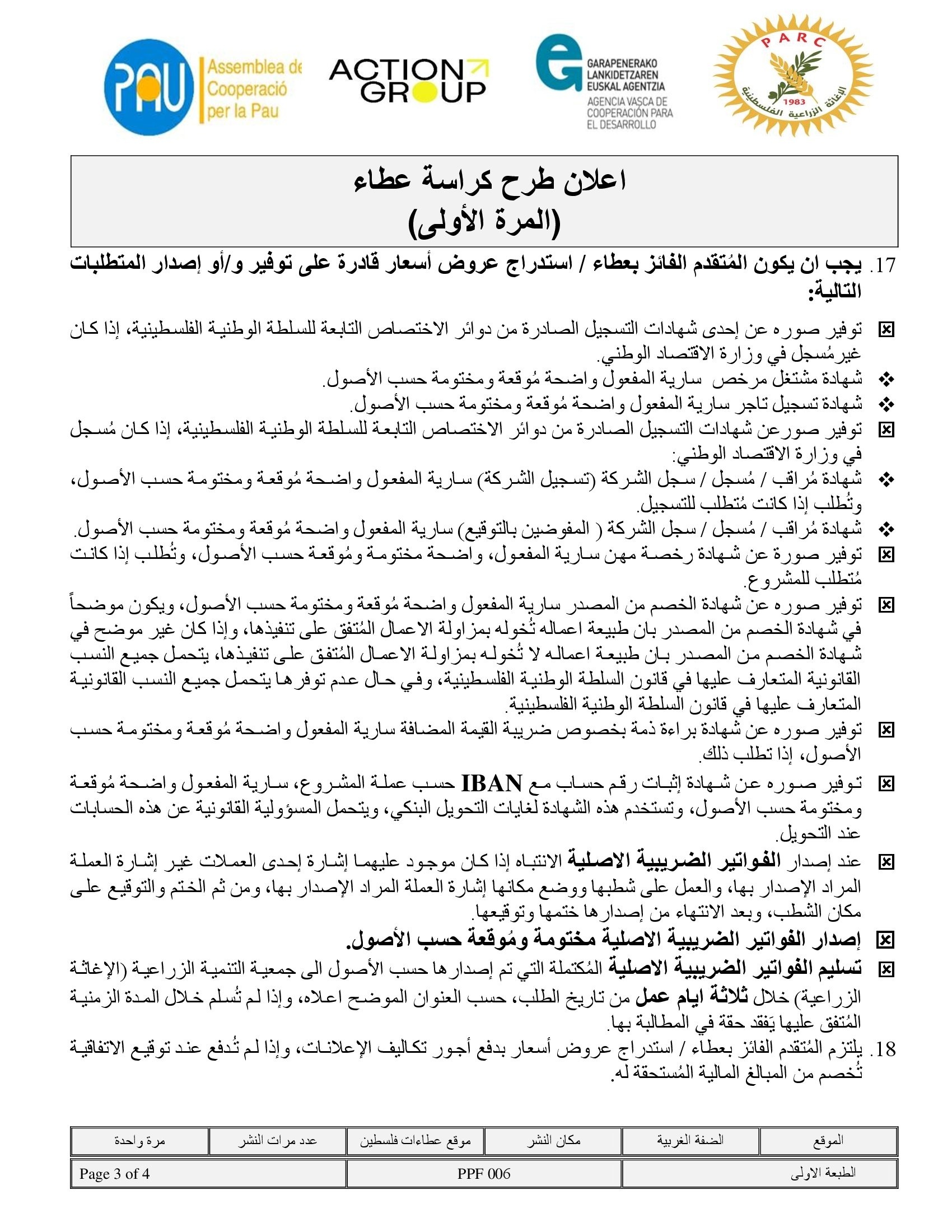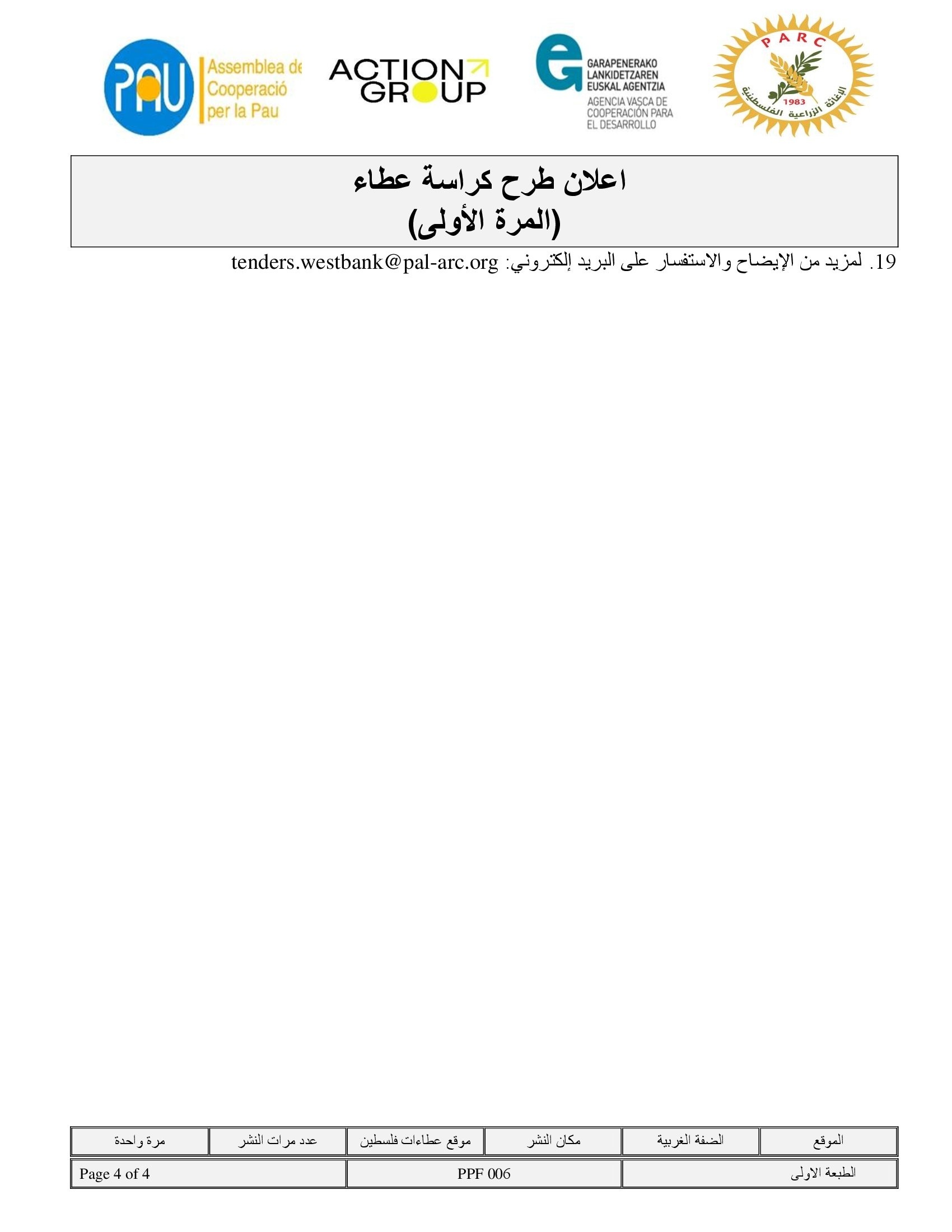 المؤسسة : جمعية التنمية الزراعية موقغ : https://pal-arc.org/tenders/ar بريد : info@pal-arc.org