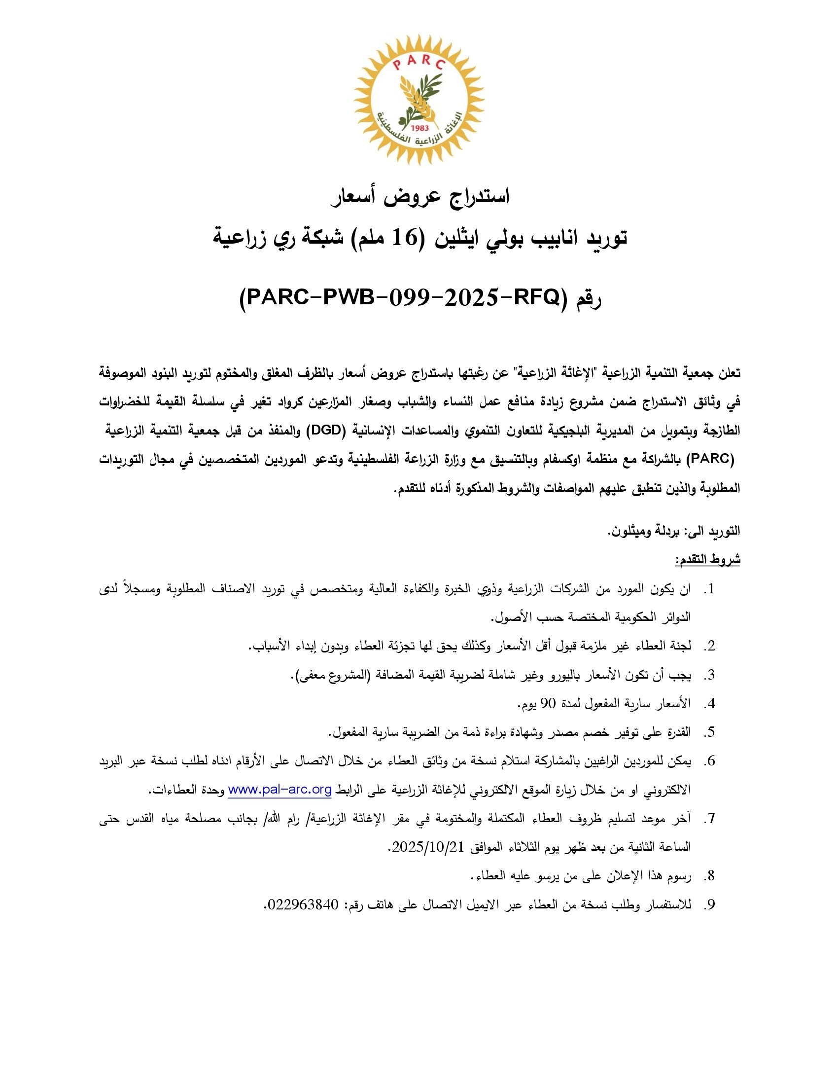 المؤسسة : جمعية التنمية الزراعية موقغ : https://pal-arc.org/tenders/ar بريد : info@pal-arc.org
