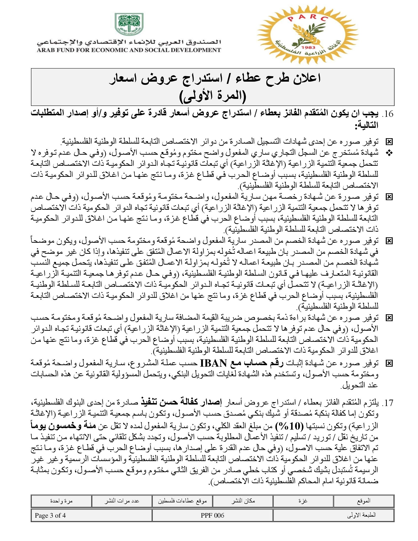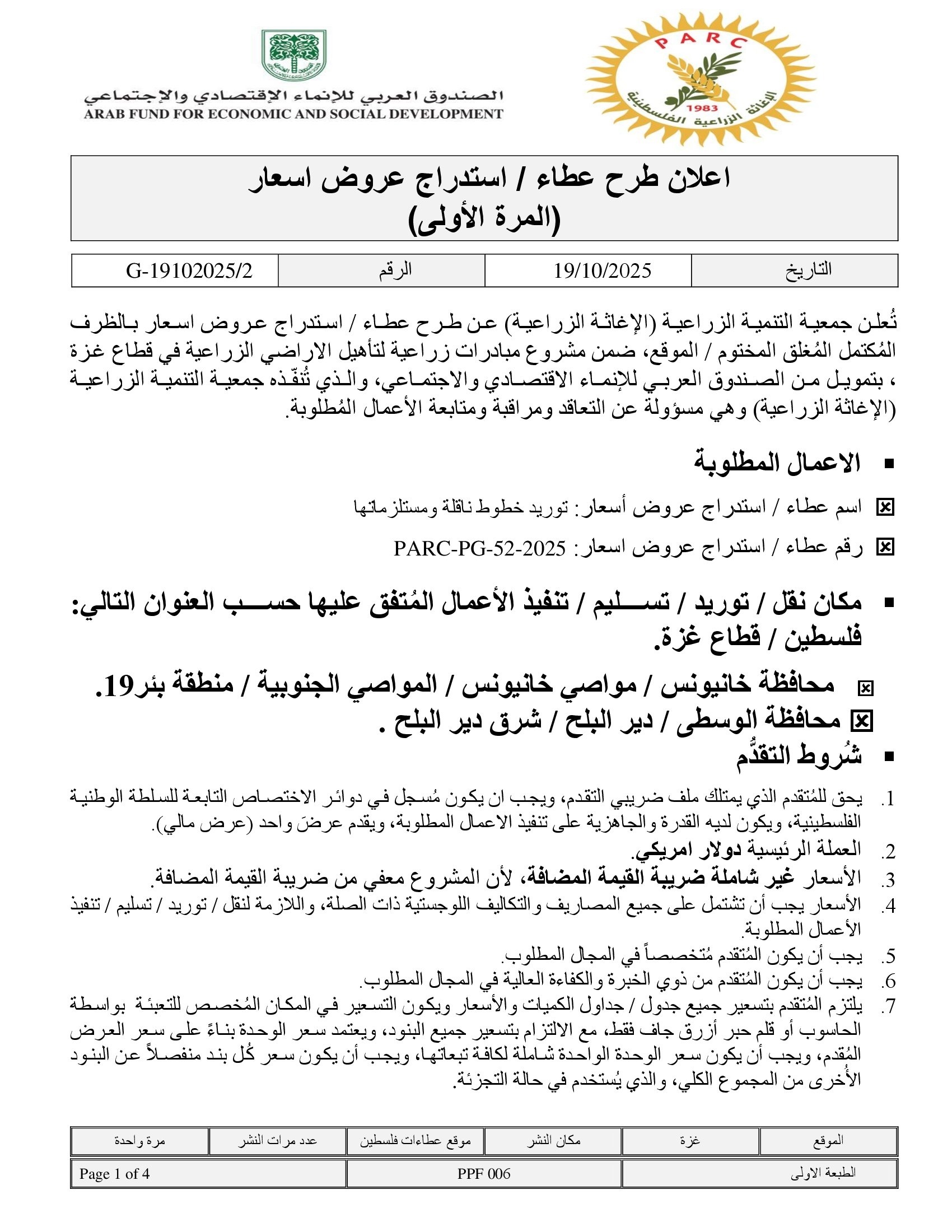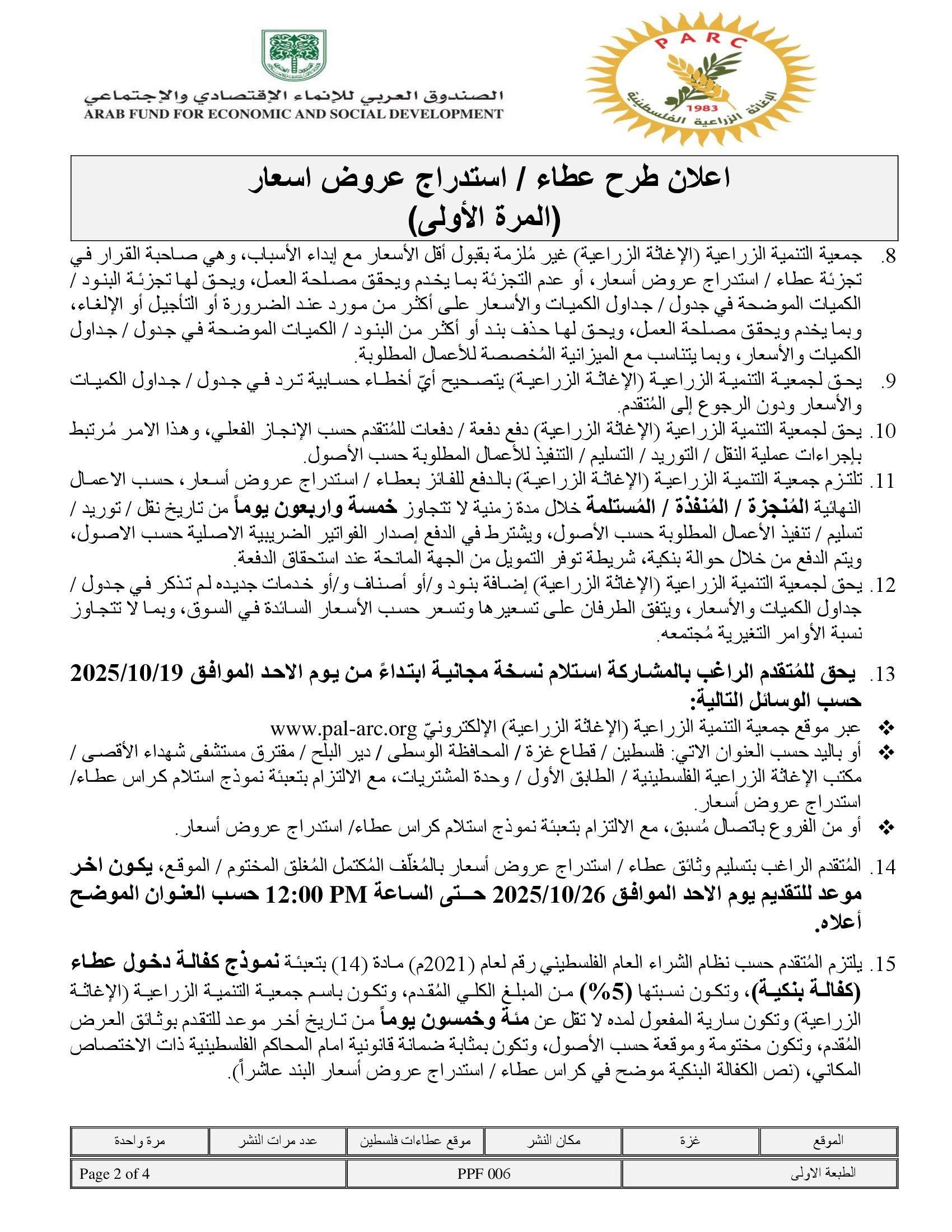 المؤسسة : جمعية التنمية الزراعية موقغ : https://pal-arc.org/tenders/ar بريد : info@pal-arc.org