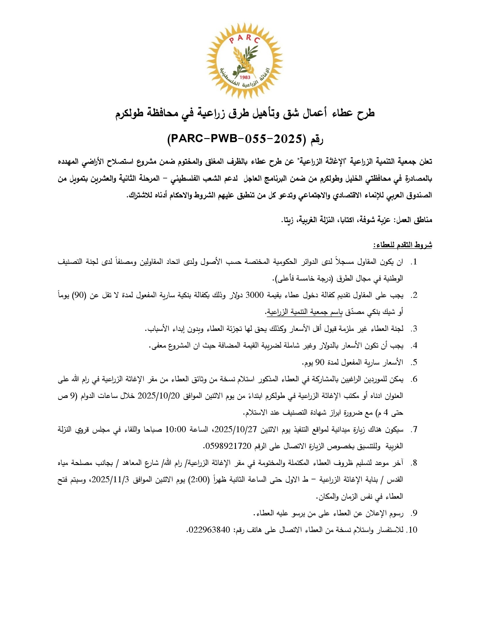 المؤسسة : جمعية التنمية الزراعية موقغ : https://pal-arc.org/tenders/ar بريد : info@pal-arc.org