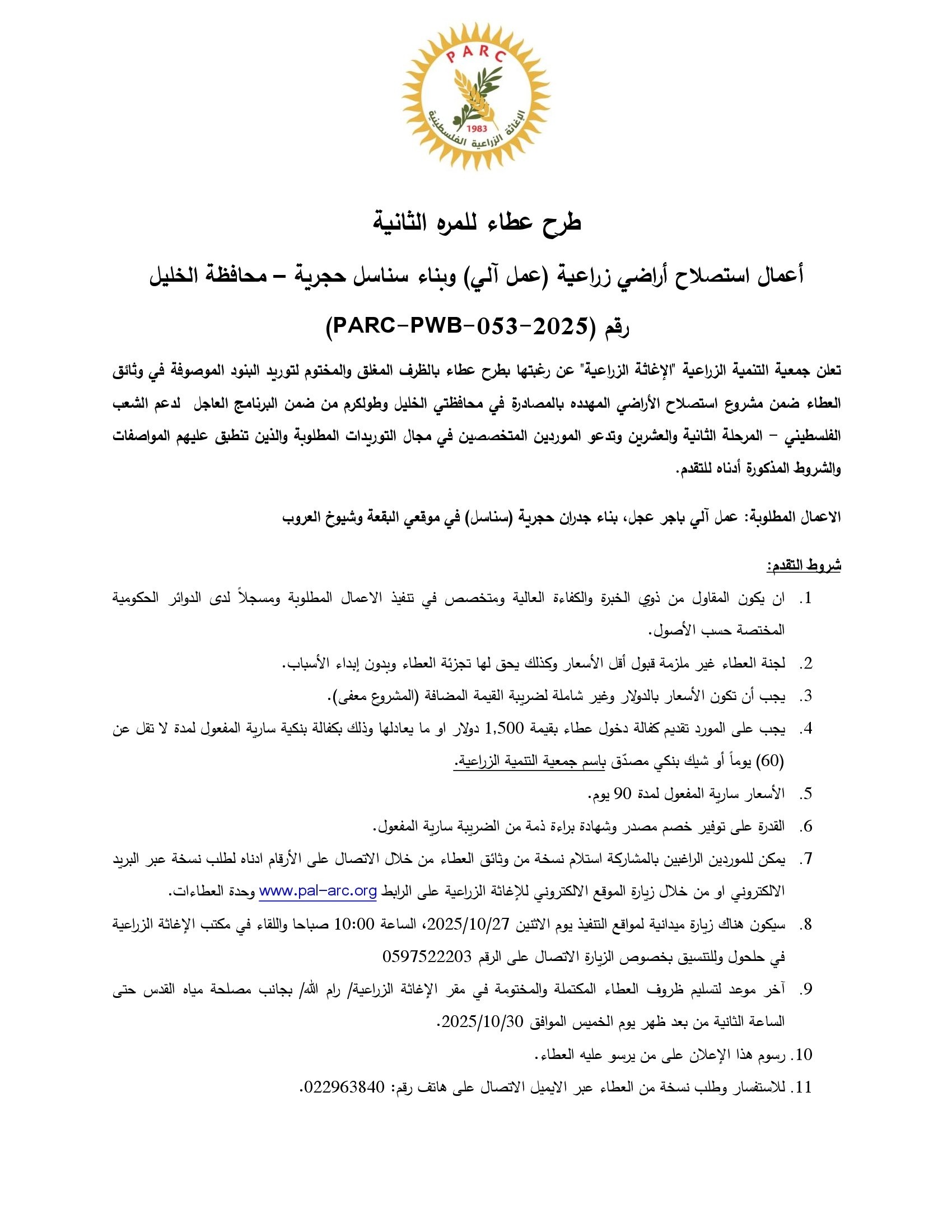 المؤسسة : جمعية التنمية الزراعية موقغ : https://pal-arc.org/tenders/ar بريد : info@pal-arc.org