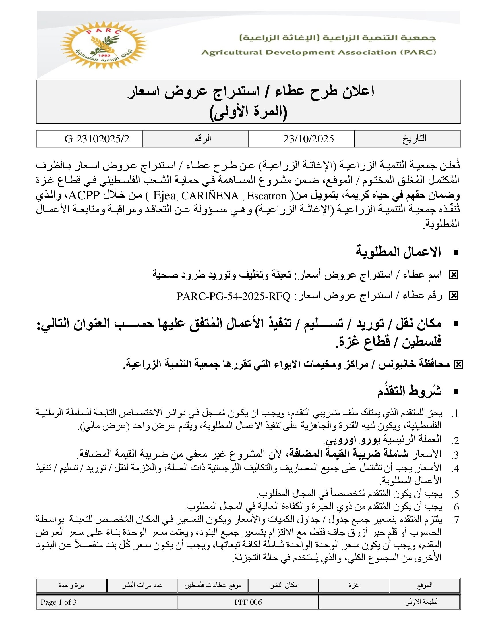 المؤسسة : جمعية التنمية الزراعية موقغ : https://pal-arc.org/tenders/ar بريد : info@pal-arc.org