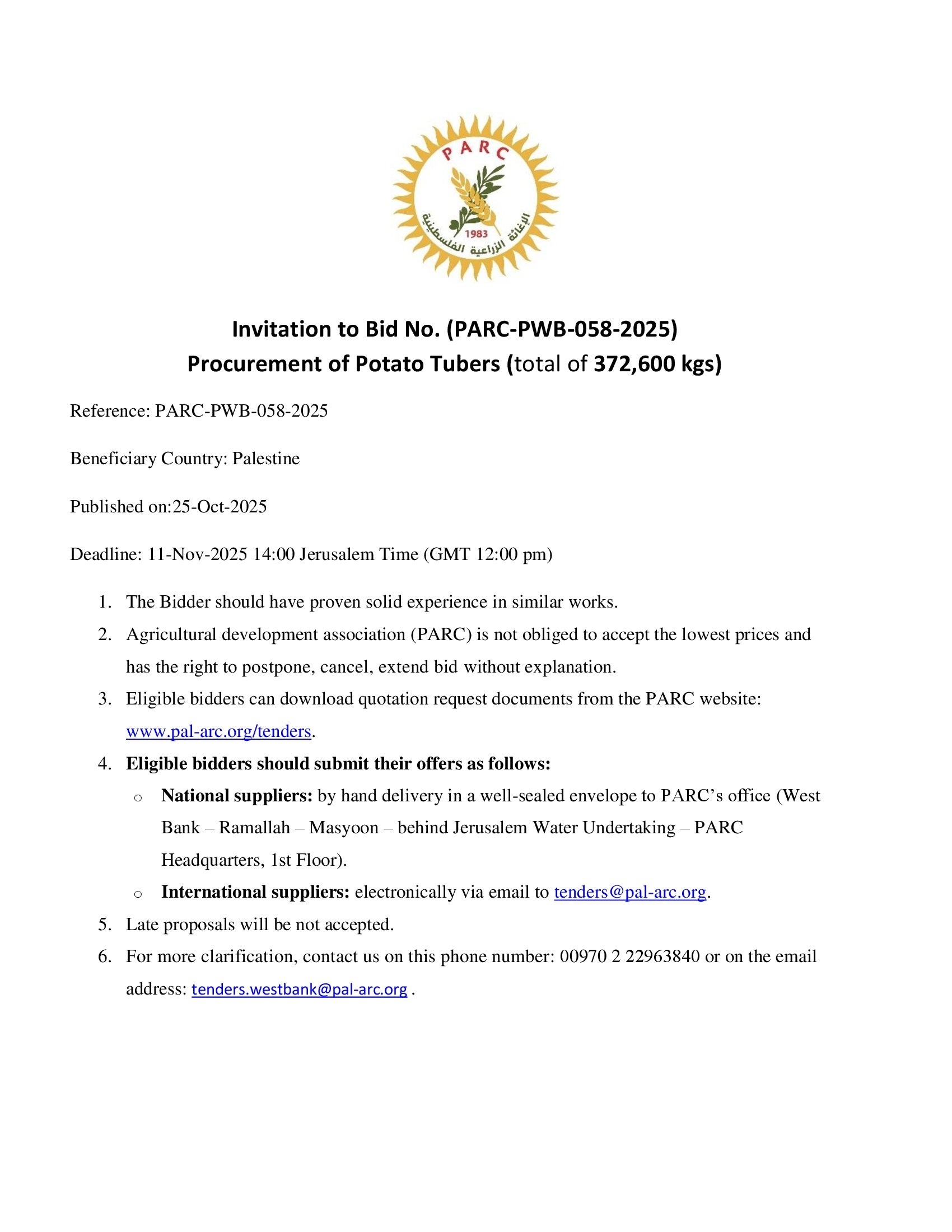 المؤسسة : جمعية التنمية الزراعية موقغ : https://pal-arc.org/tenders/ar بريد : info@pal-arc.org