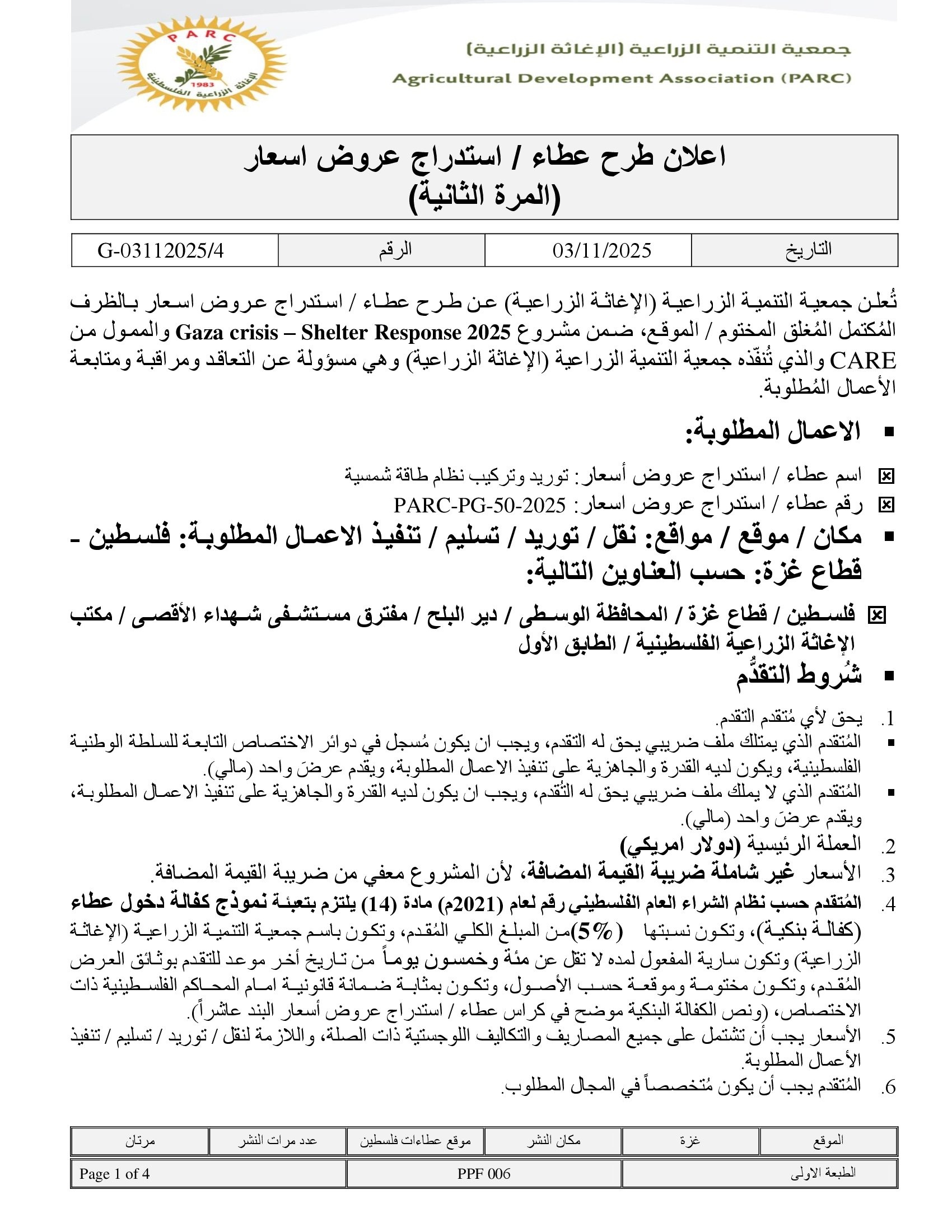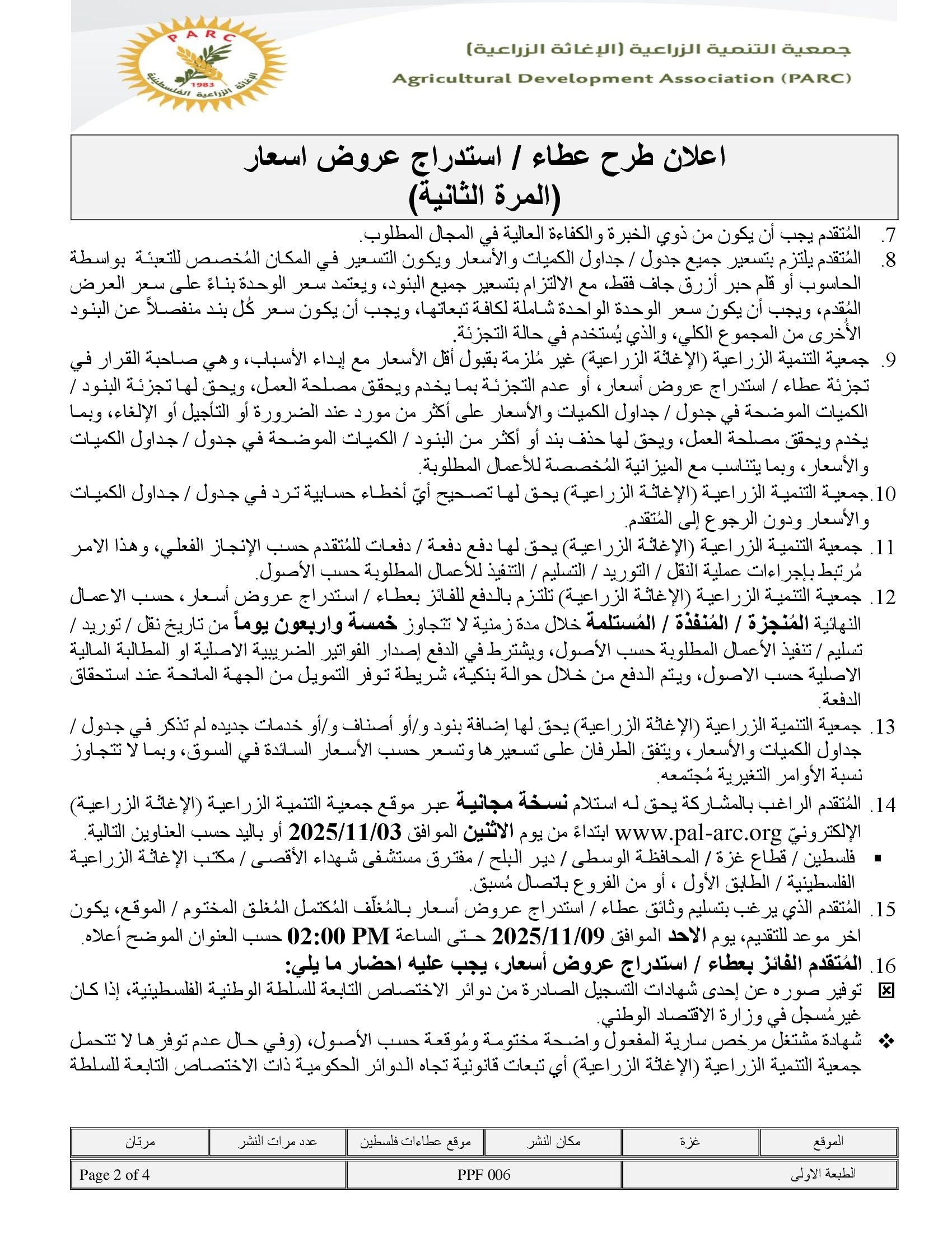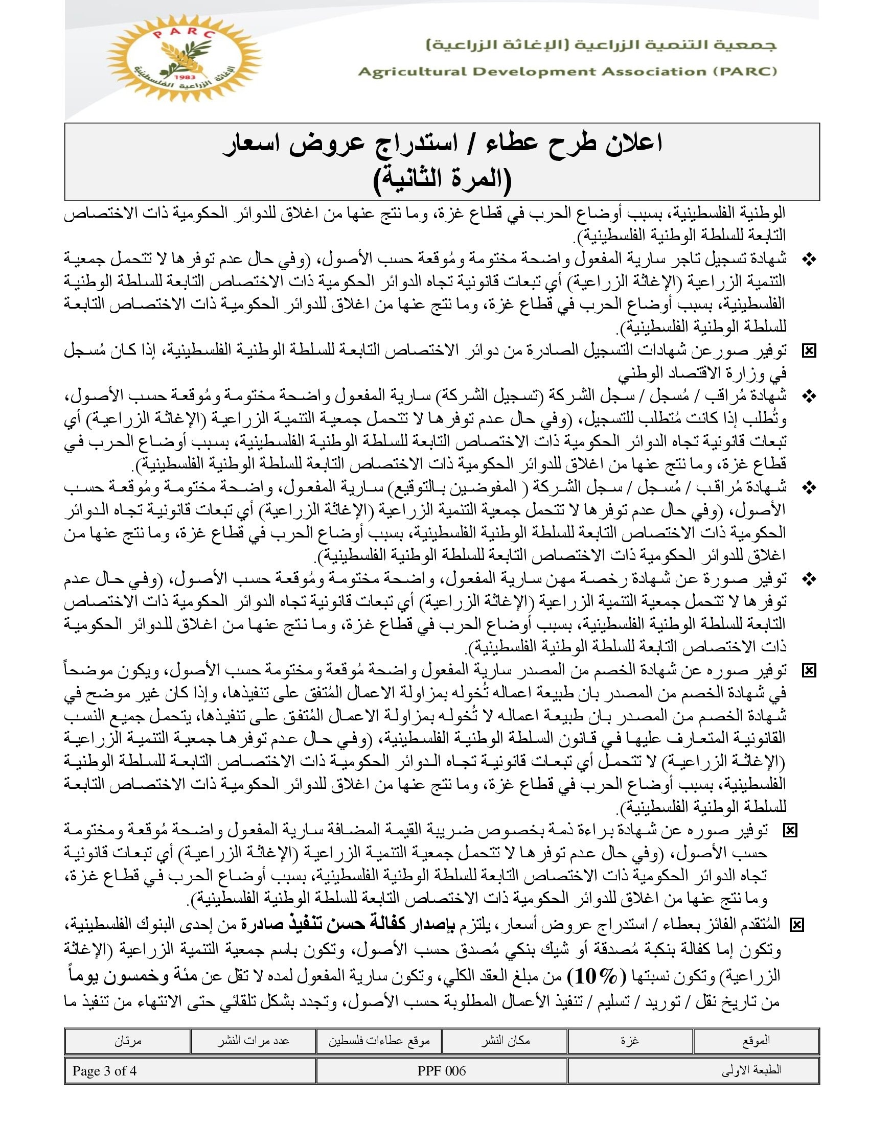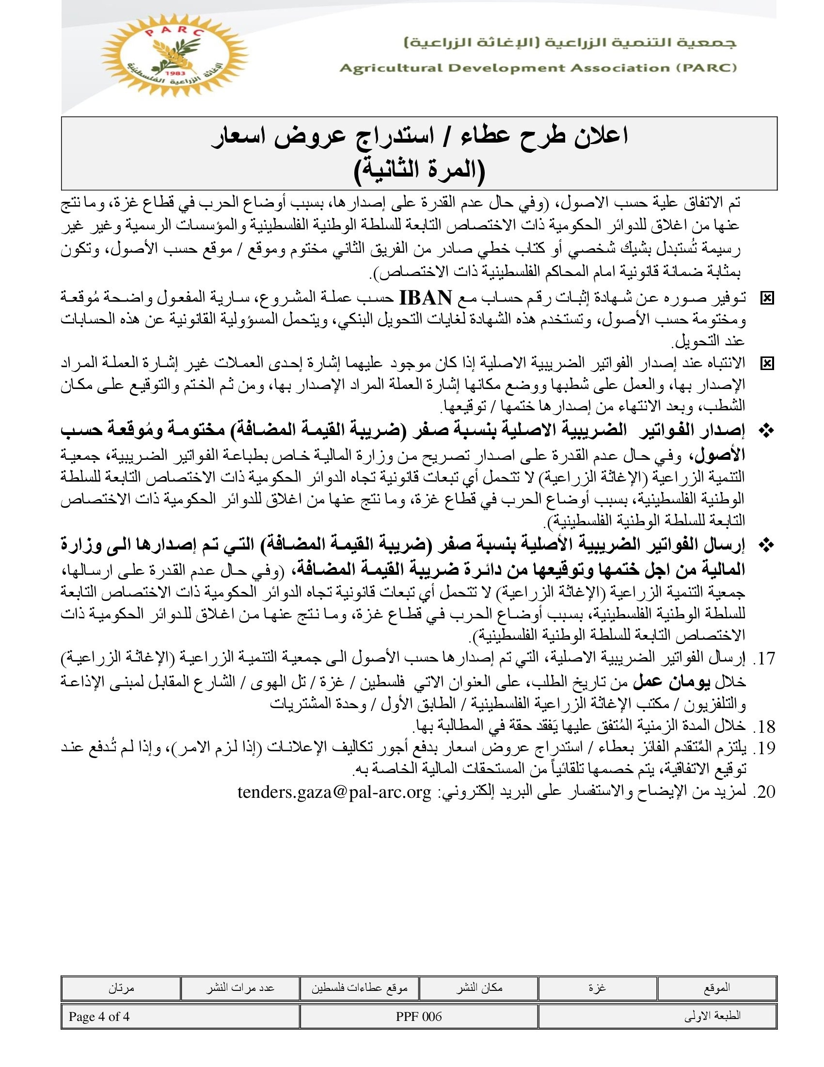 المؤسسة : جمعية التنمية الزراعية موقغ : https://pal-arc.org/tenders/ar بريد : info@pal-arc.org