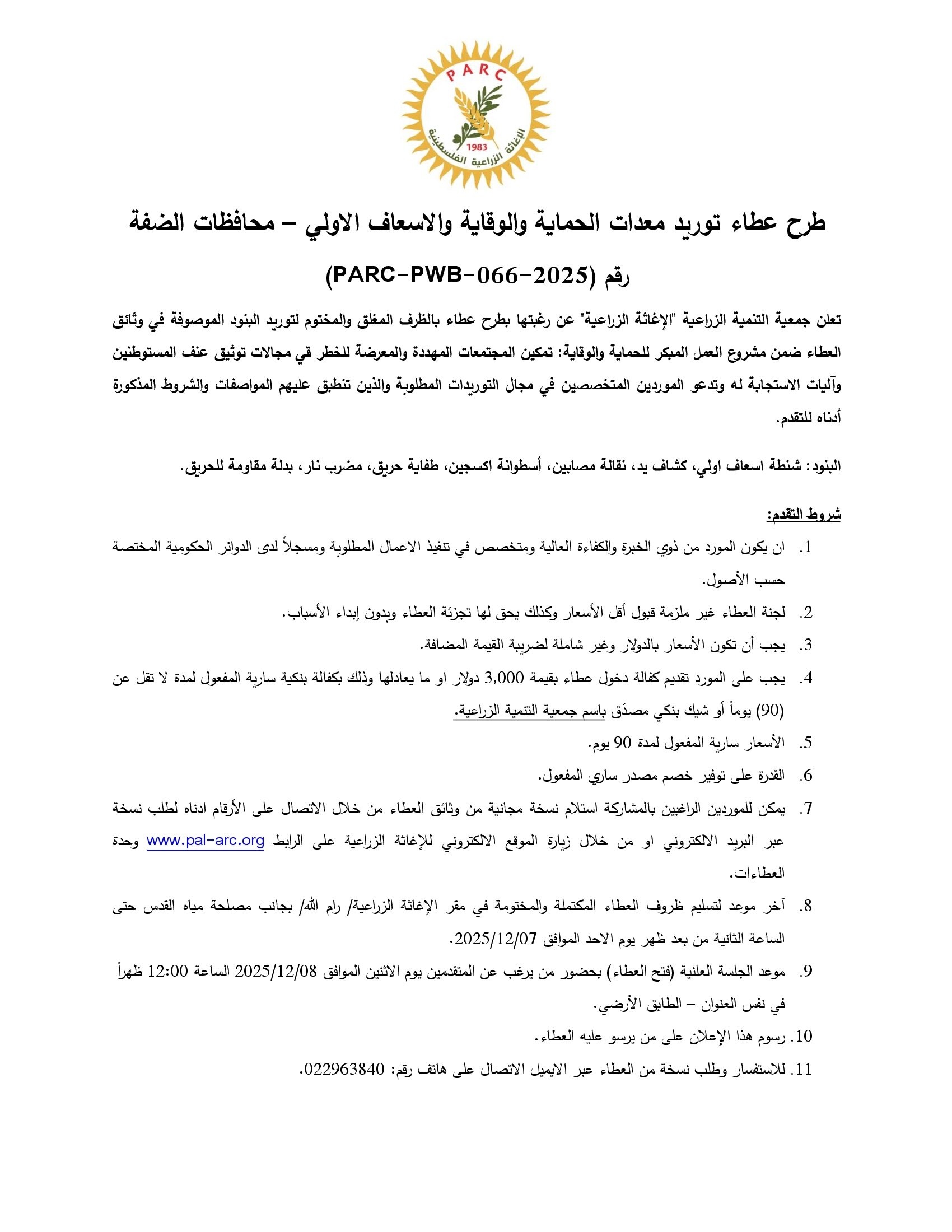 طرح عطاء توريد معدات الحماية والوقاية والاسعاف الاولي – محافظات الضفة