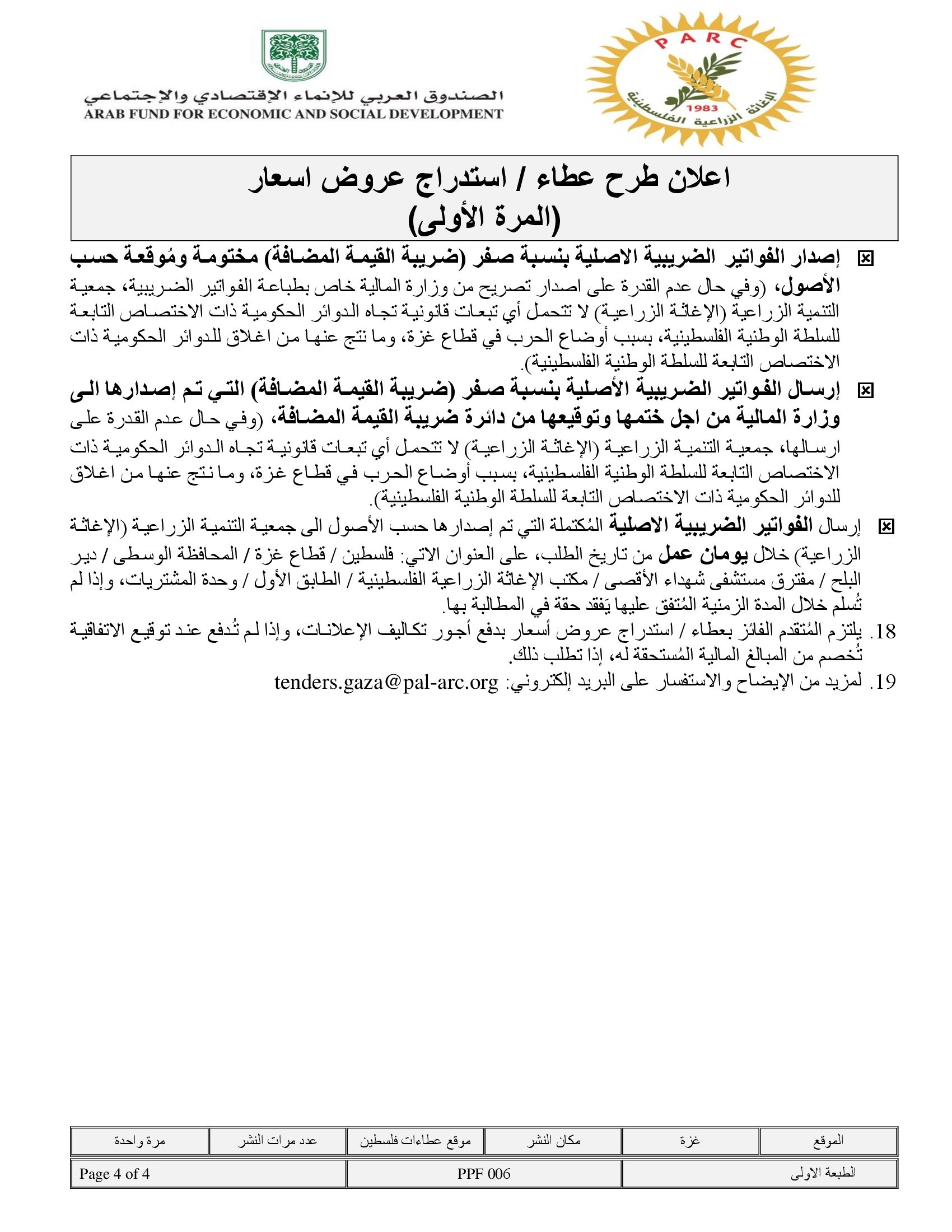 المؤسسة : جمعية التنمية الزراعية موقغ : https://pal-arc.org/tenders/ar بريد : info@pal-arc.org
