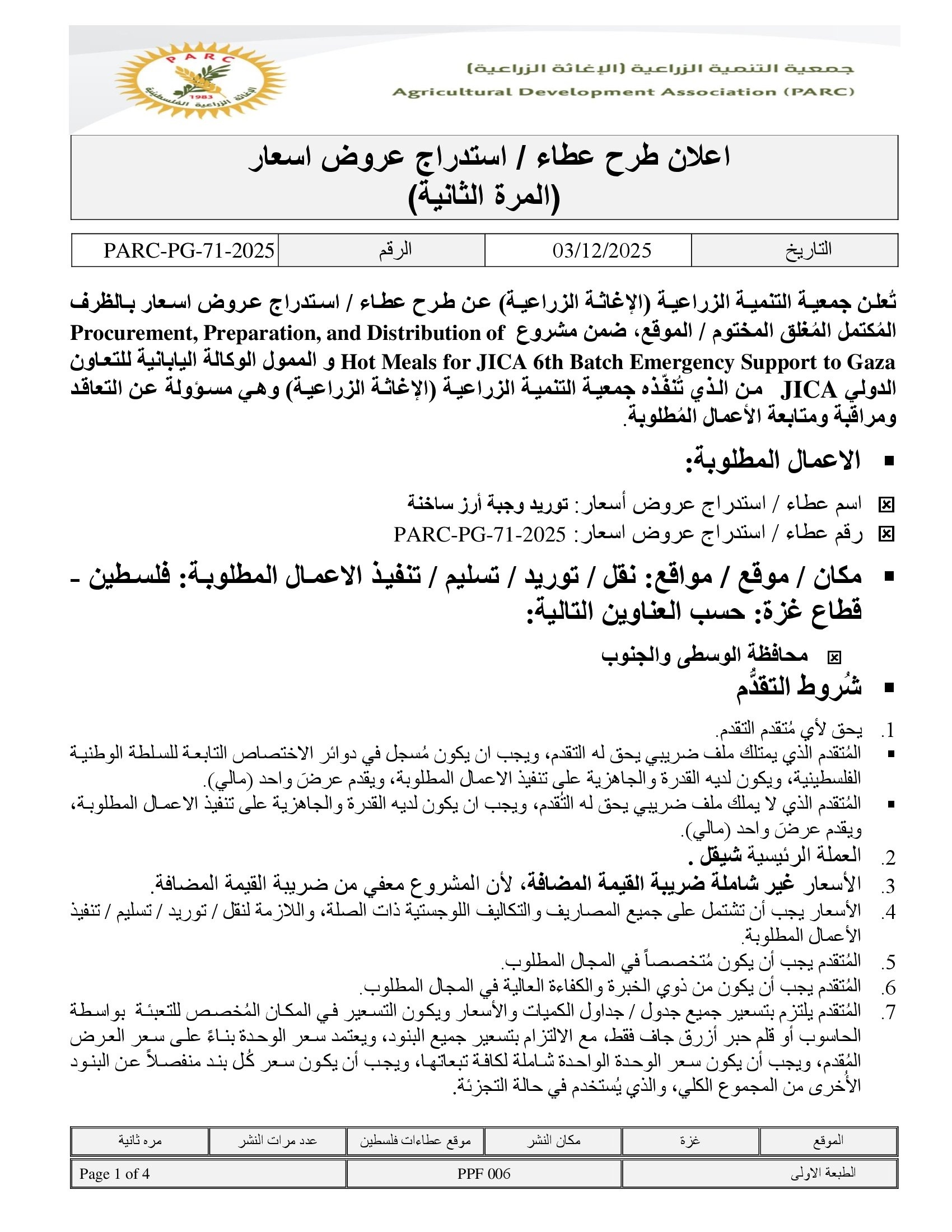طرح عطاء توريد معدات الحماية والوقاية والاسعاف الاولي – محافظات الضفة