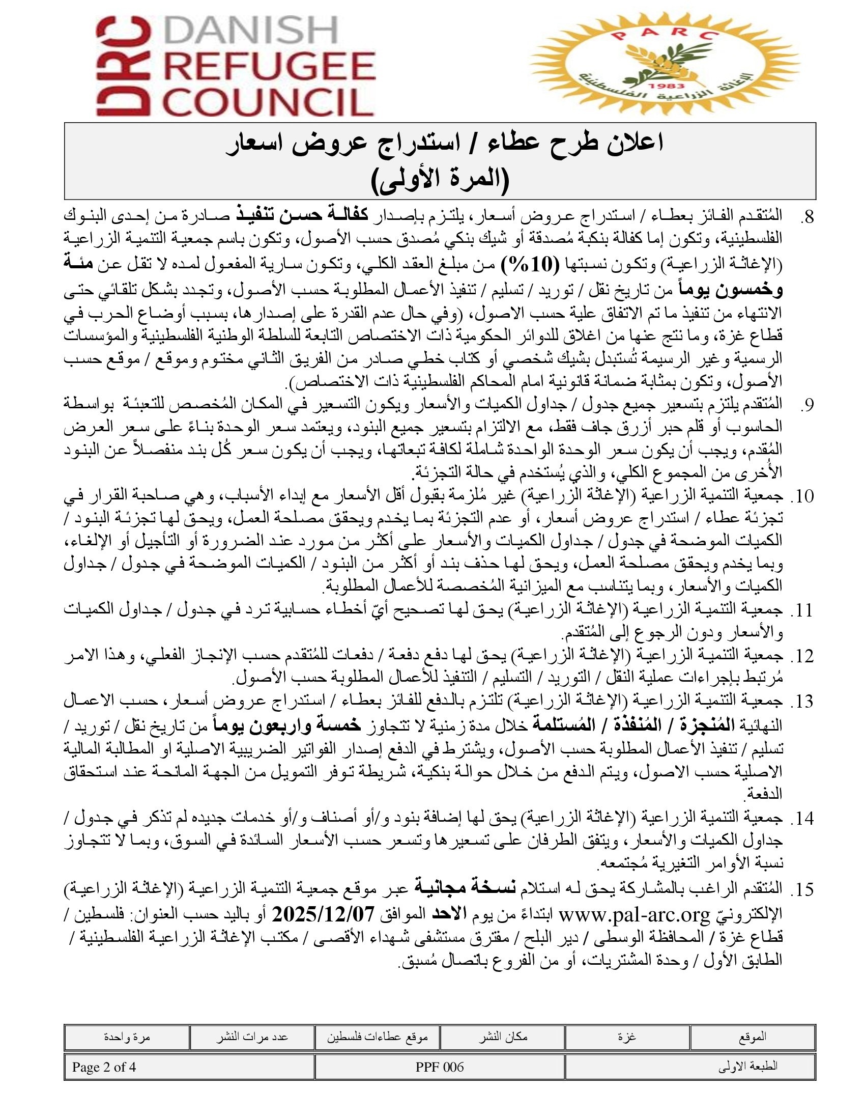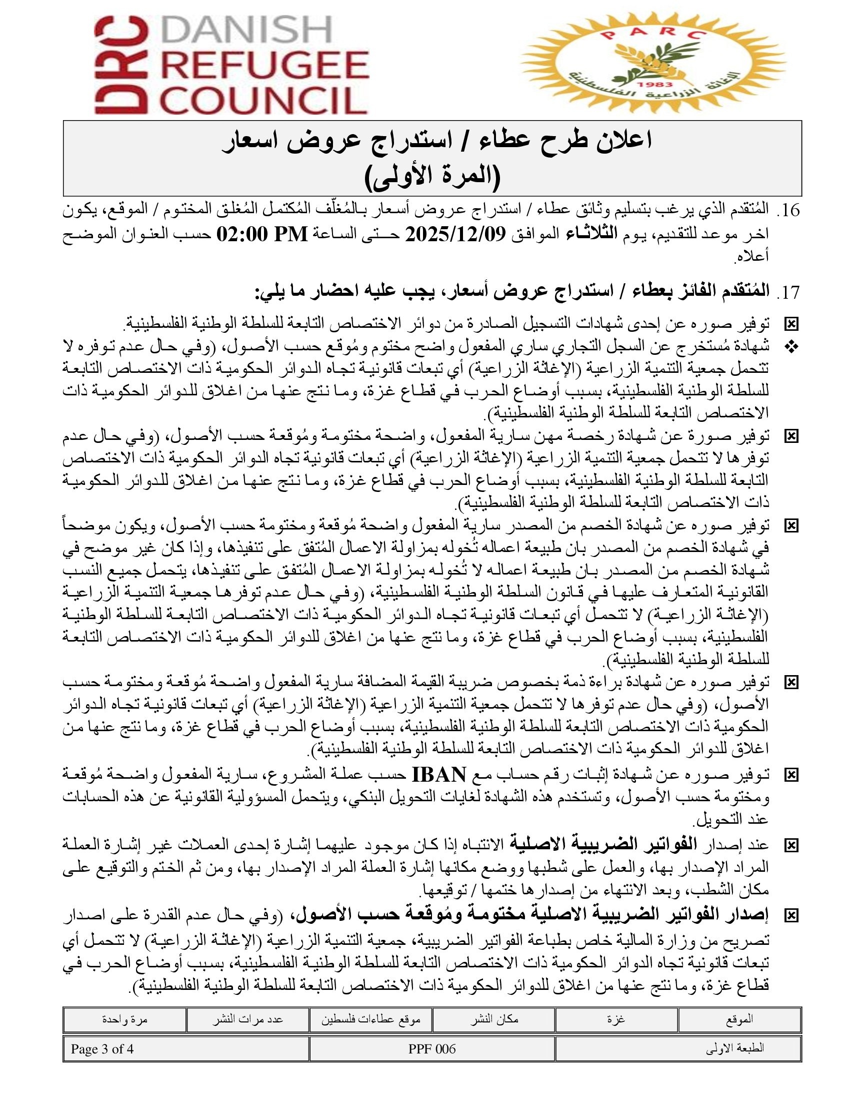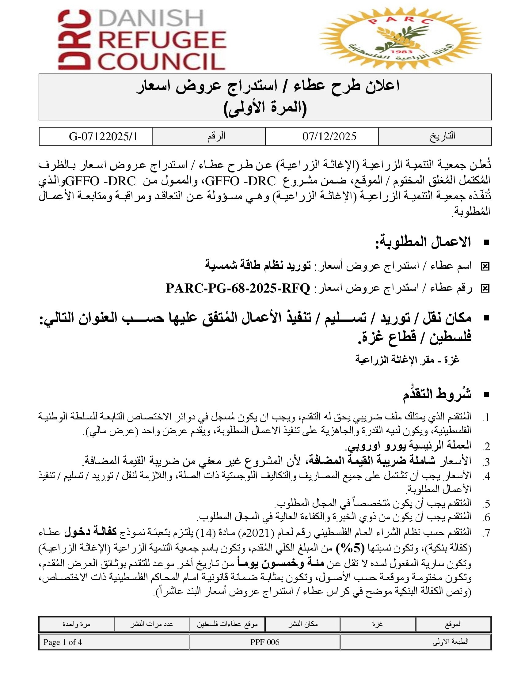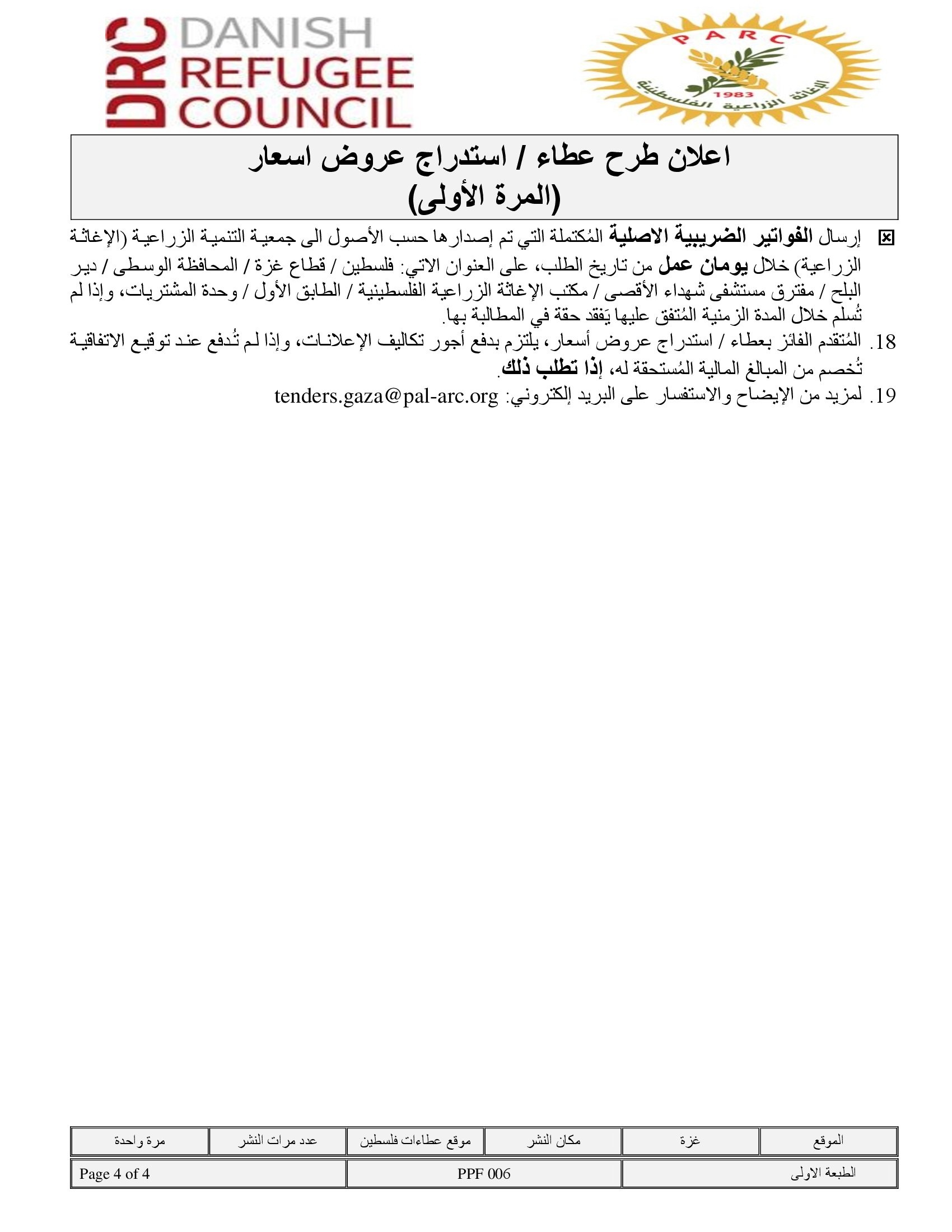 المؤسسة : جمعية التنمية الزراعية موقغ : https://pal-arc.org/tenders/ar بريد : info@pal-arc.org