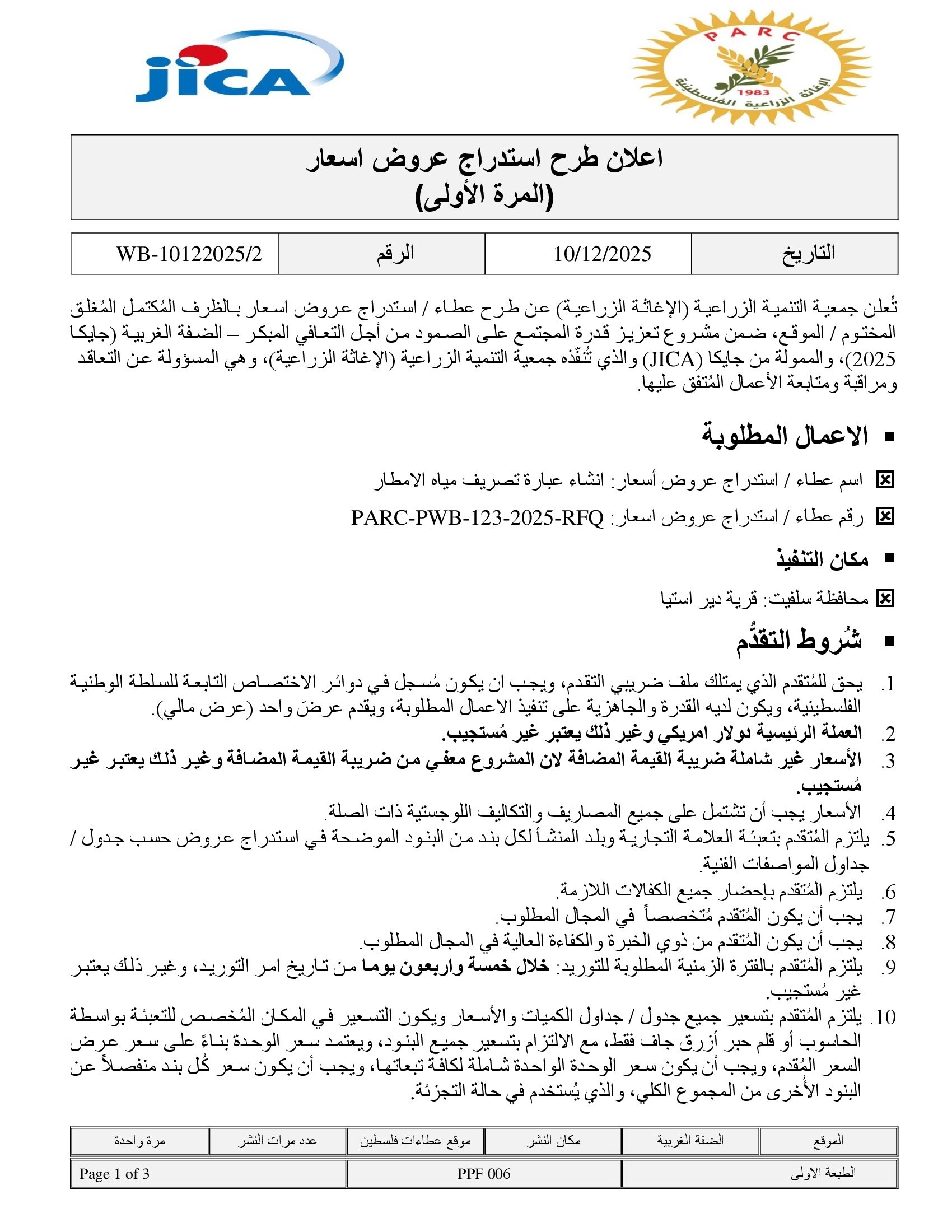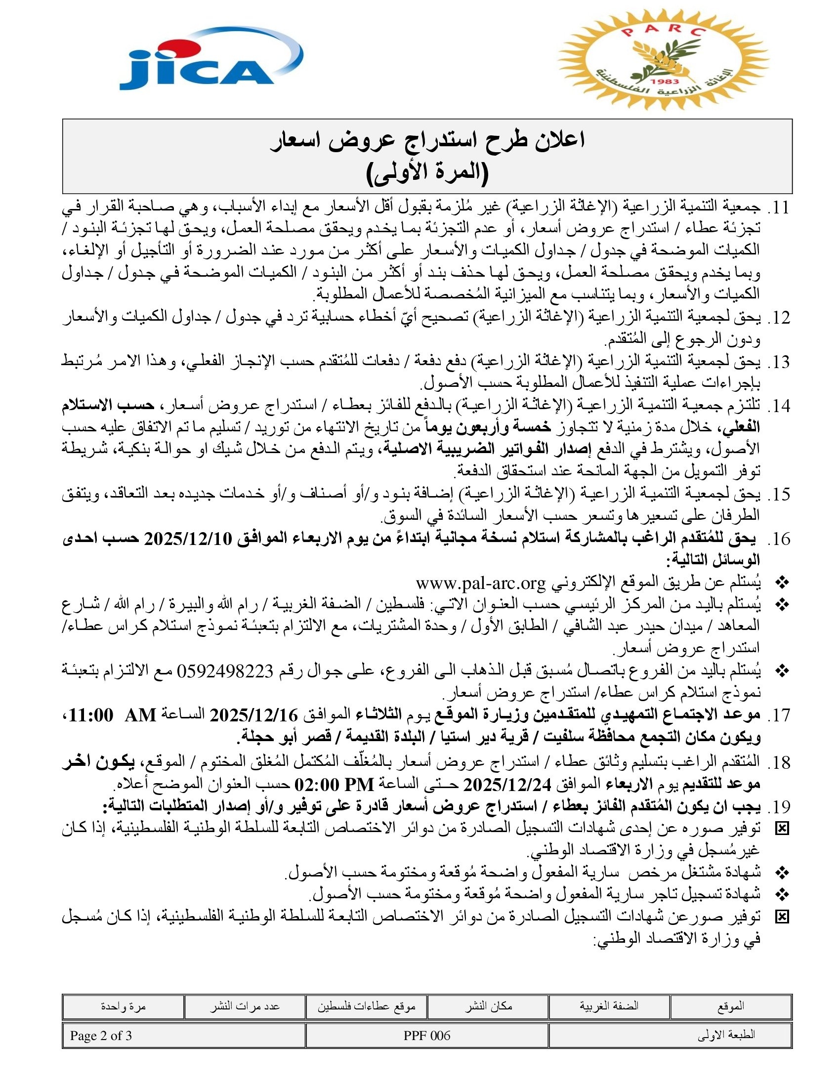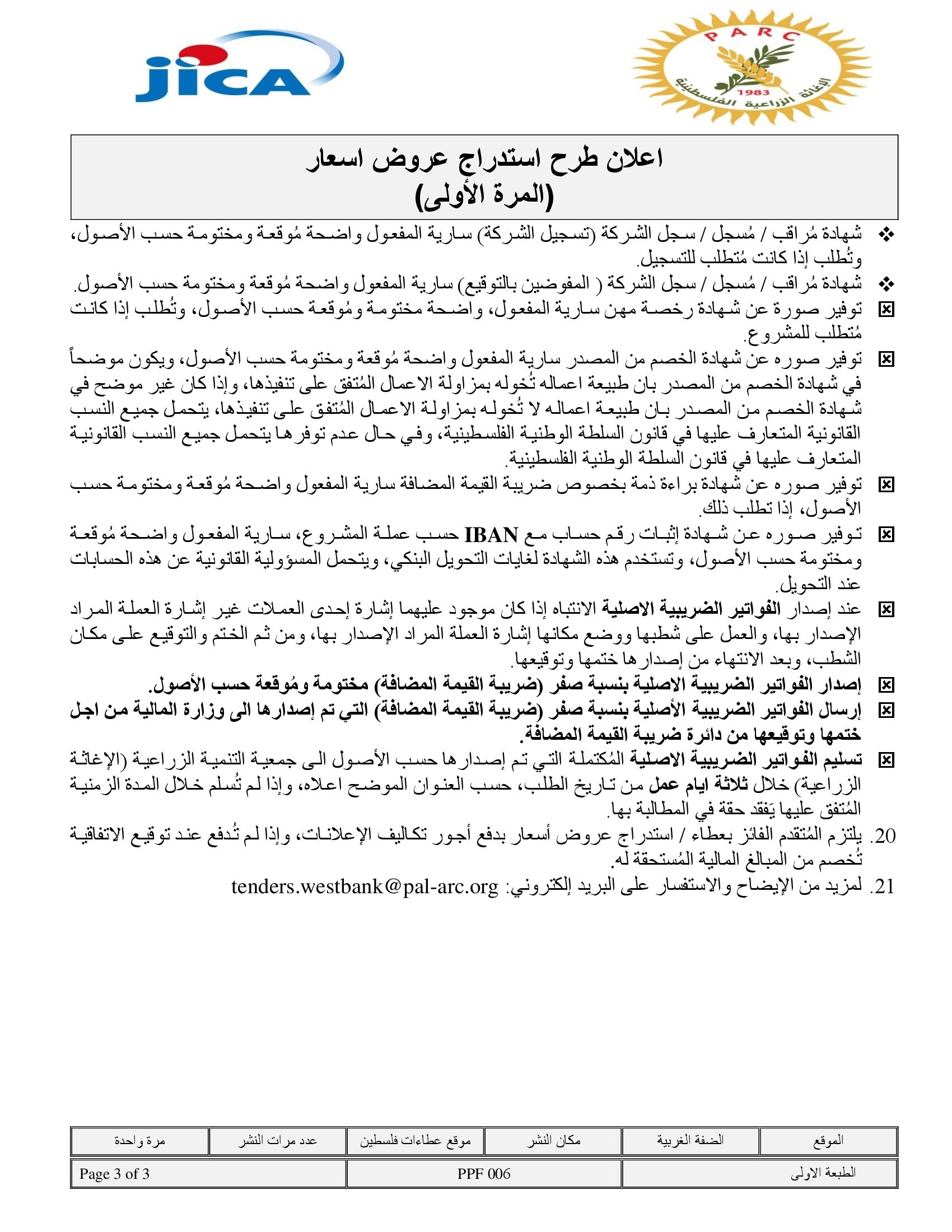 المؤسسة : جمعية التنمية الزراعية موقغ : https://pal-arc.org/tenders/ar بريد : info@pal-arc.org