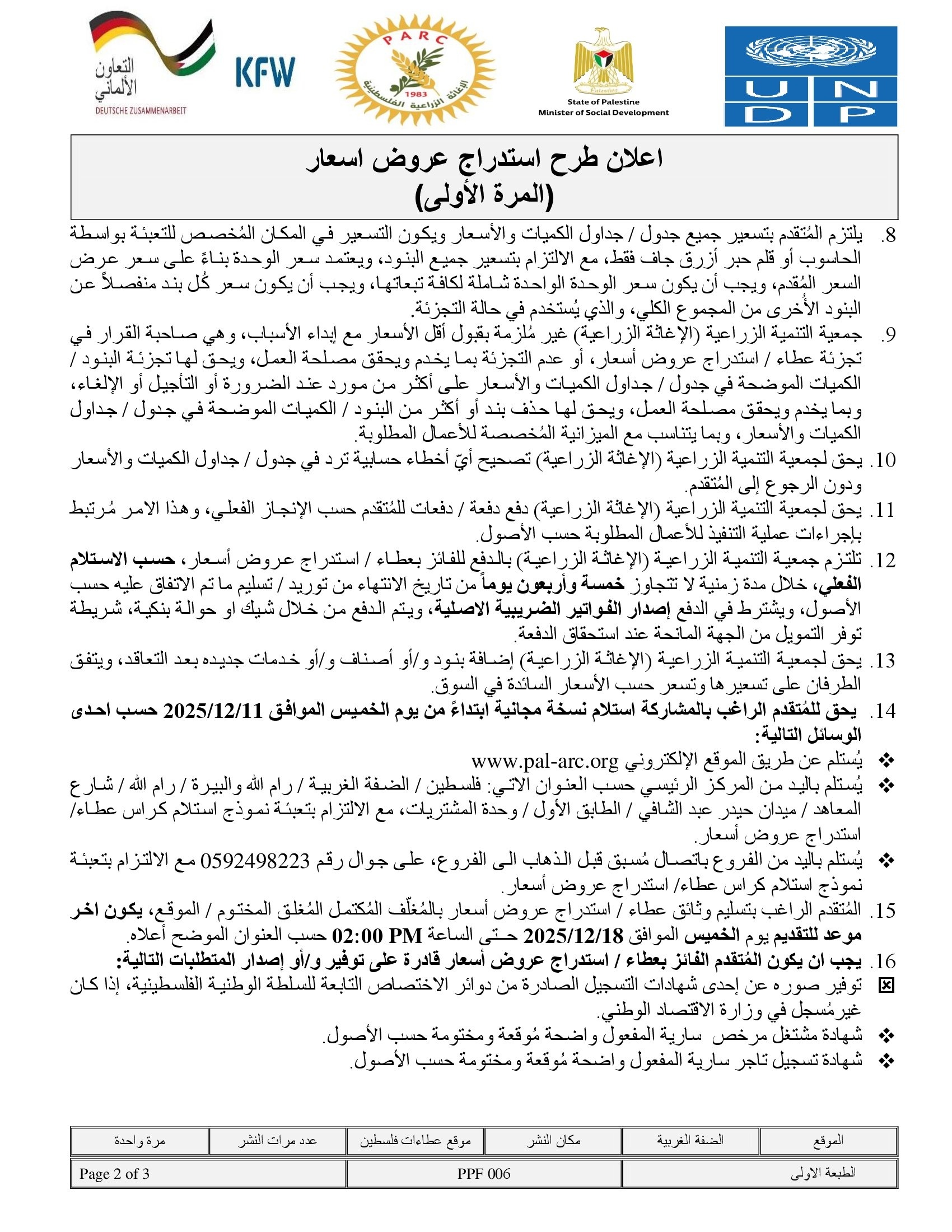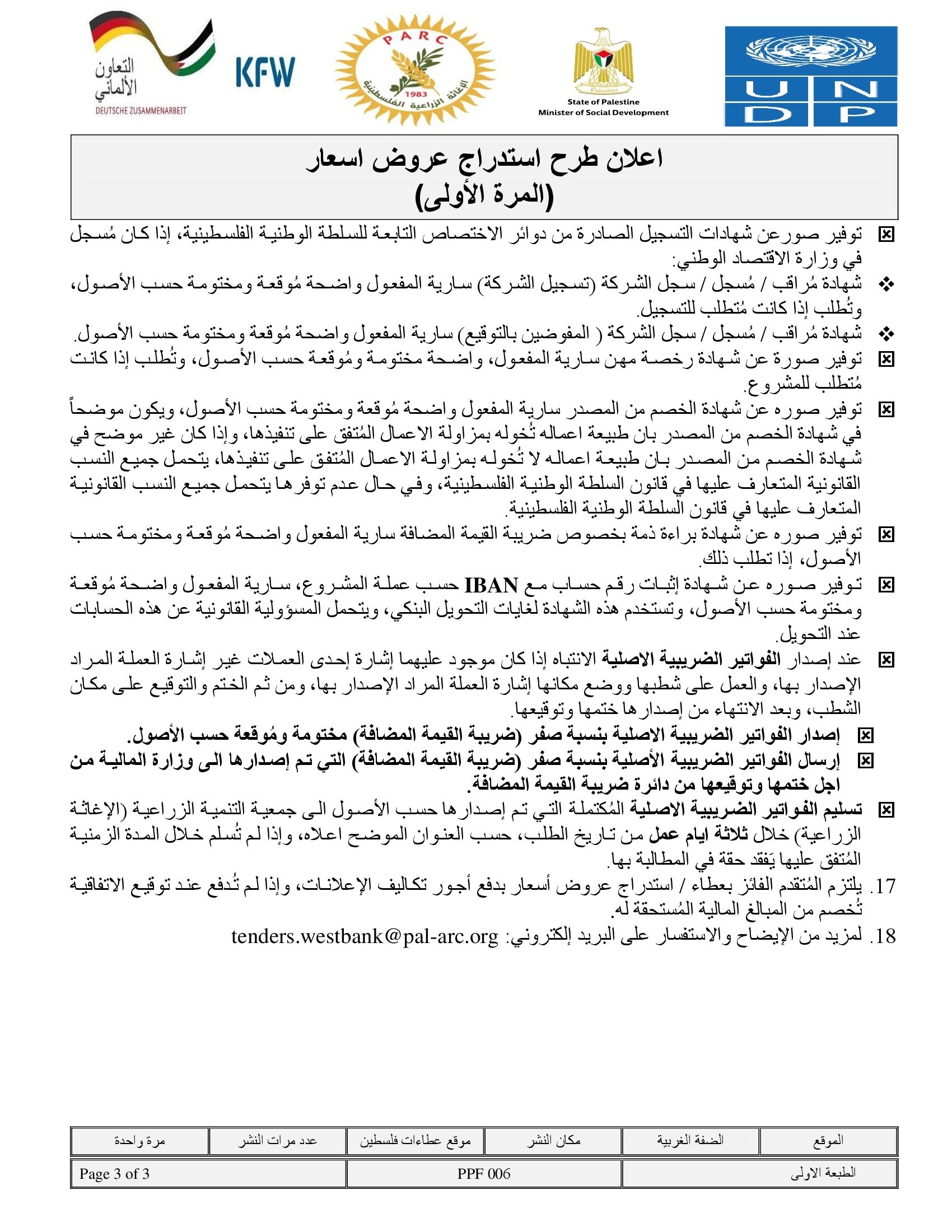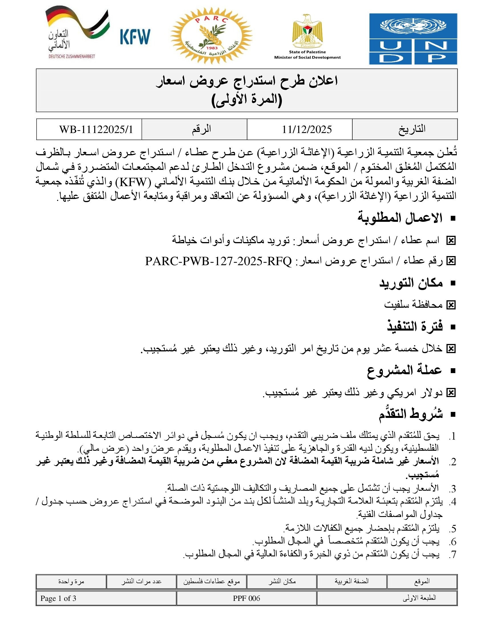 المؤسسة : جمعية التنمية الزراعية موقغ : https://pal-arc.org/tenders/ar بريد : info@pal-arc.org