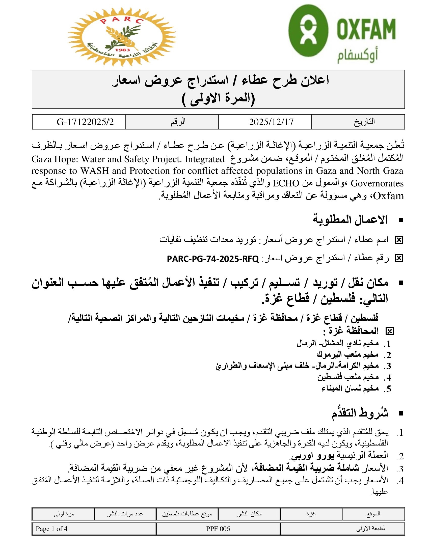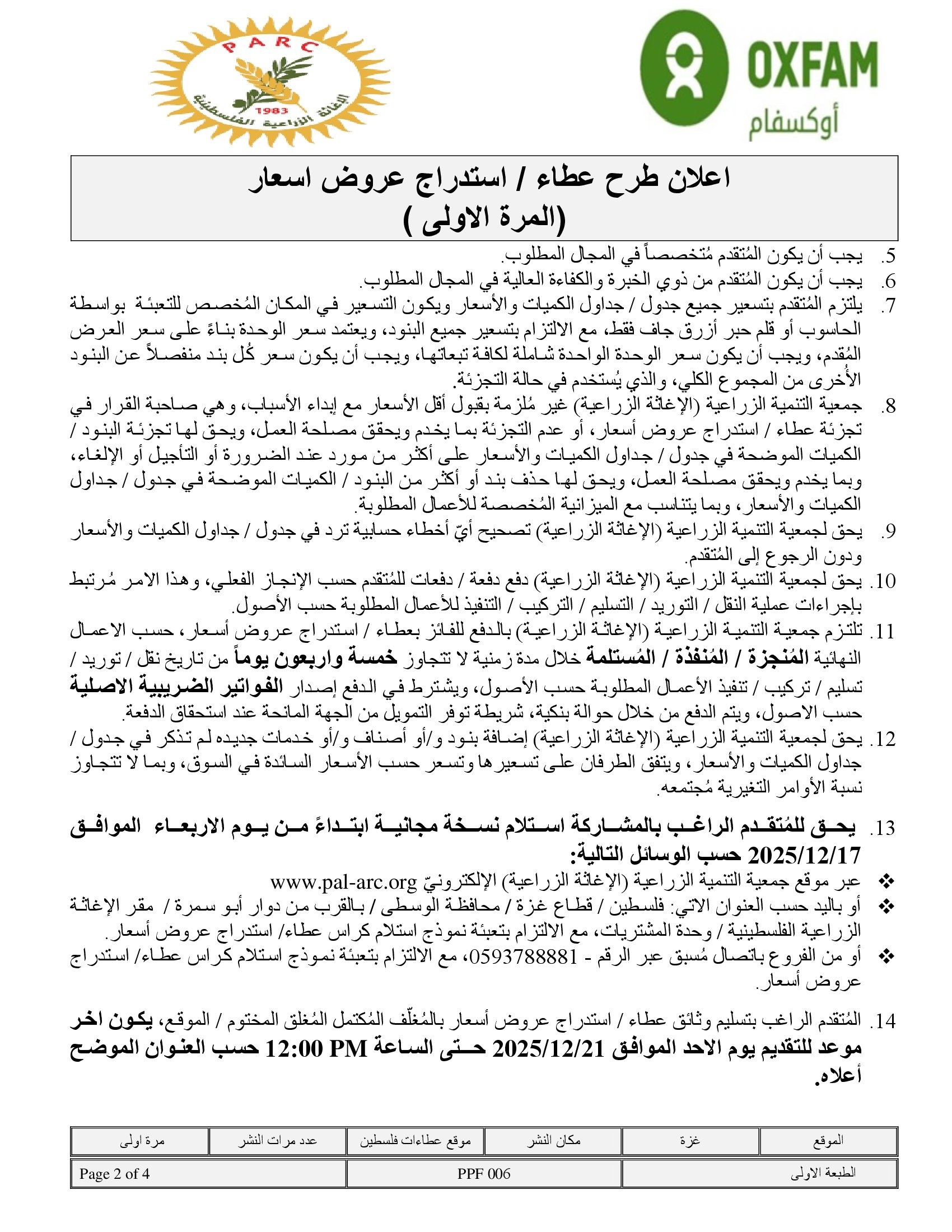 المؤسسة : جمعية التنمية الزراعية موقغ : https://pal-arc.org/tenders/ar بريد : info@pal-arc.org