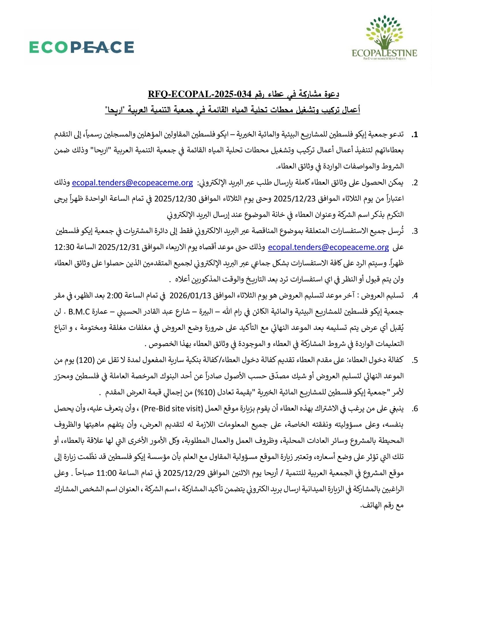 أعمال تركيب وتشغيل محطات تحلية المياه القائمة في جمعية التنمية العربية "اريحا"