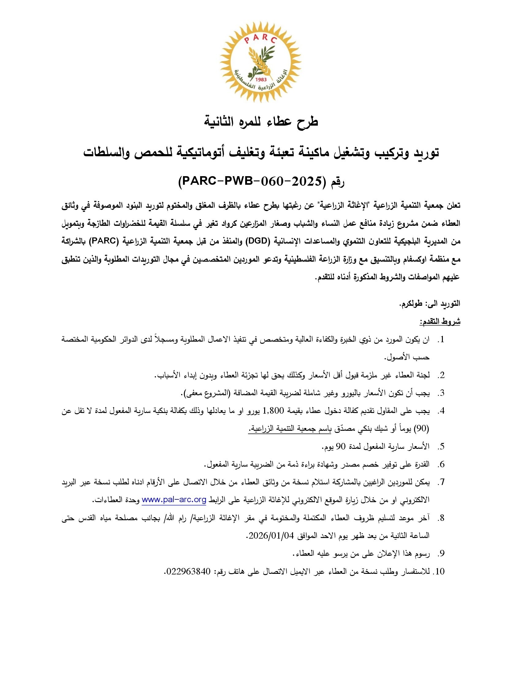 المؤسسة : جمعية التنمية الزراعية موقغ : https://pal-arc.org/tenders/ar بريد : info@pal-arc.org