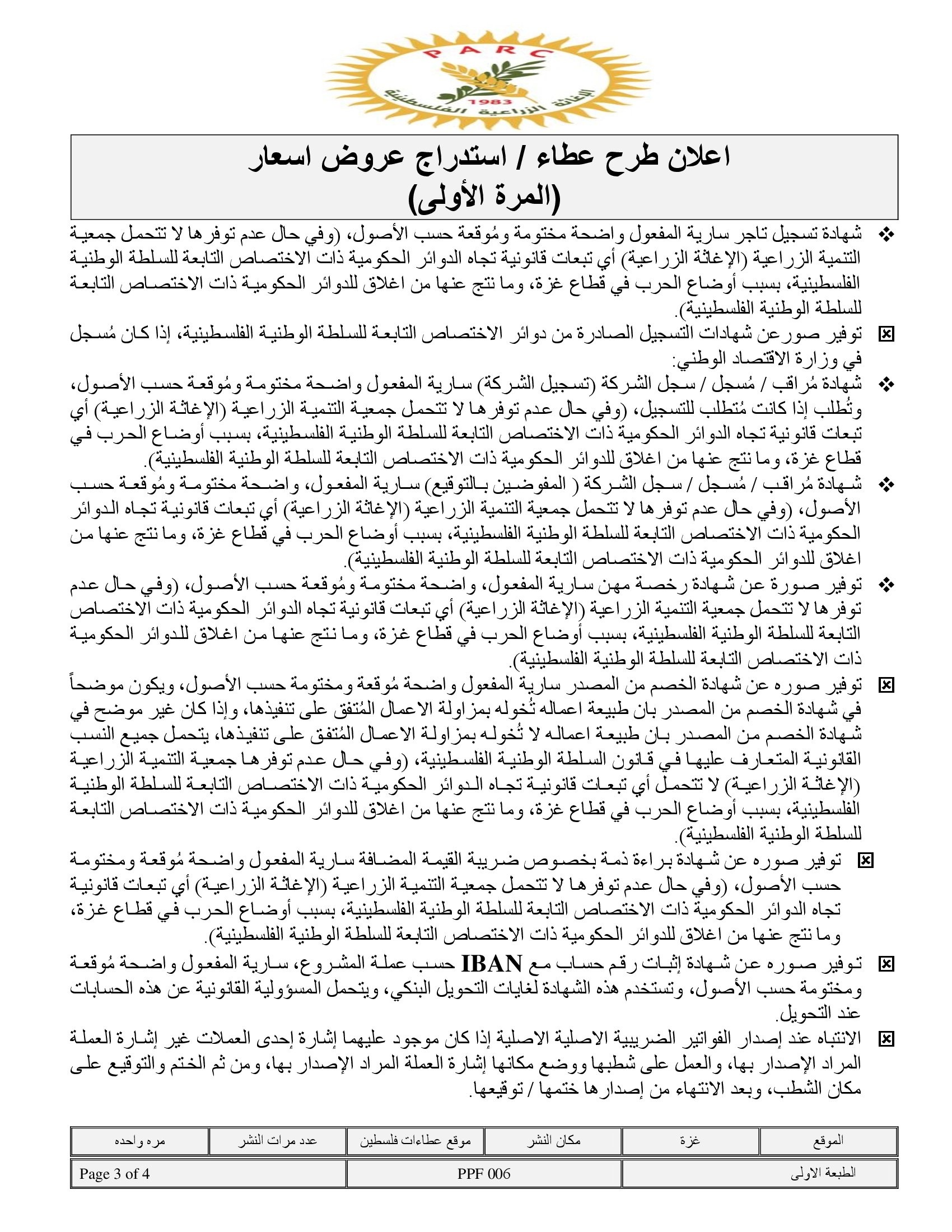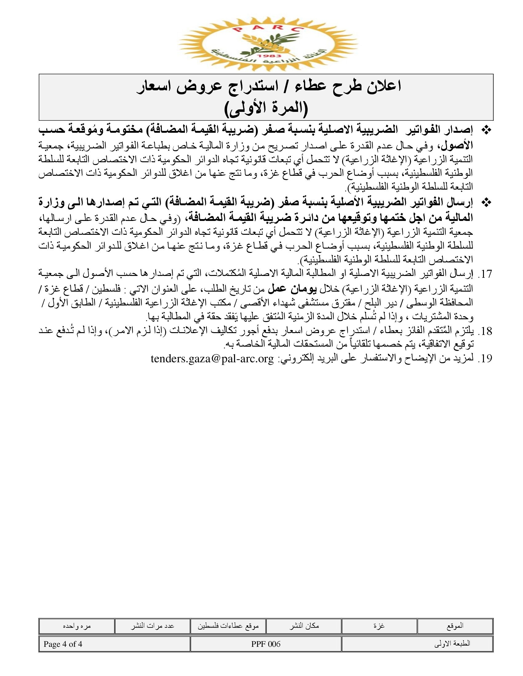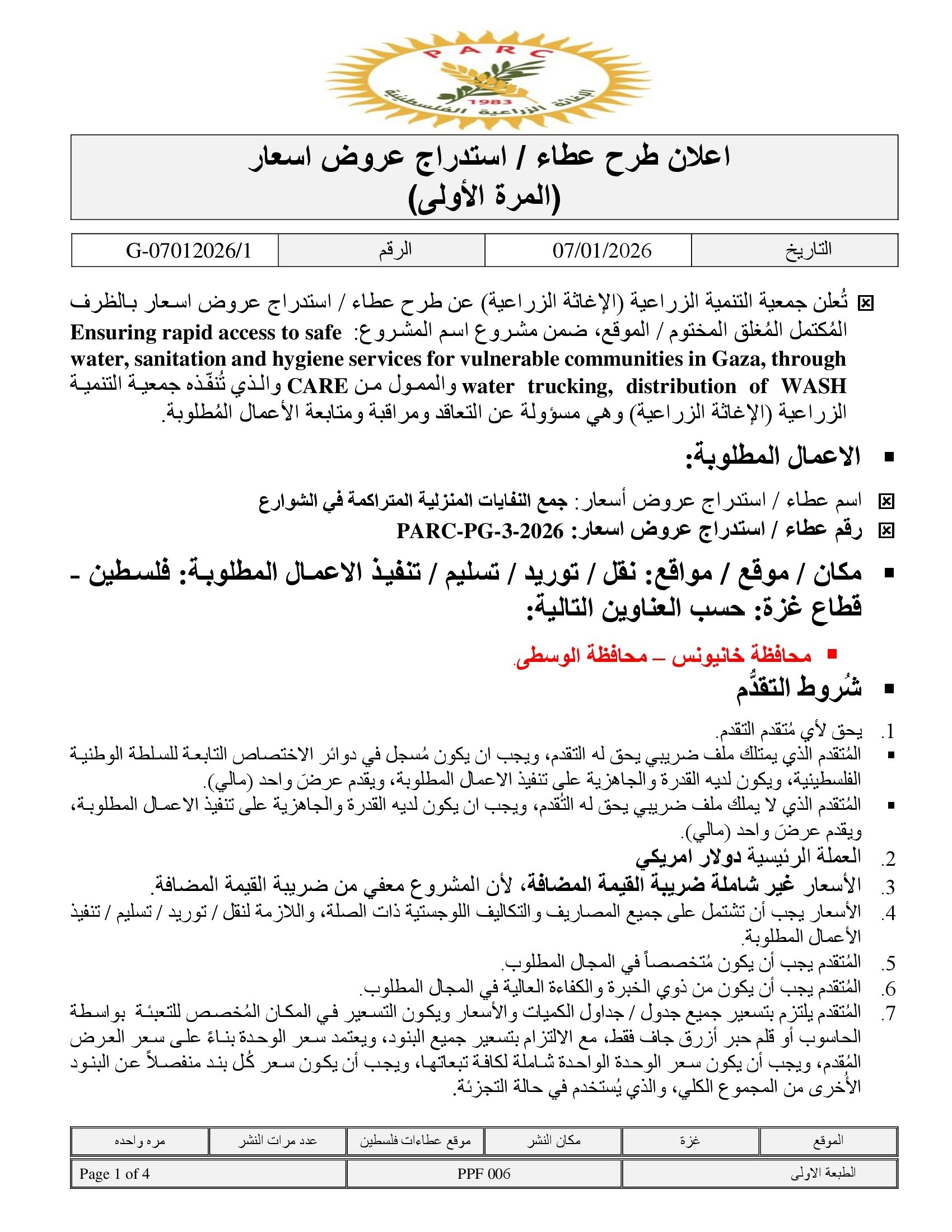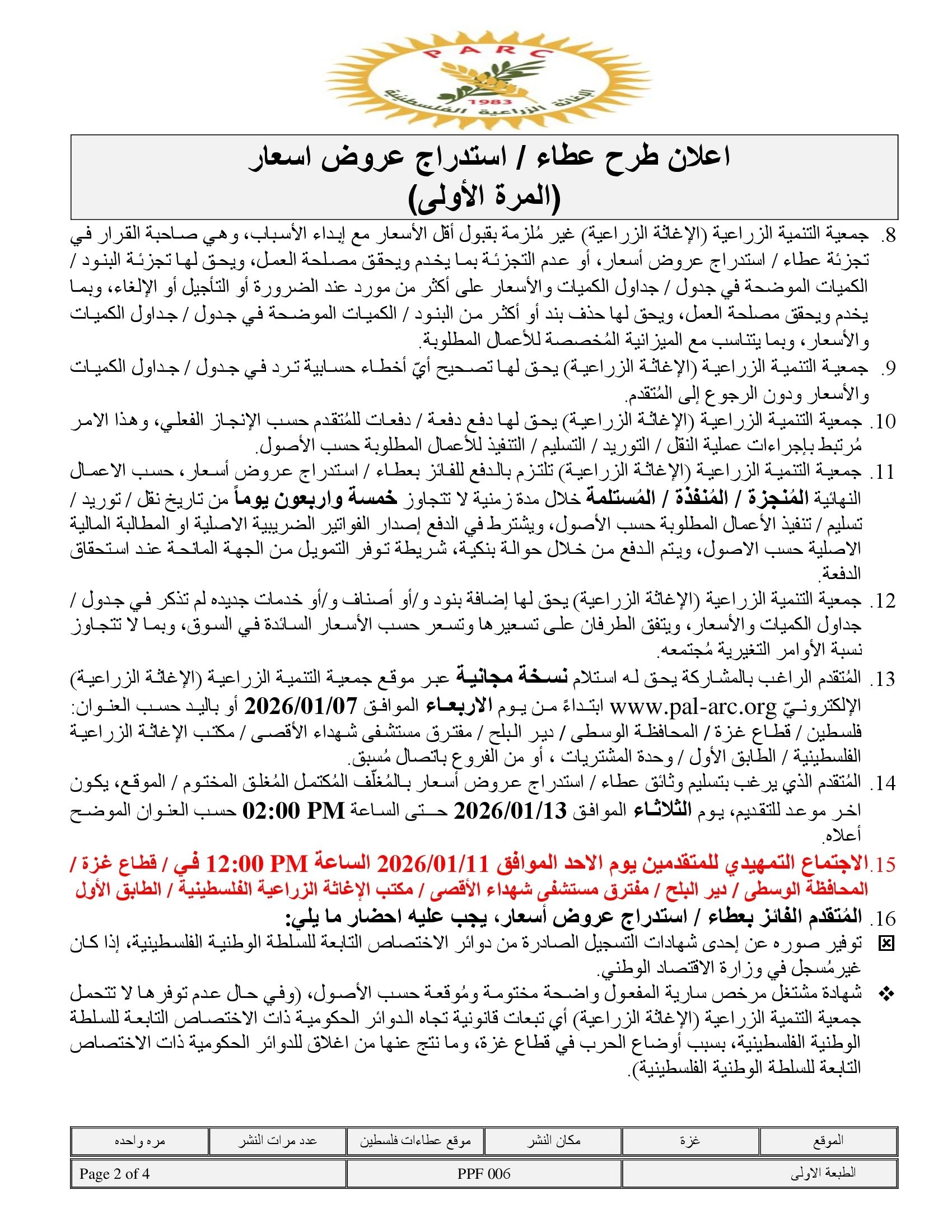 المؤسسة : جمعية التنمية الزراعية موقغ : https://pal-arc.org/tenders/ar بريد : info@pal-arc.org