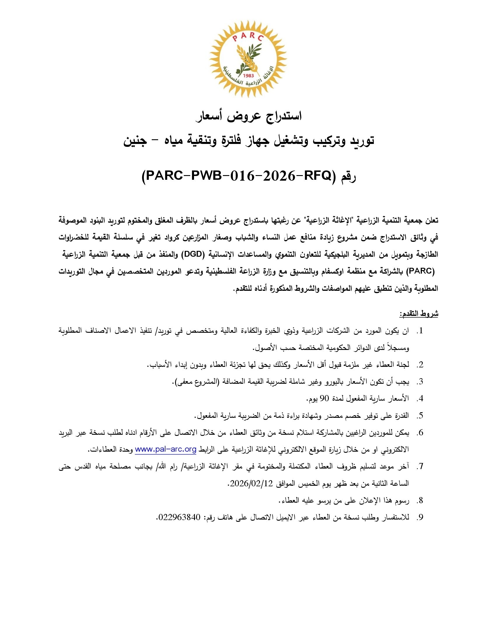 المؤسسة : جمعية التنمية الزراعية موقغ : الموقع الالكتروني بريد : info@pal-arc.org