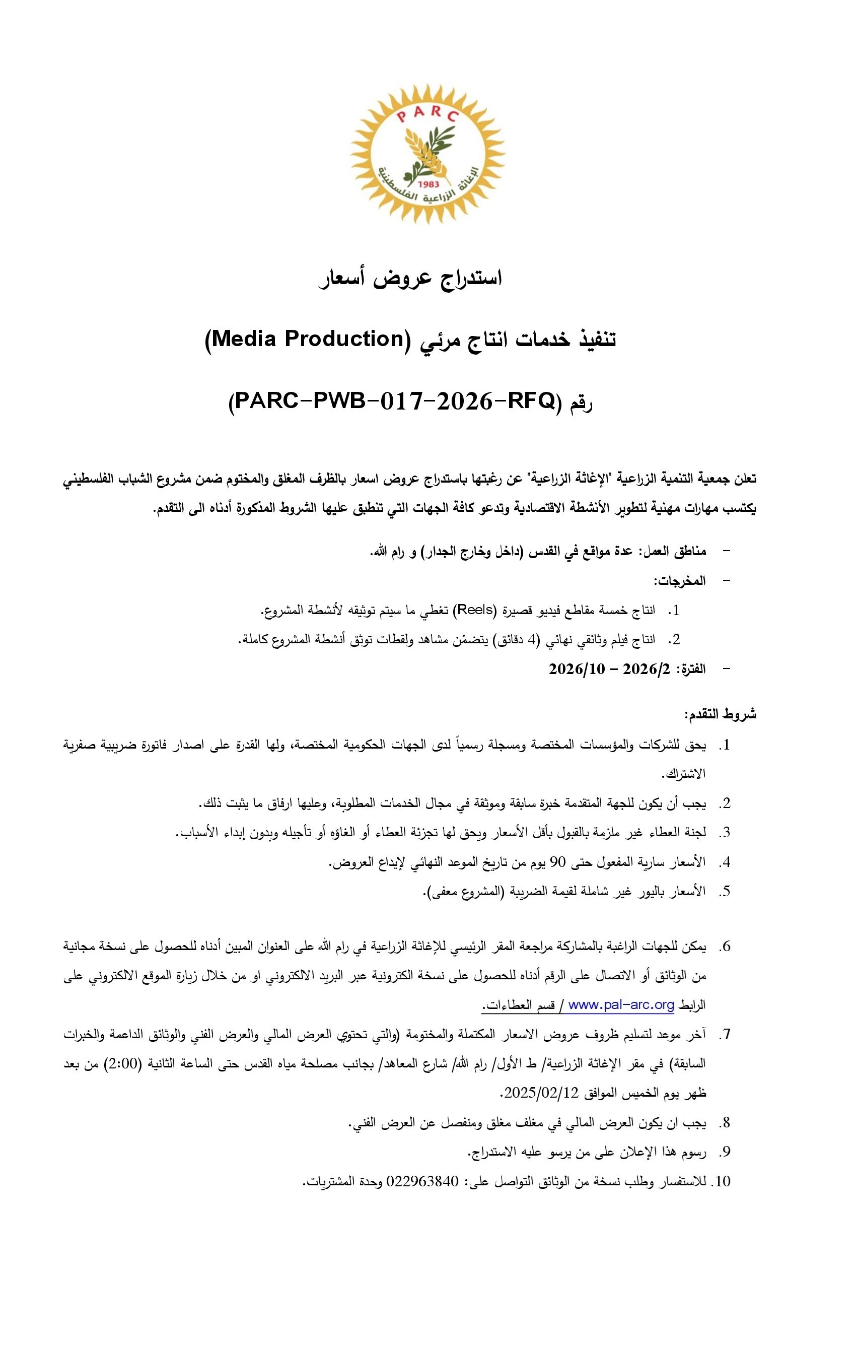 المؤسسة : جمعية التنمية الزراعية موقغ : الموقع الالكتروني بريد : info@pal-arc.org