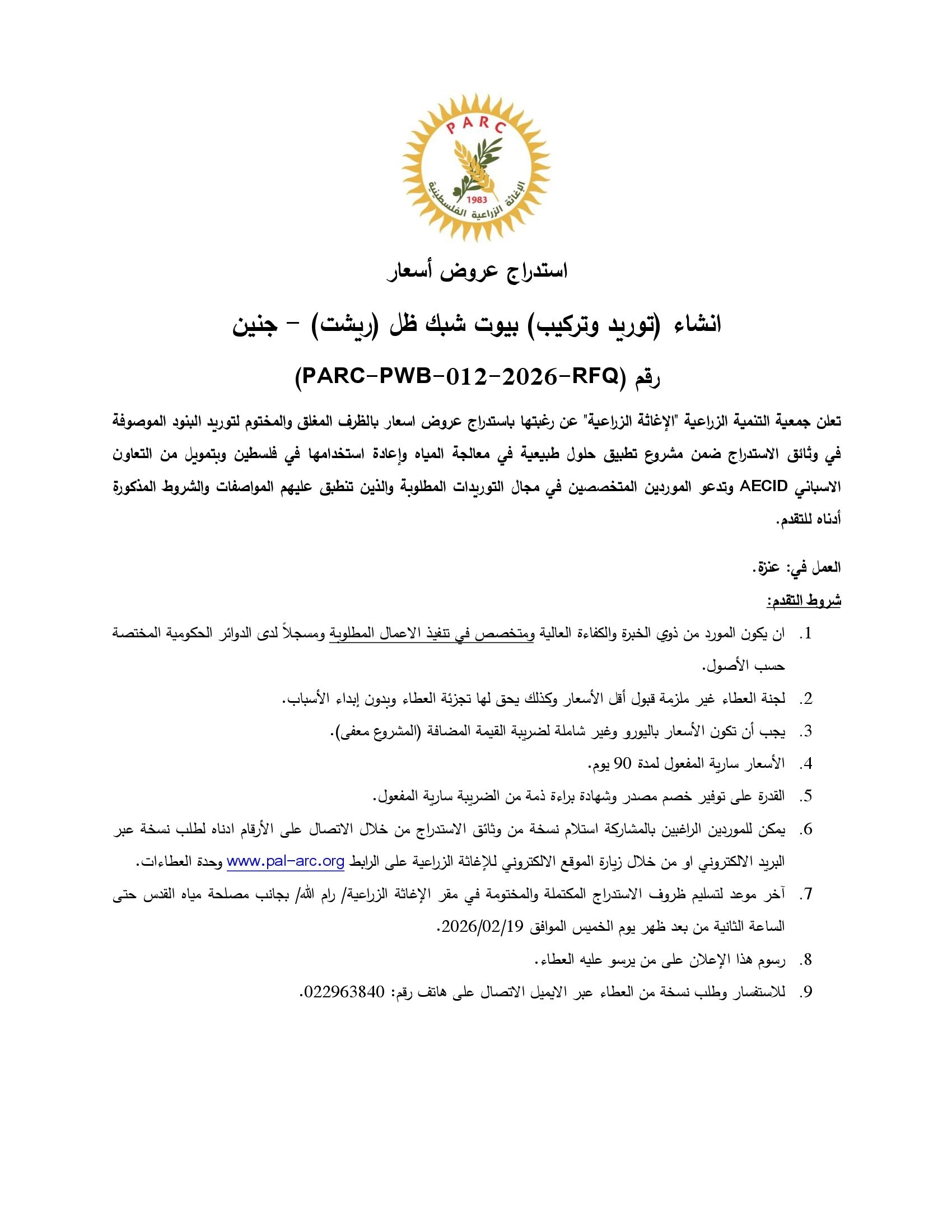 توريد وتركيب مظلات انتظار وألعاب وتوريد حاويات معدنية ومواد تأهيل حديقة - جنين