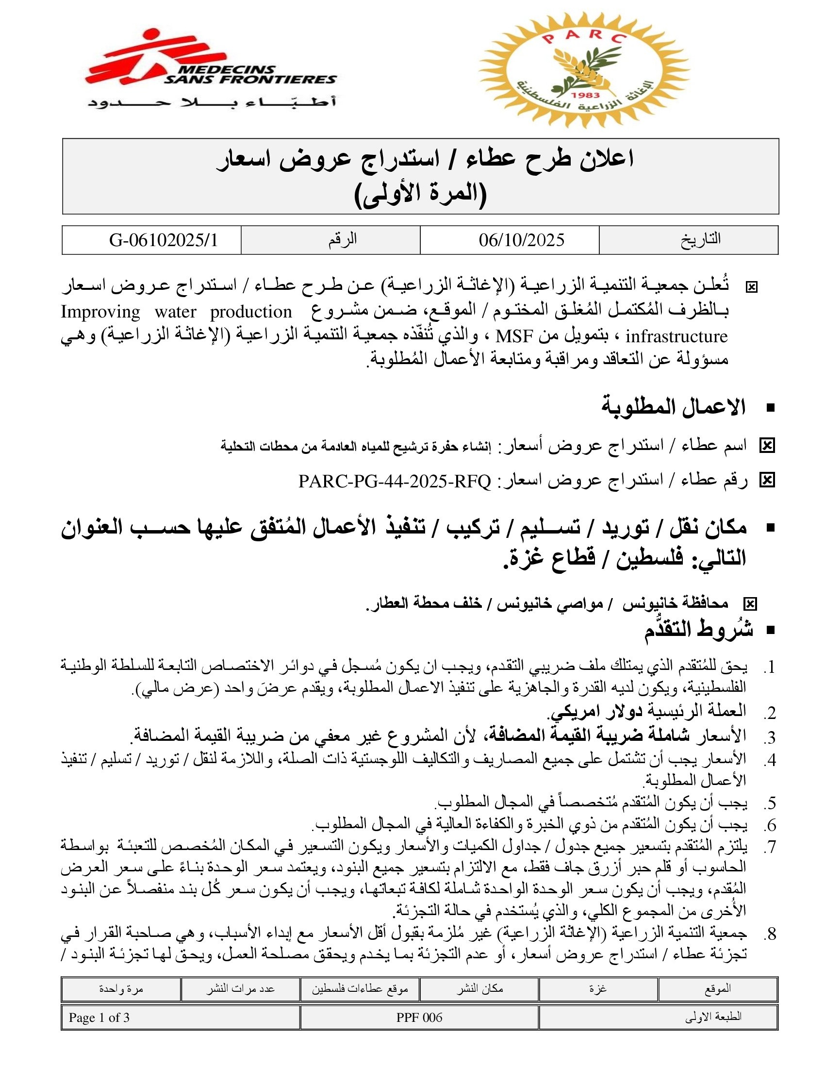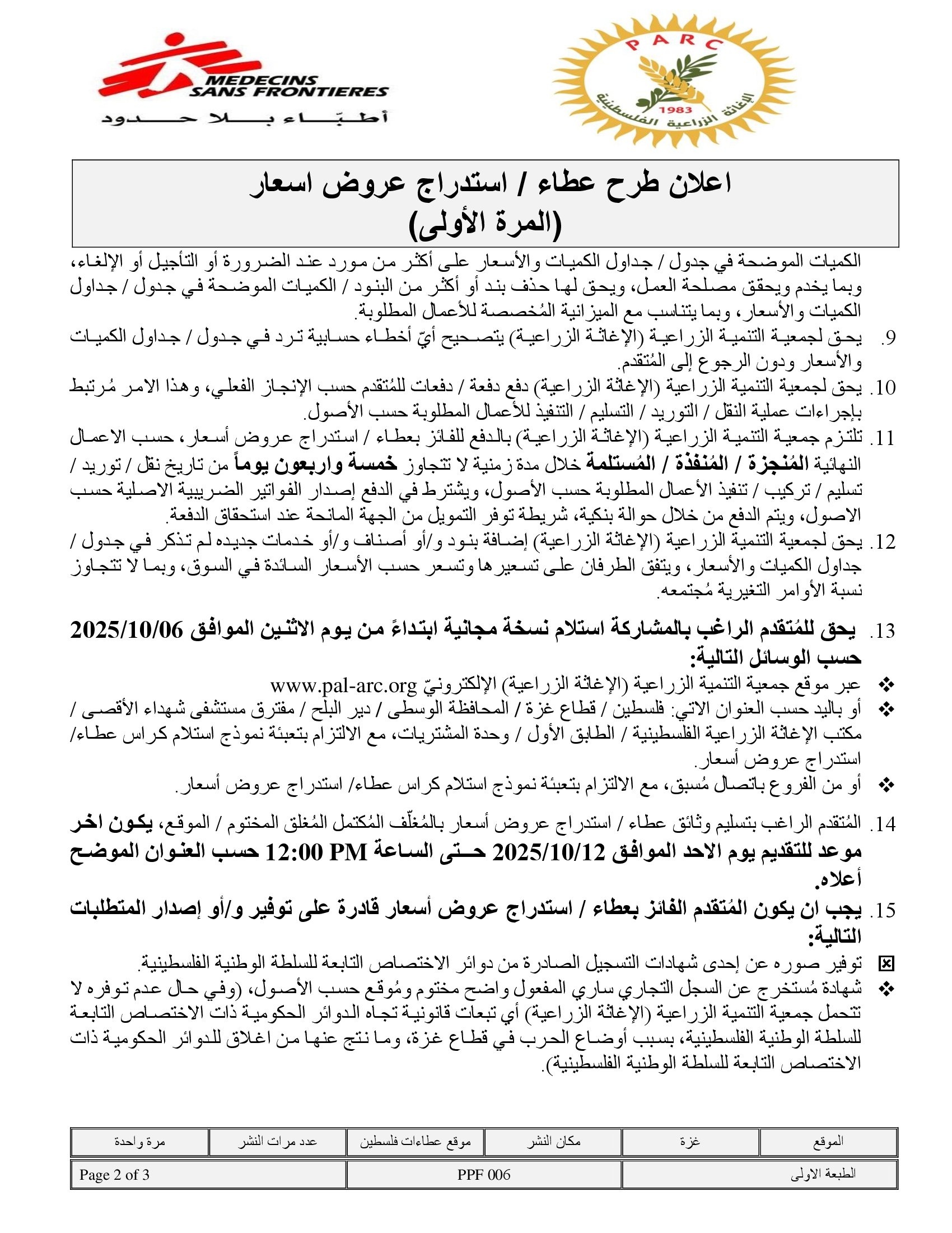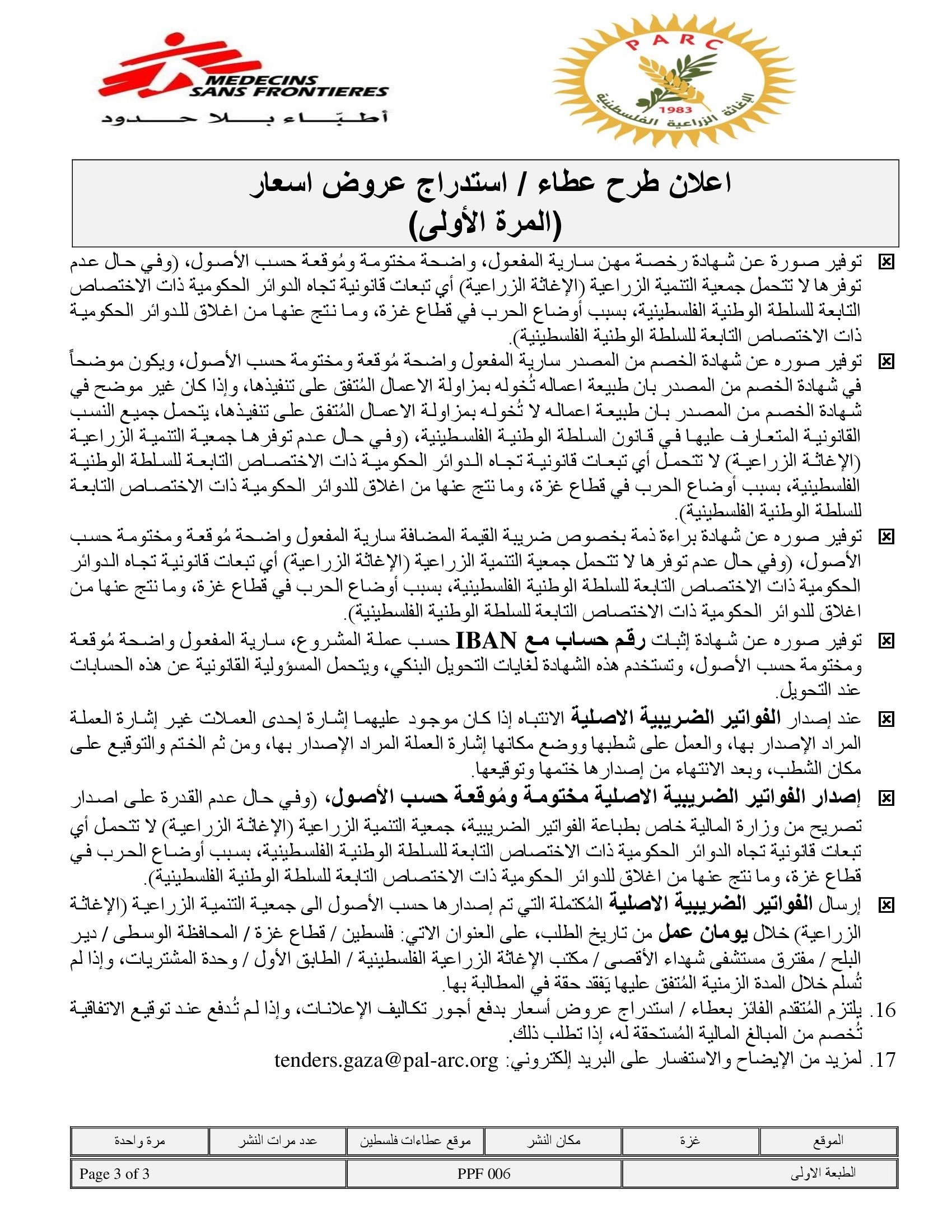 المؤسسة : جمعية التنمية الزراعية موقغ : https://pal-arc.org/tenders/ar بريد : info@pal-arc.org
