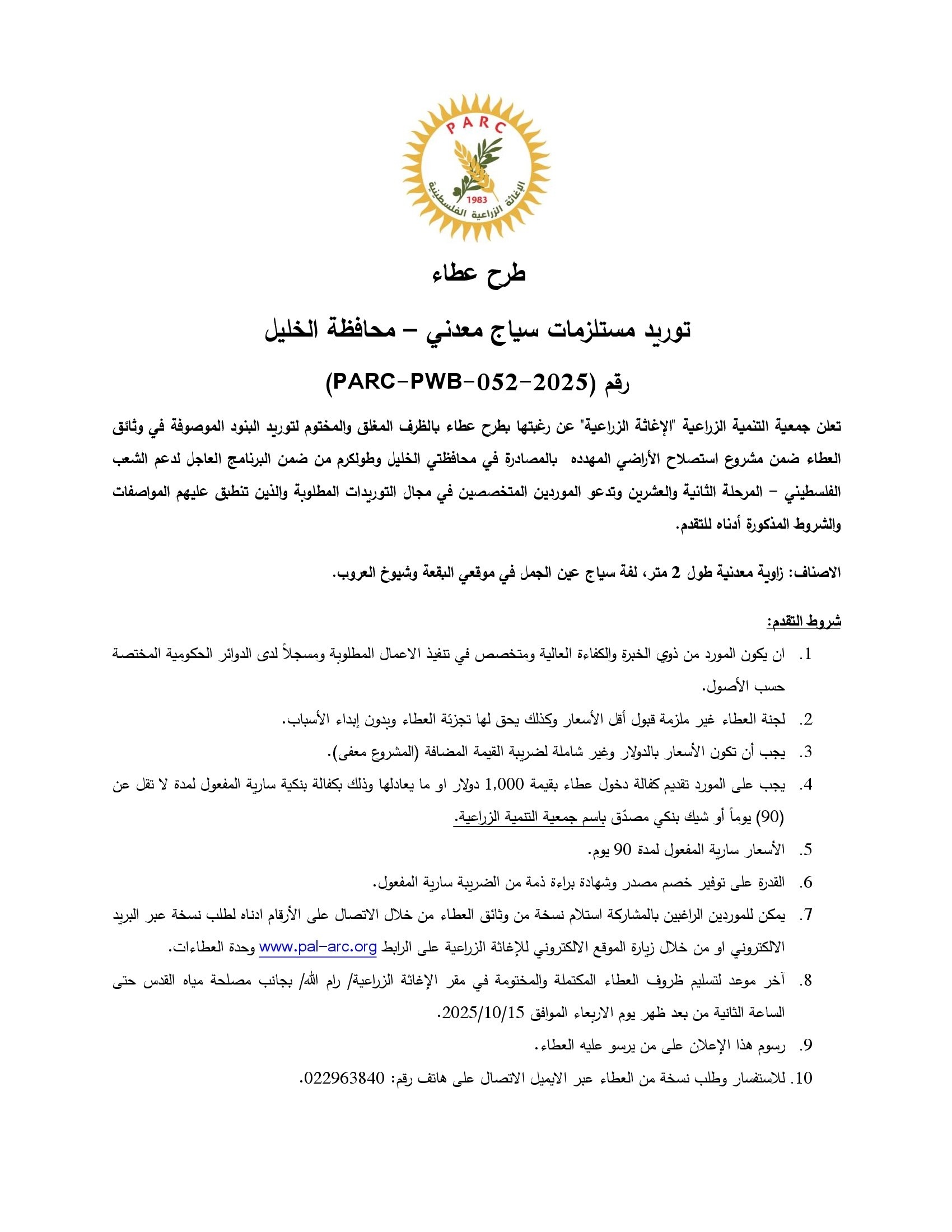 المؤسسة : جمعية التنمية الزراعية موقغ : https://pal-arc.org/tenders/ar بريد : info@pal-arc.org