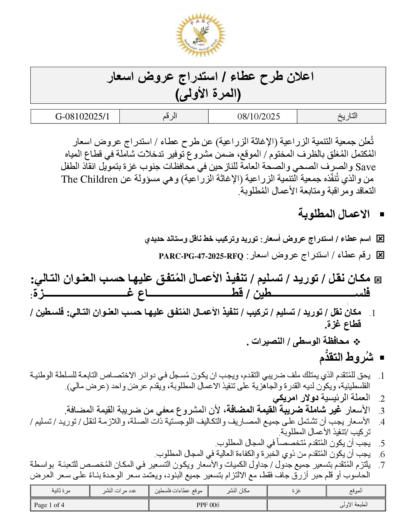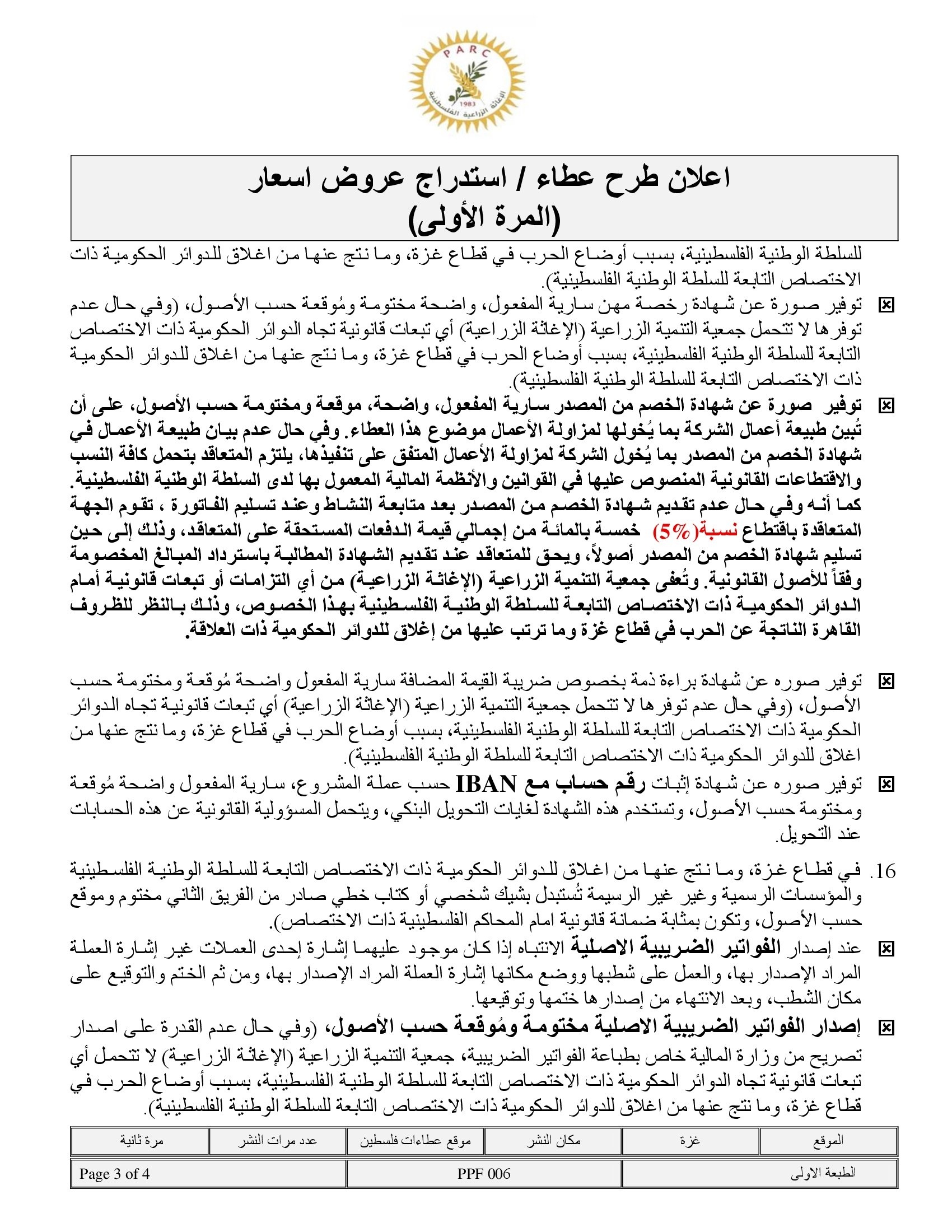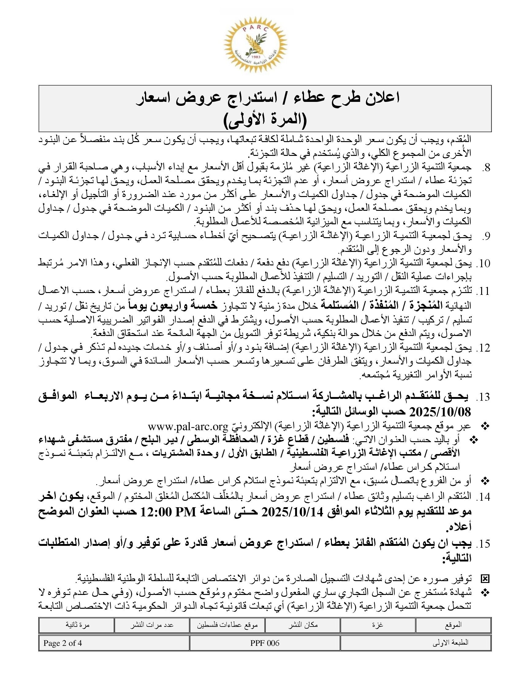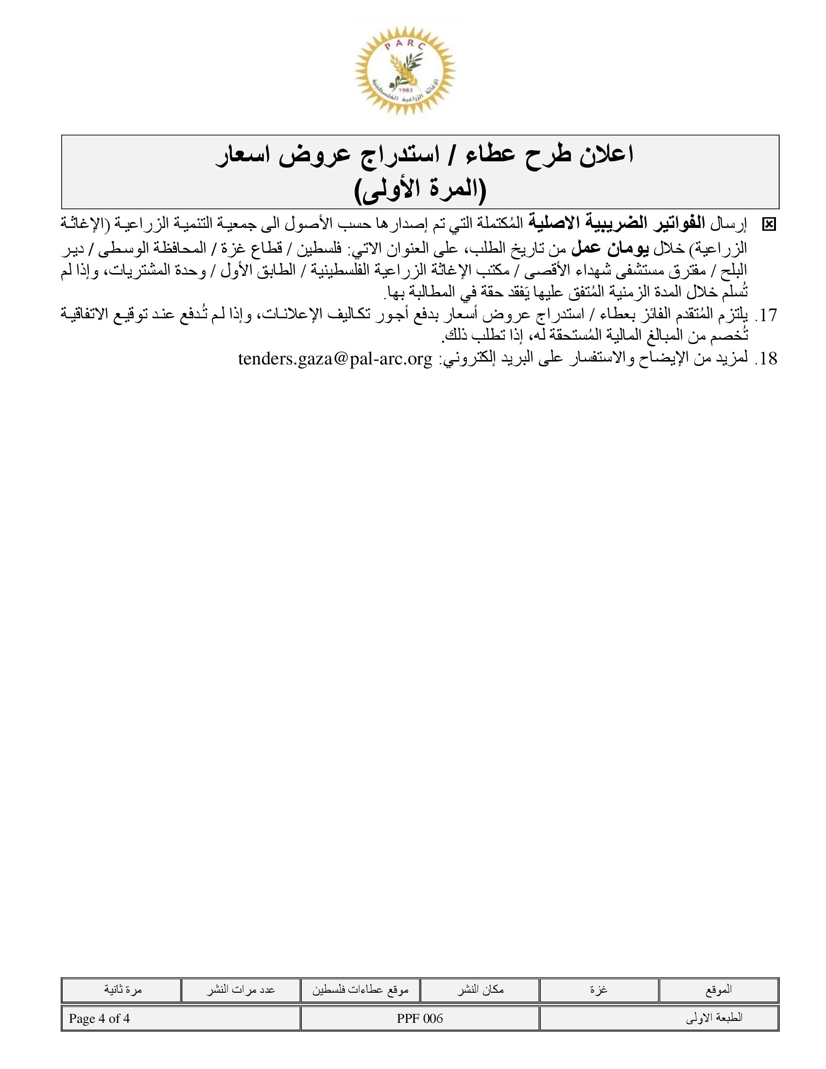 المؤسسة : جمعية التنمية الزراعية موقغ : https://pal-arc.org/tenders/ar بريد : info@pal-arc.org