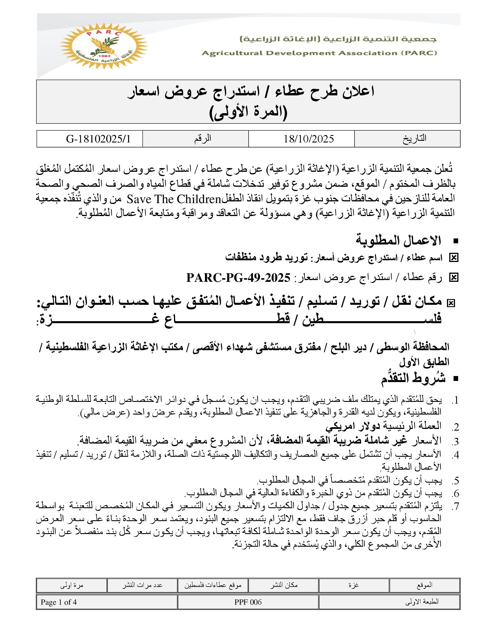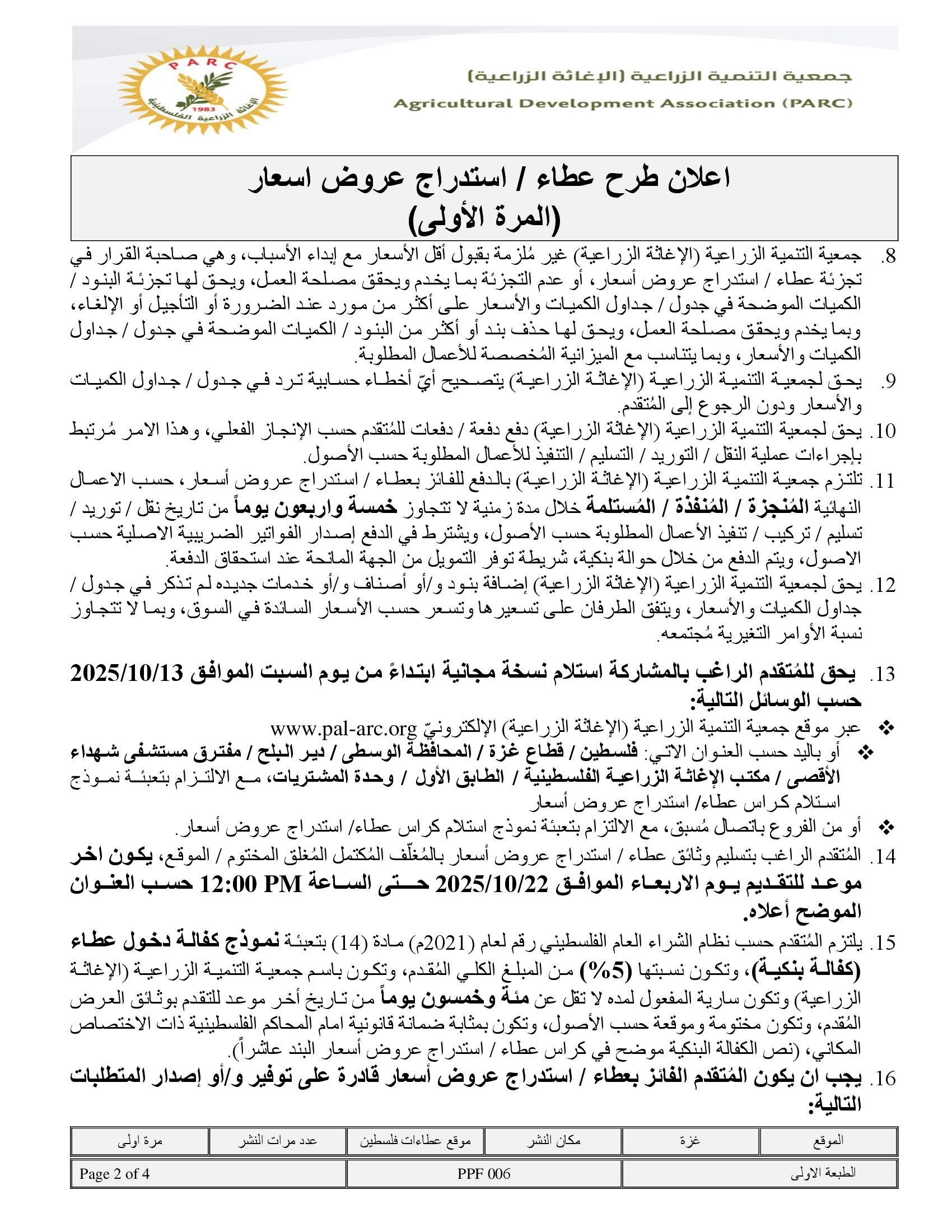 المؤسسة : جمعية التنمية الزراعية موقغ : https://pal-arc.org/tenders/ar بريد : info@pal-arc.org