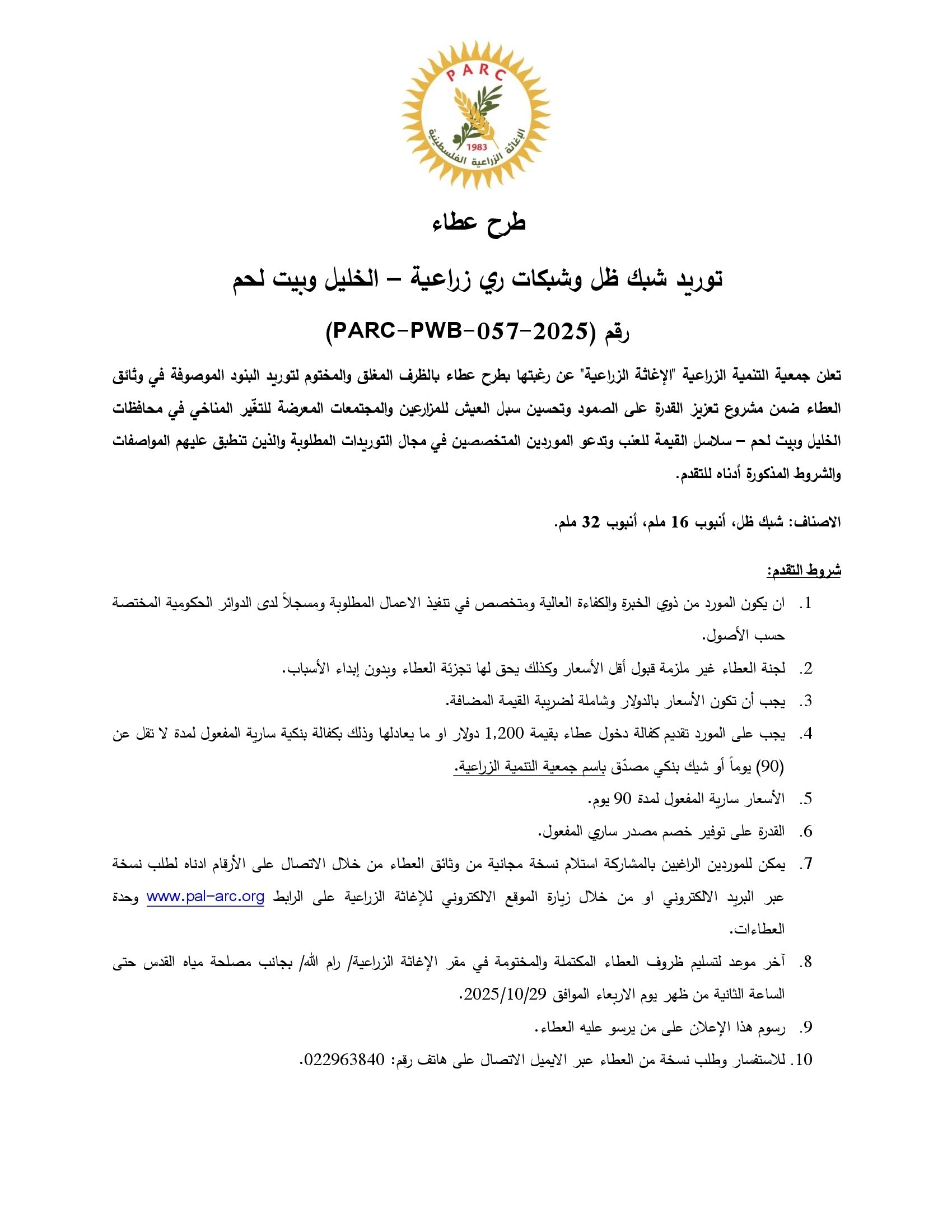 المؤسسة : جمعية التنمية الزراعية موقغ : https://pal-arc.org/tenders/ar بريد : info@pal-arc.org
