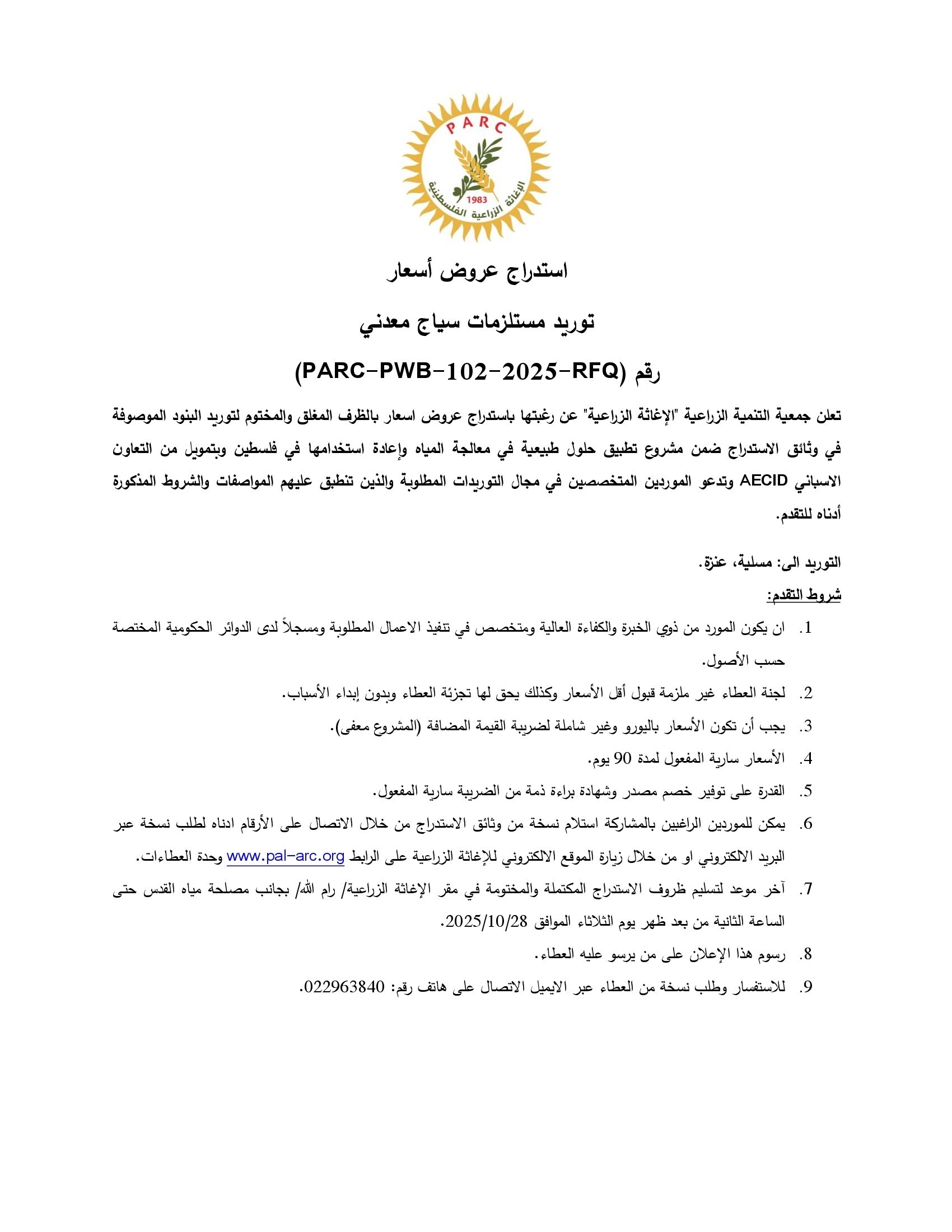 المؤسسة : جمعية التنمية الزراعية موقغ : https://pal-arc.org/tenders/ar بريد : info@pal-arc.org