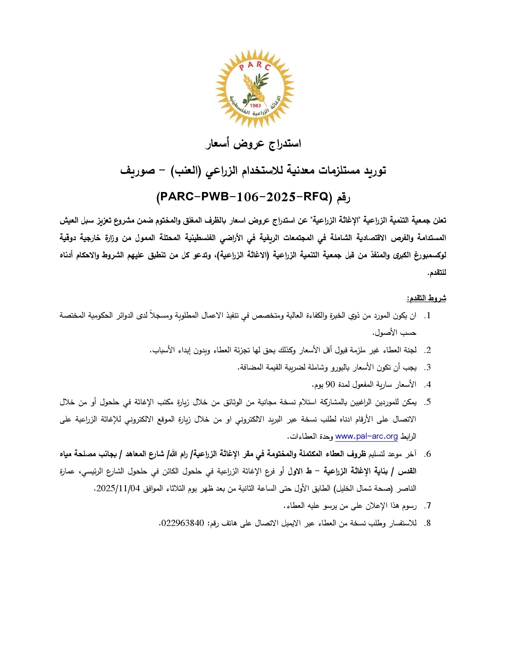 المؤسسة : جمعية التنمية الزراعية موقغ : https://pal-arc.org/tenders/ar بريد : info@pal-arc.org
