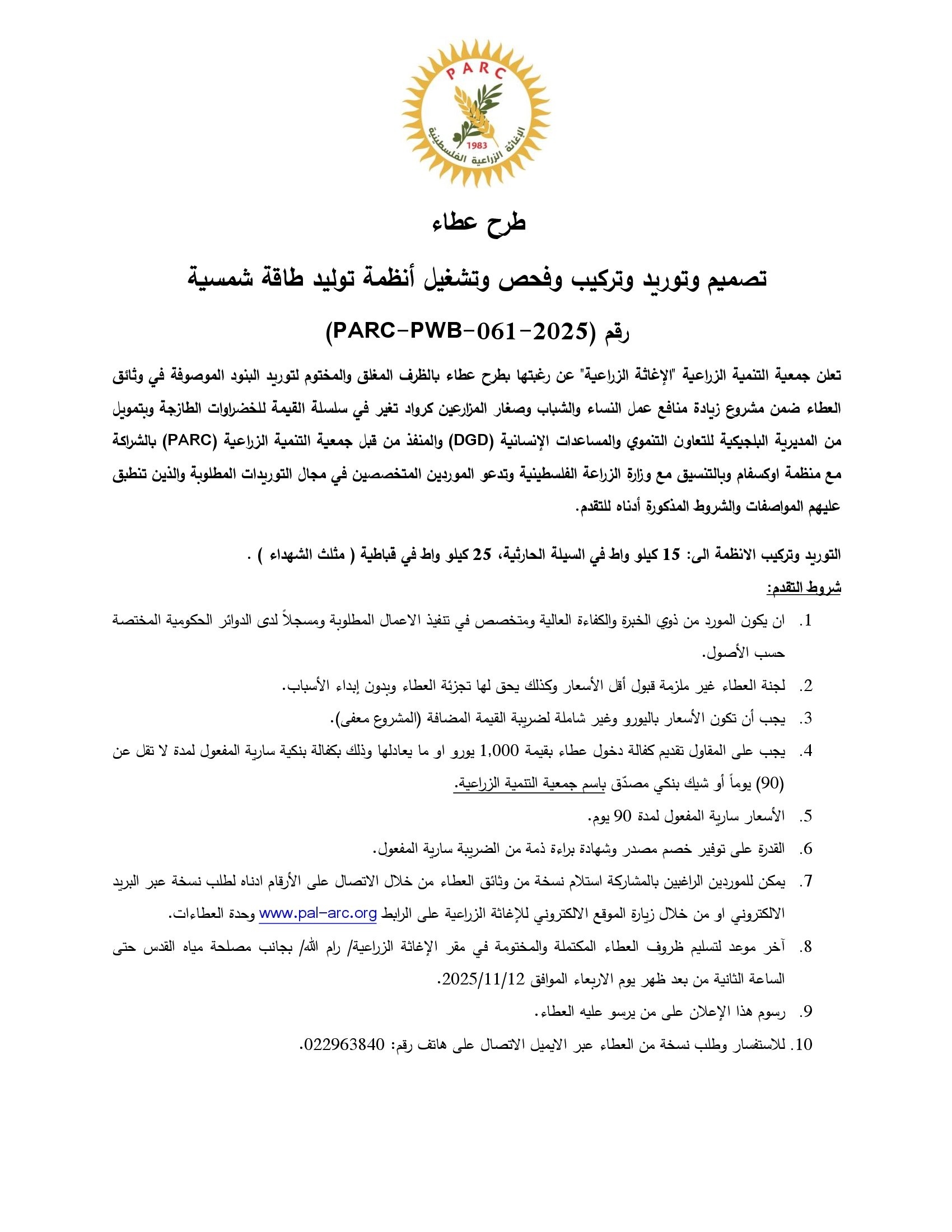 المؤسسة : جمعية التنمية الزراعية موقغ : https://pal-arc.org/tenders/ar بريد : info@pal-arc.org