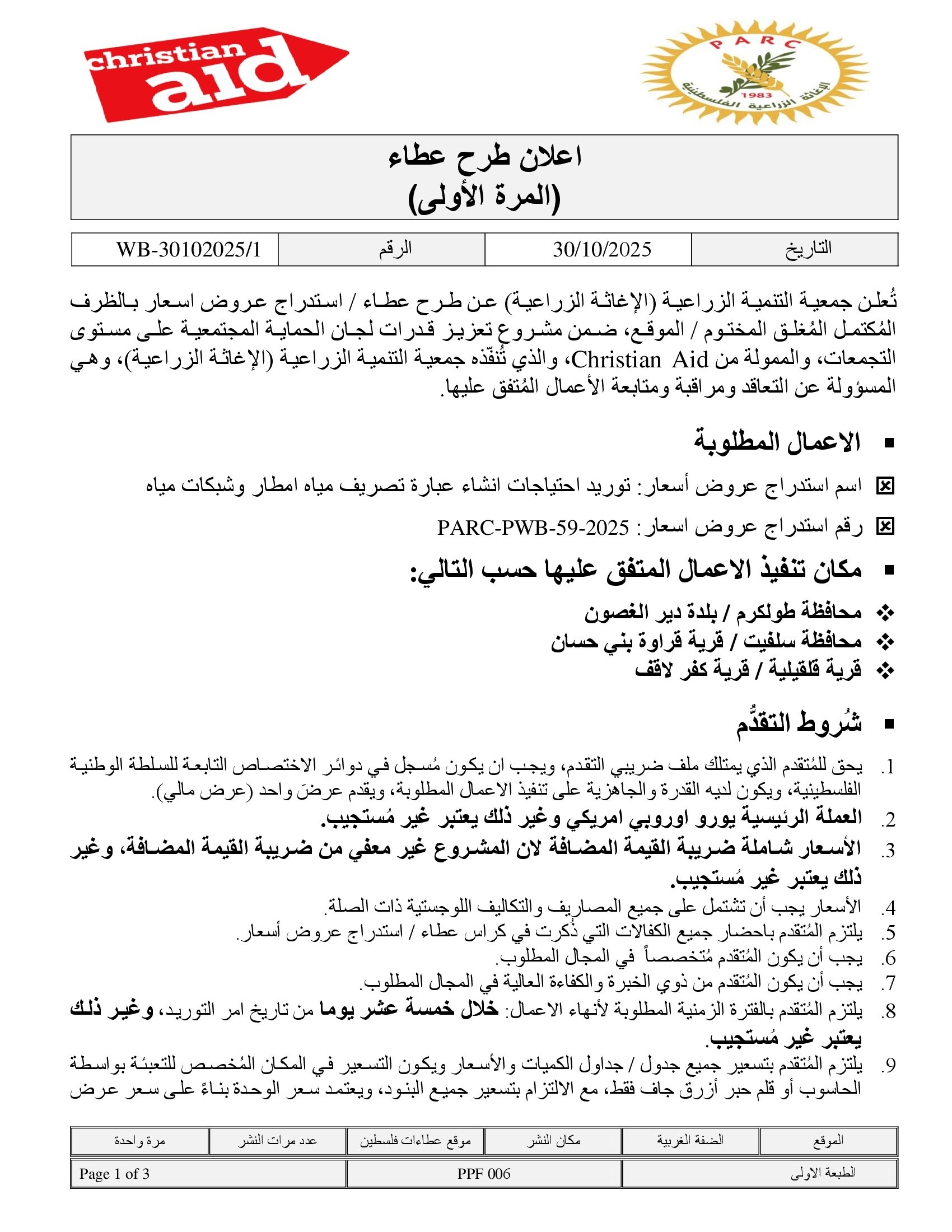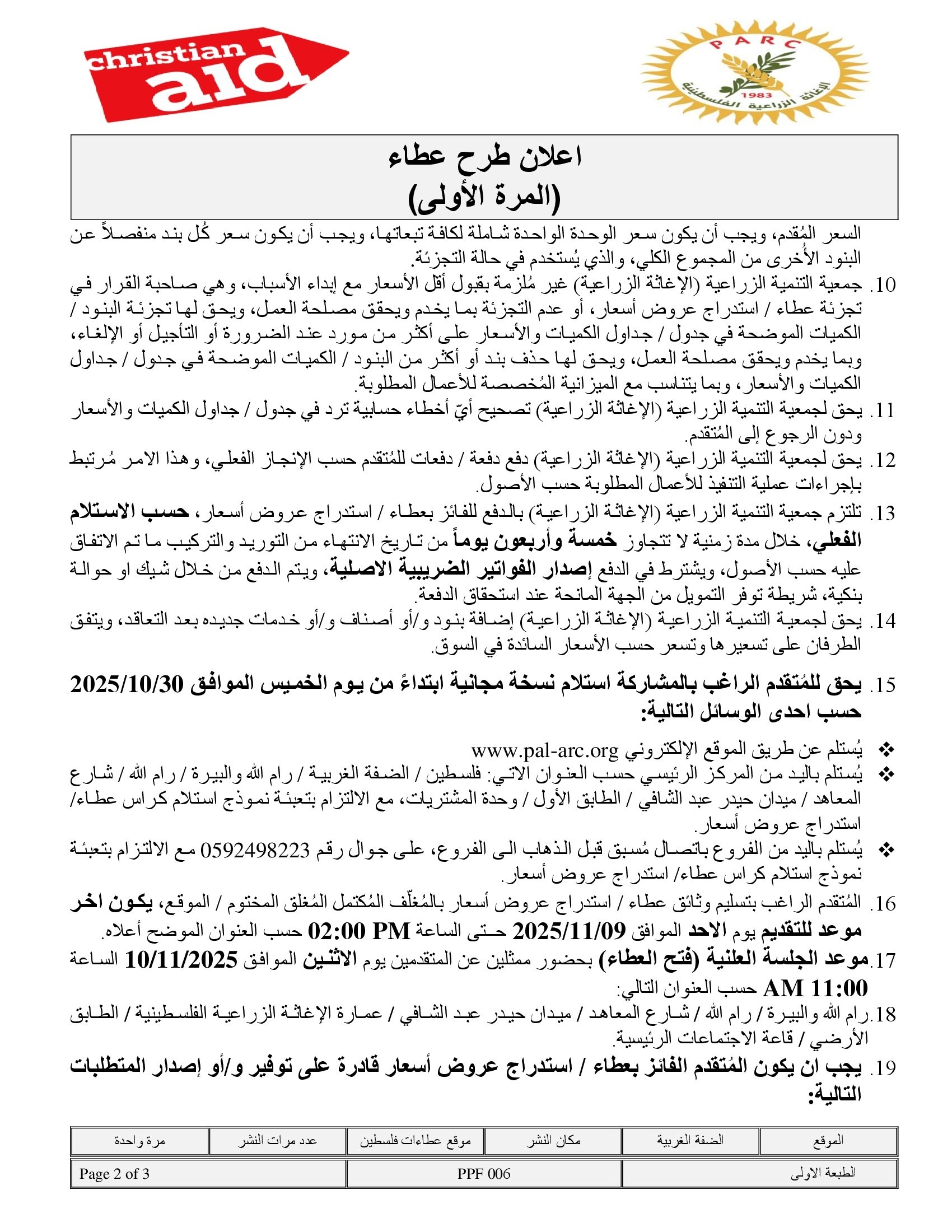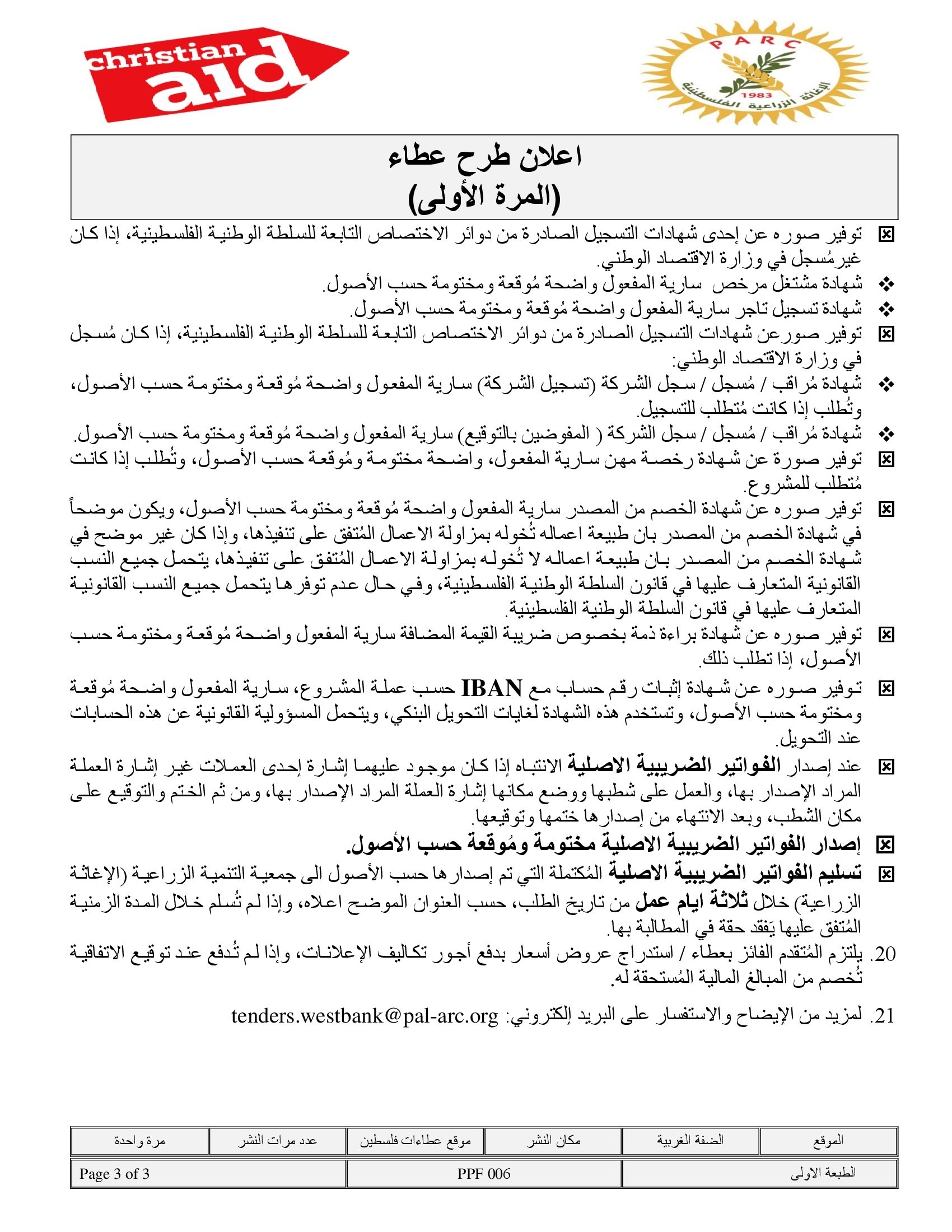 المؤسسة : جمعية التنمية الزراعية موقغ : https://pal-arc.org/tenders/ar بريد : info@pal-arc.org