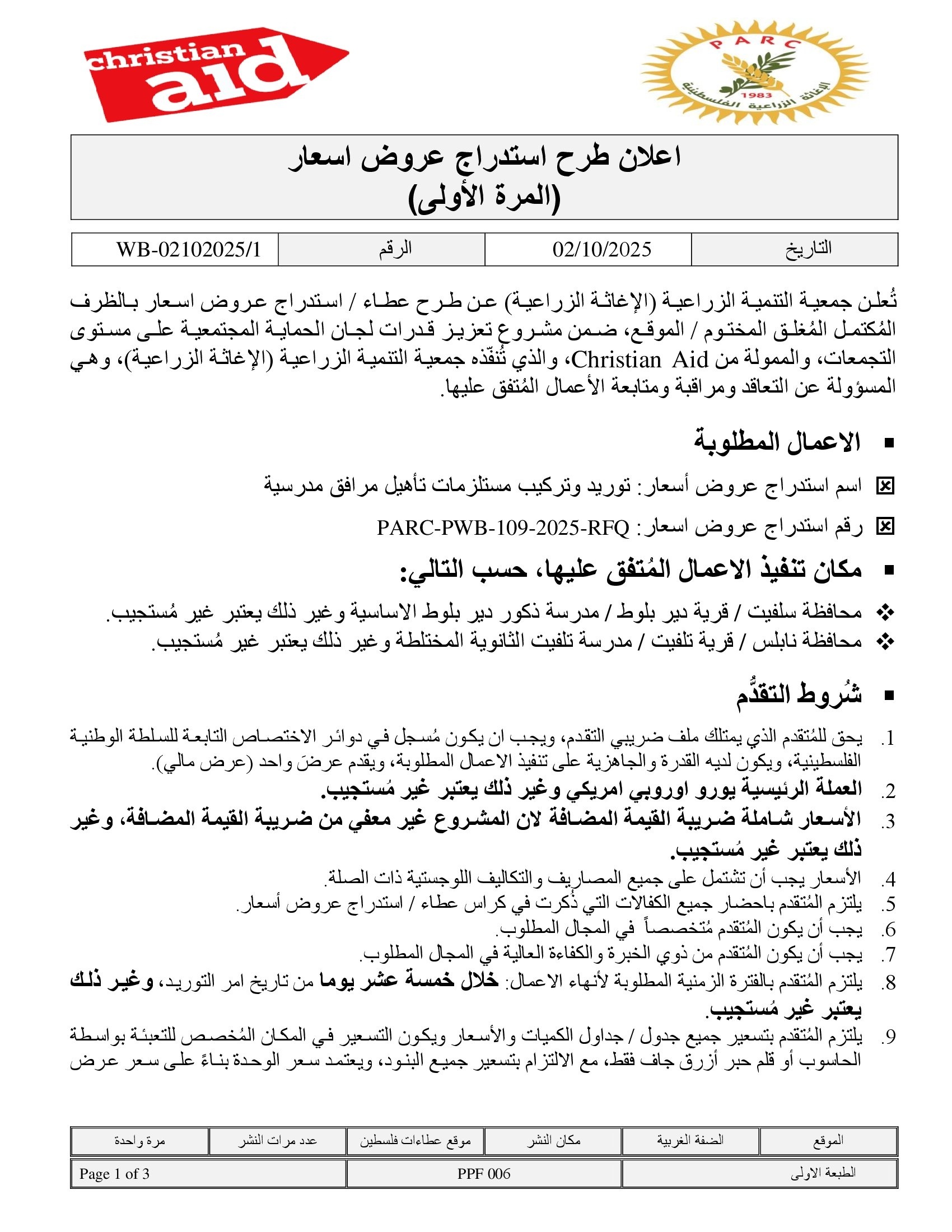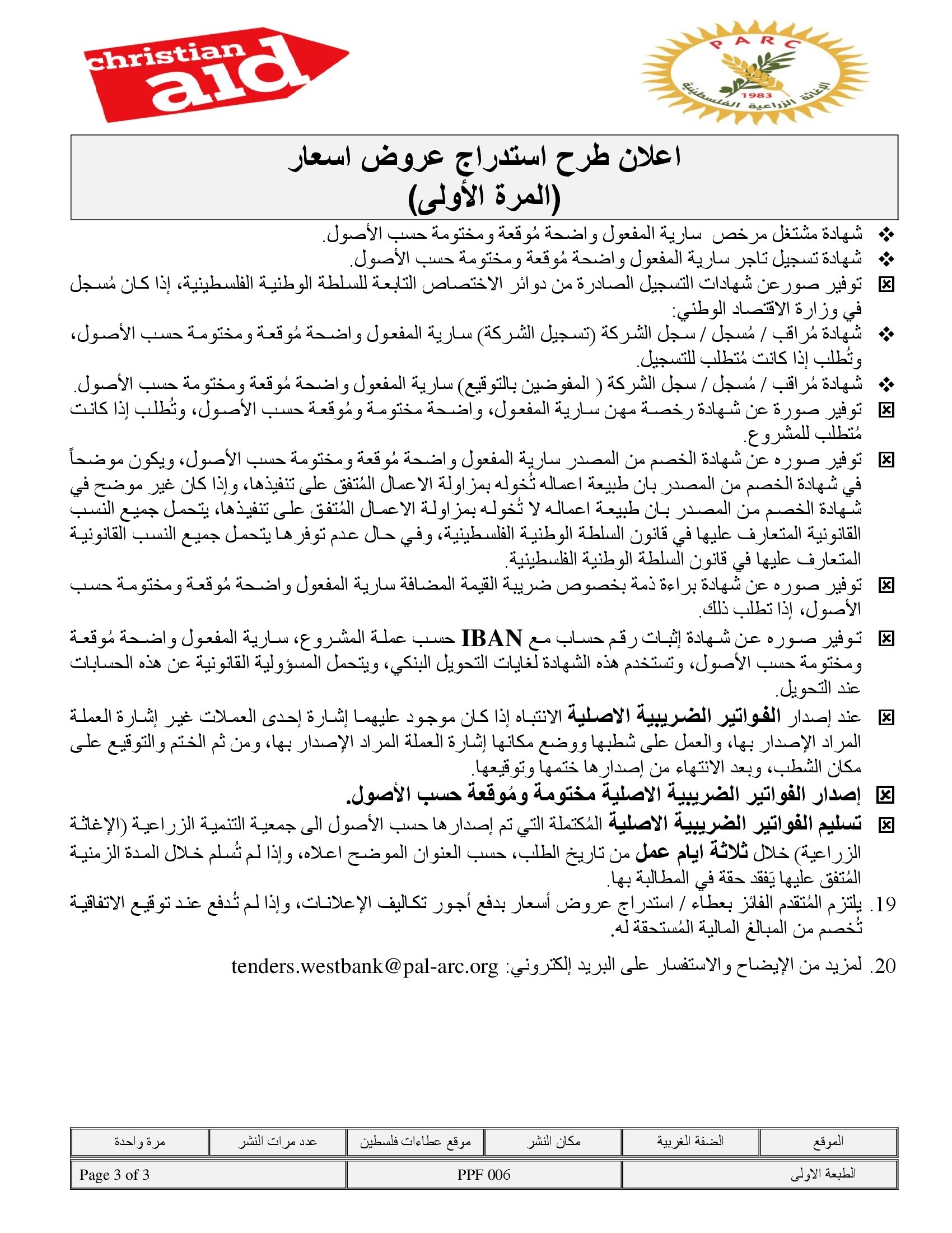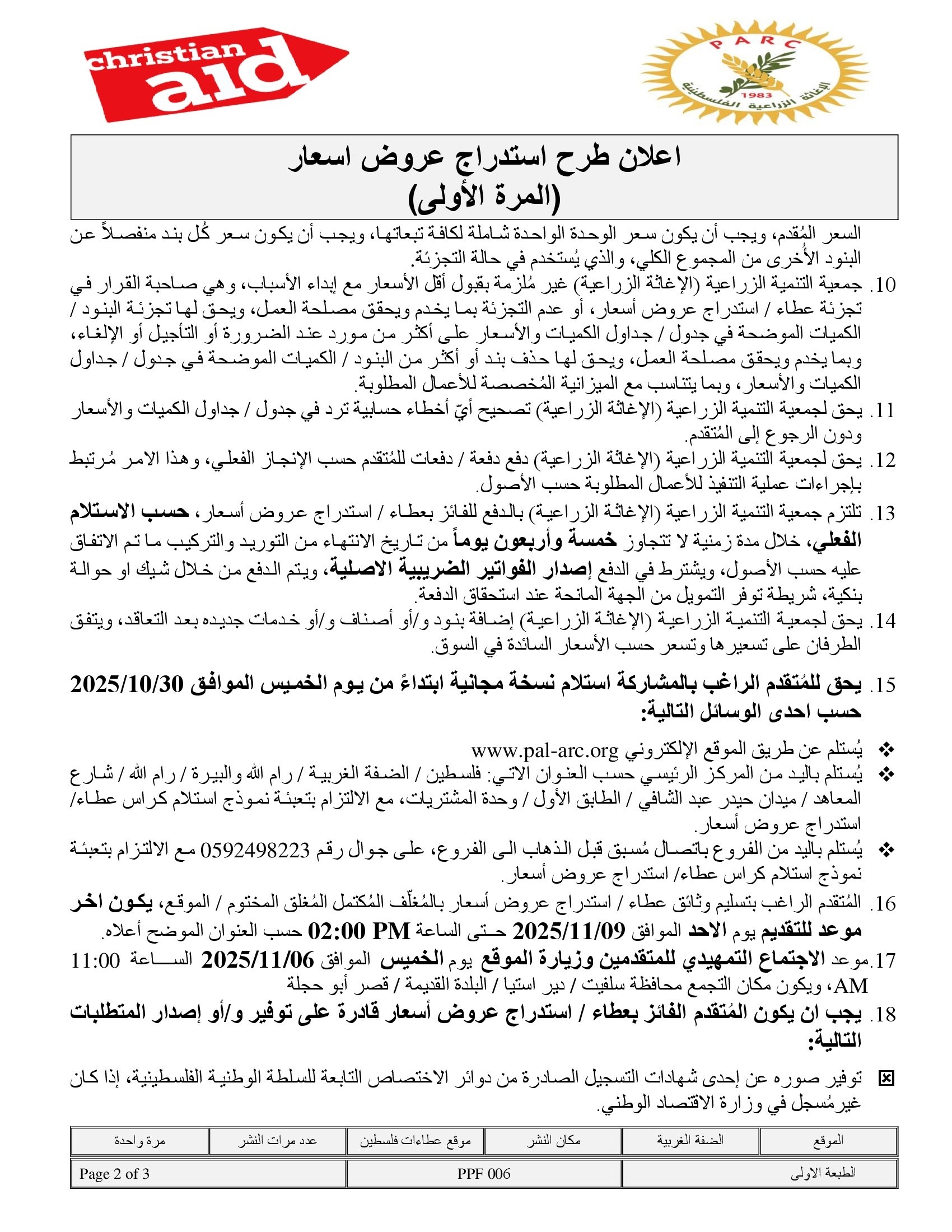المؤسسة : جمعية التنمية الزراعية موقغ : https://pal-arc.org/tenders/ar بريد : info@pal-arc.org