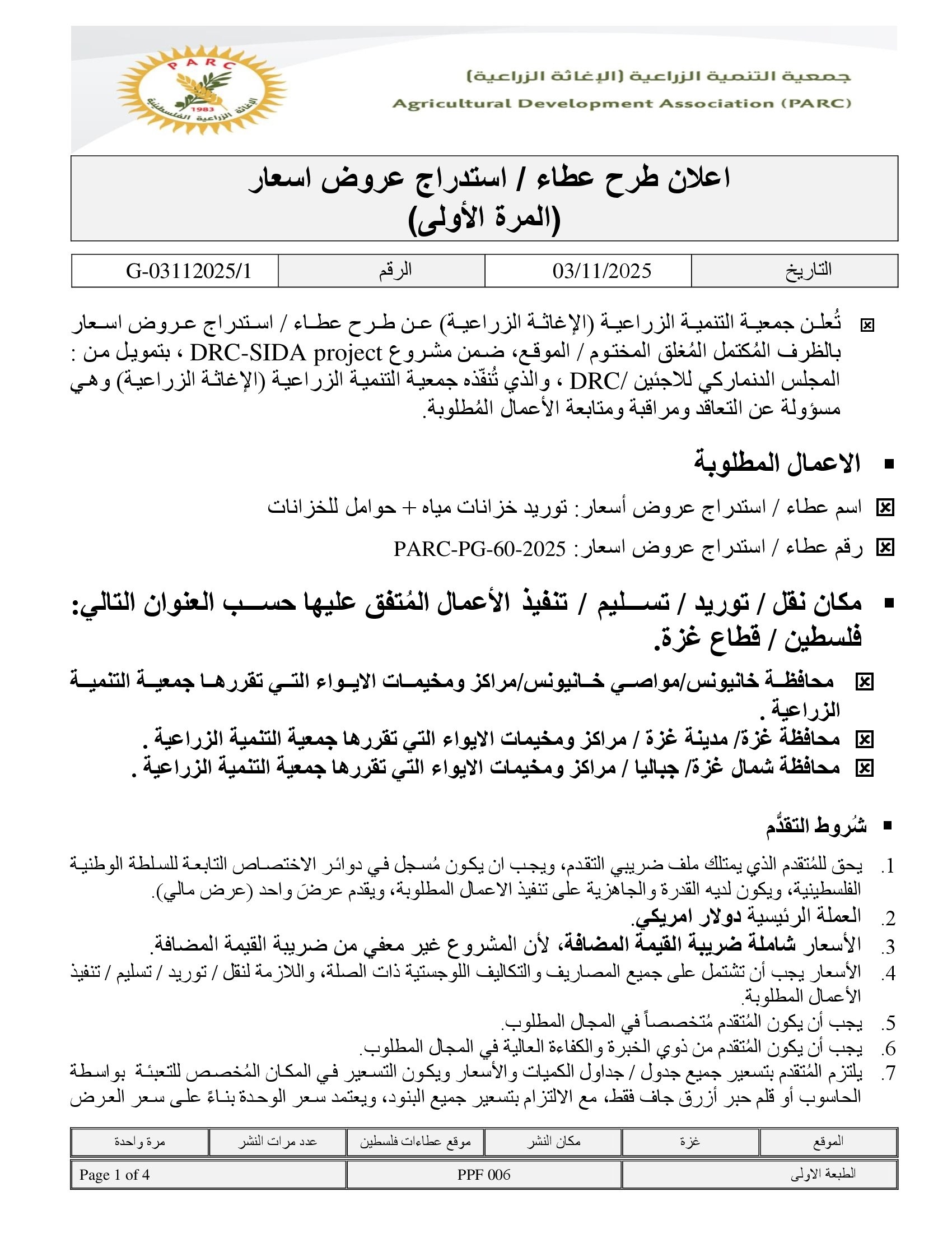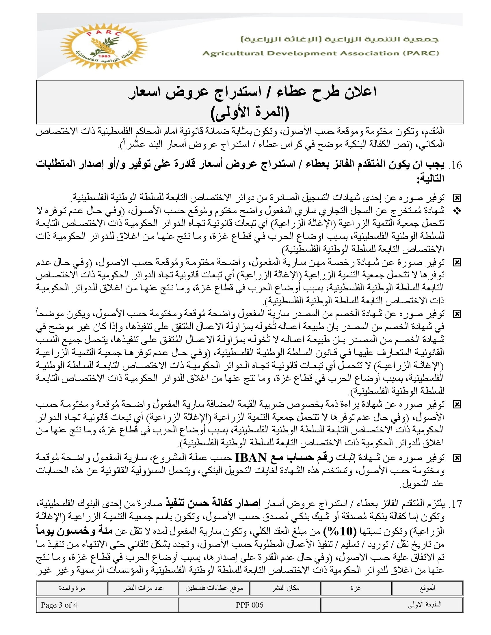 المؤسسة : جمعية التنمية الزراعية موقغ : https://pal-arc.org/tenders/ar بريد : info@pal-arc.org