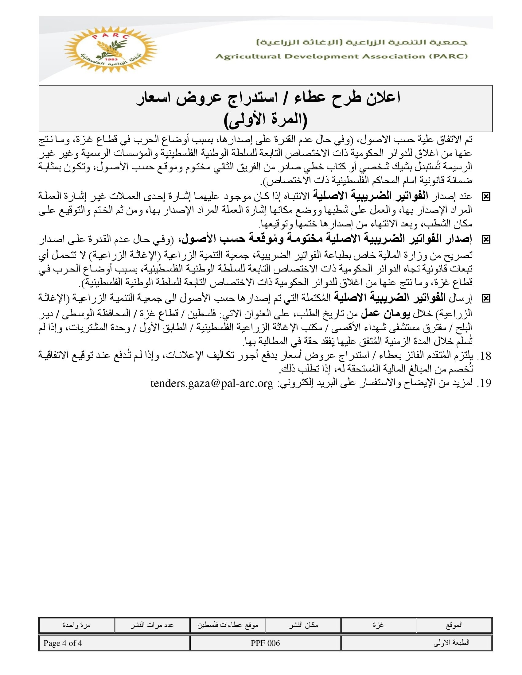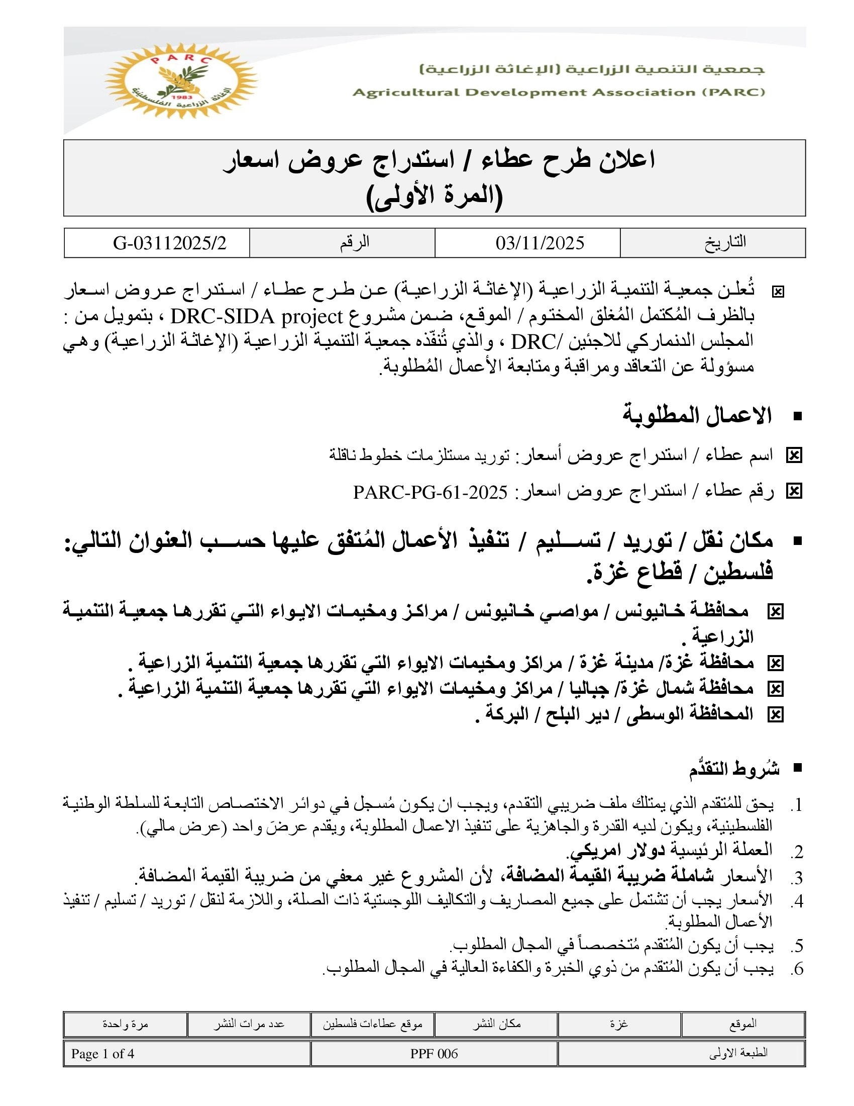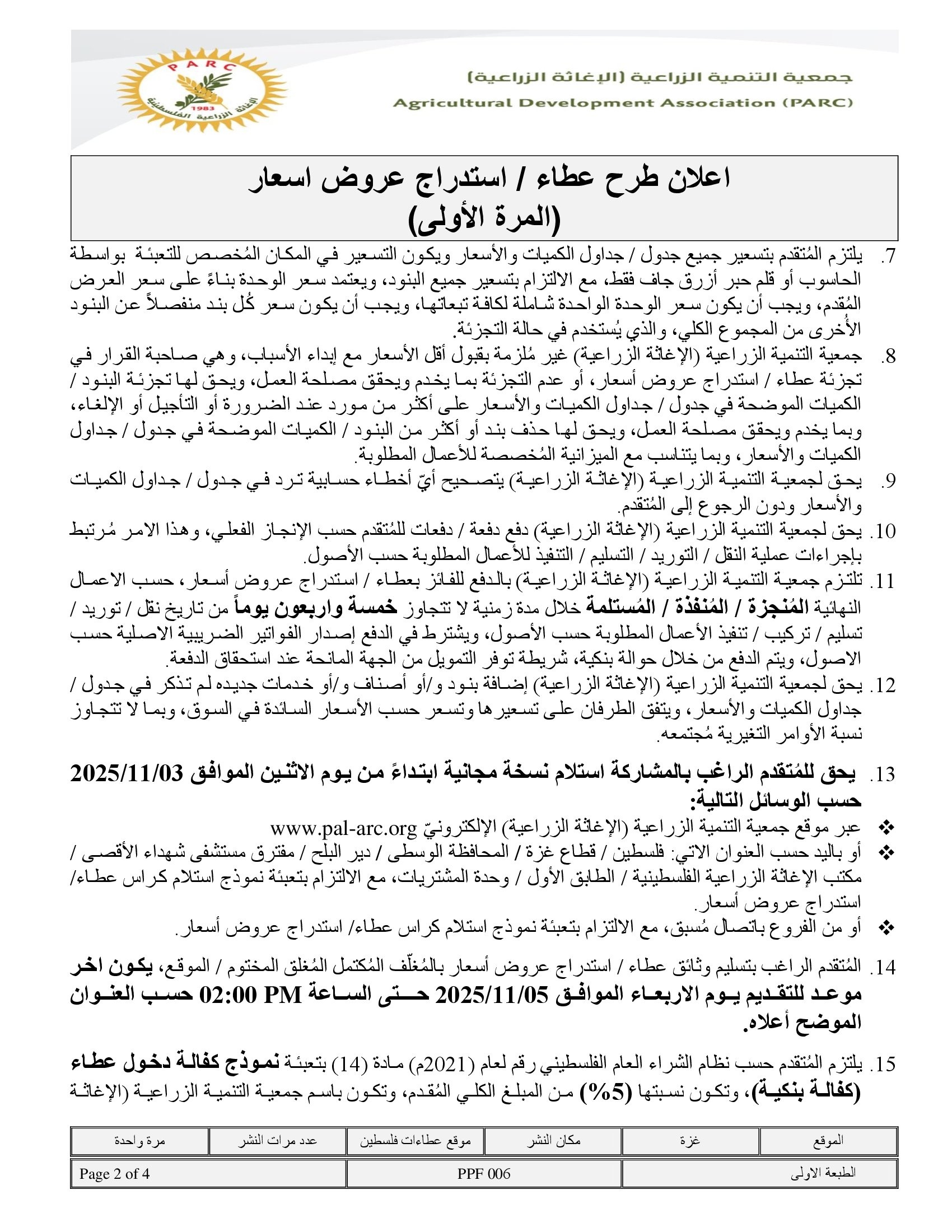 المؤسسة : جمعية التنمية الزراعية موقغ : https://pal-arc.org/tenders/ar بريد : info@pal-arc.org