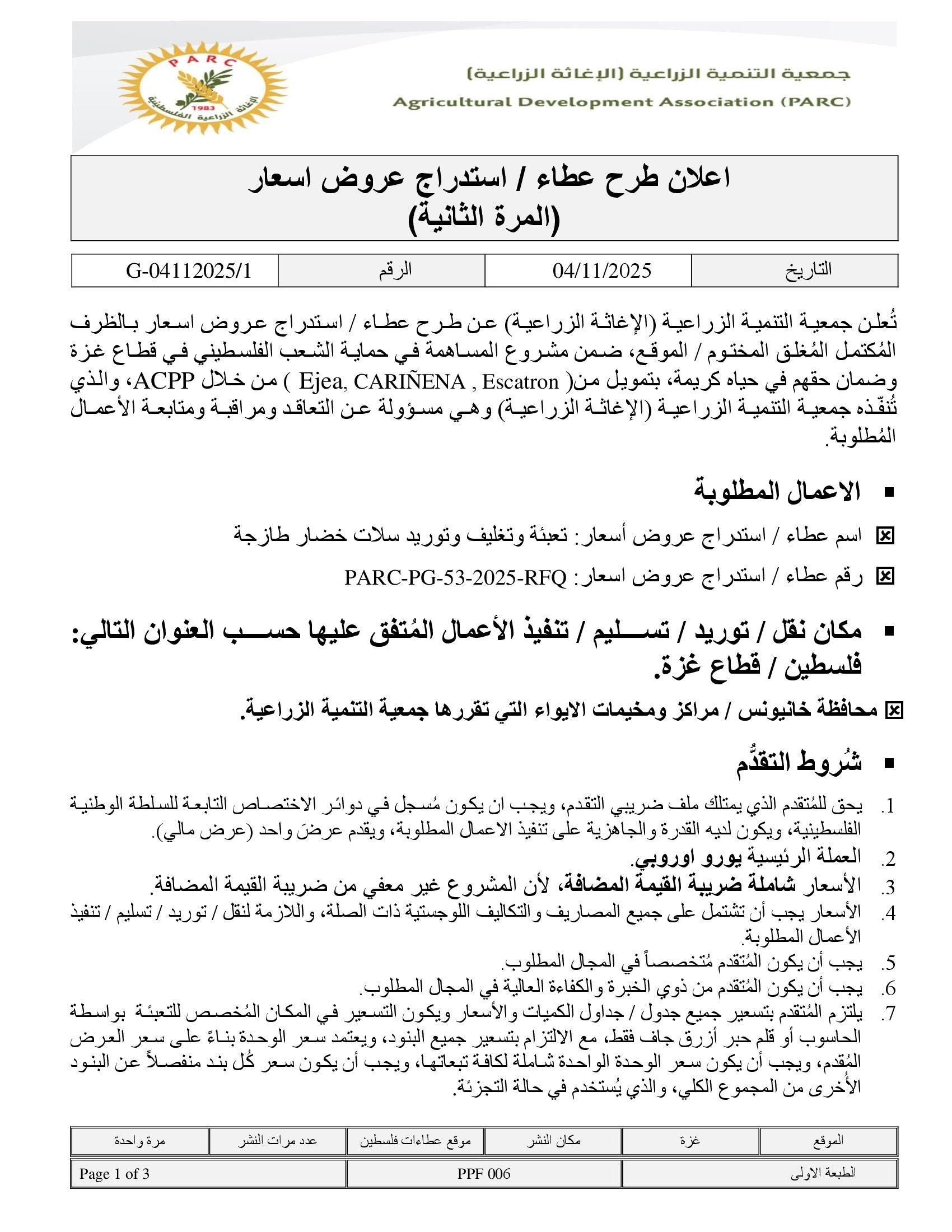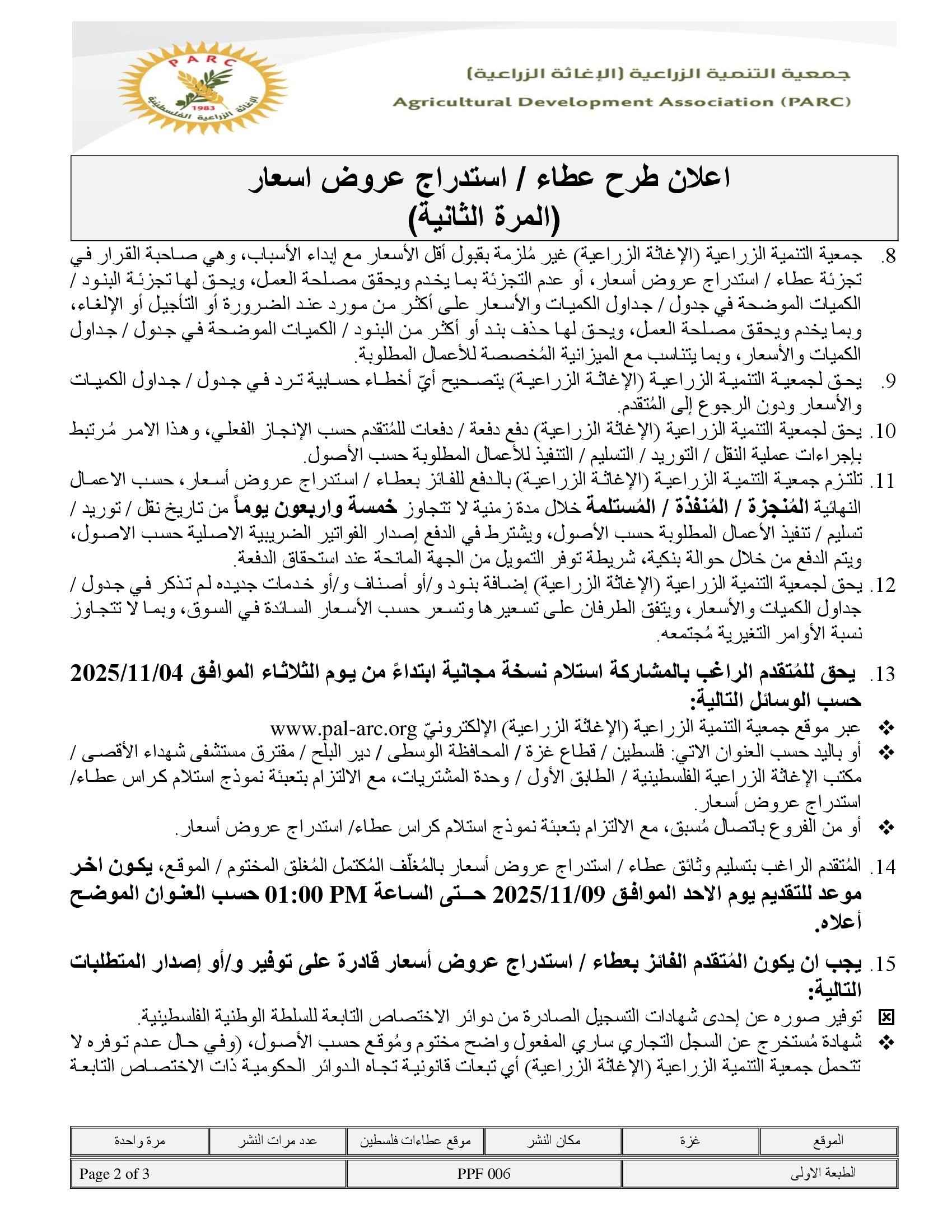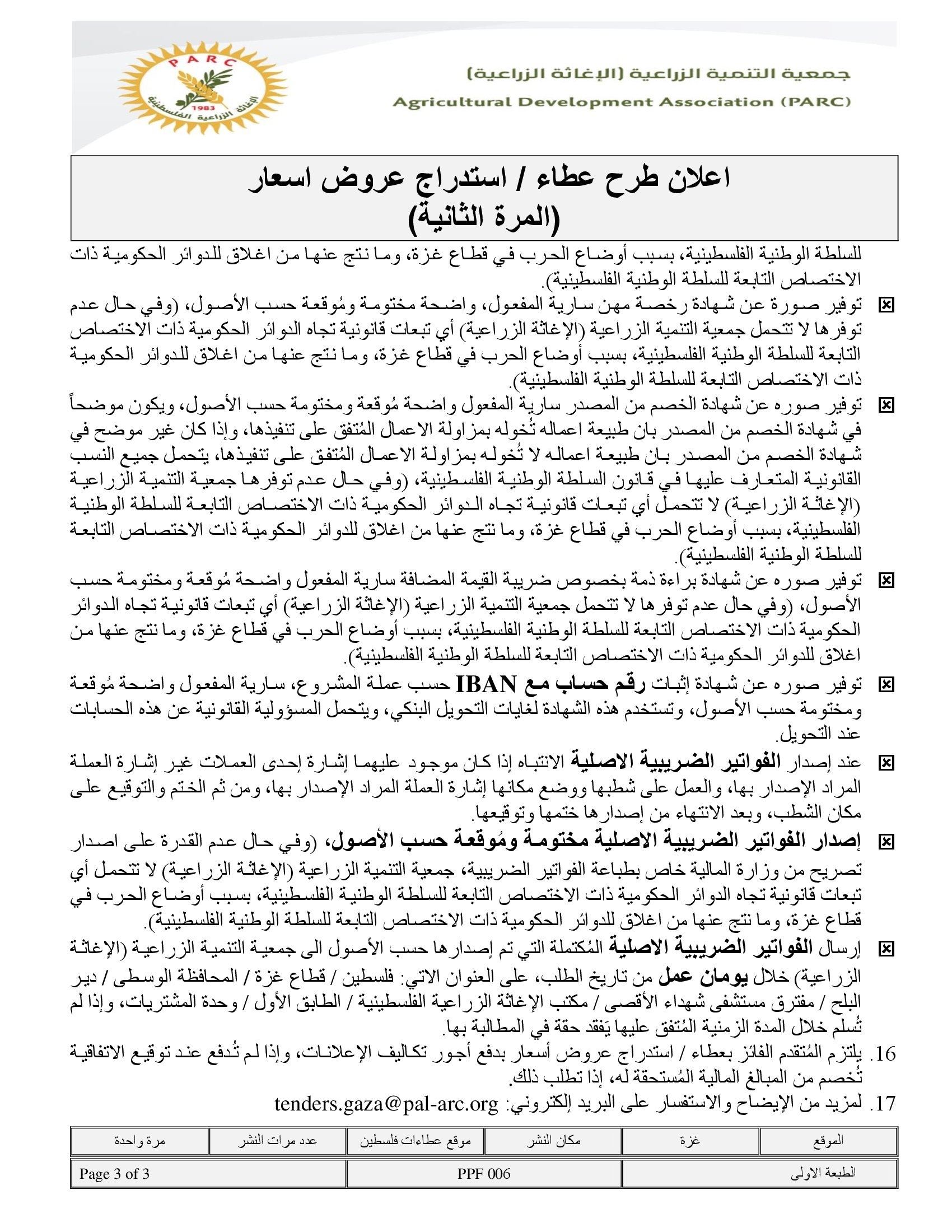 المؤسسة : جمعية التنمية الزراعية موقغ : https://pal-arc.org/tenders/ar بريد : info@pal-arc.org