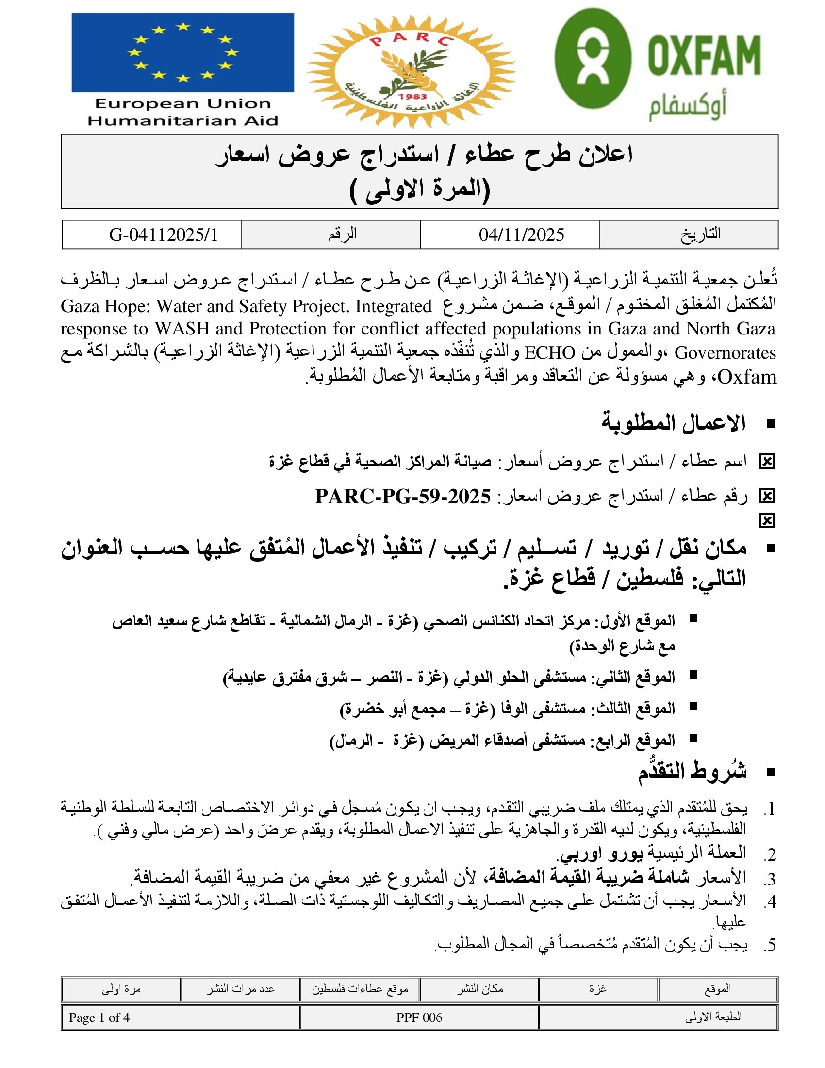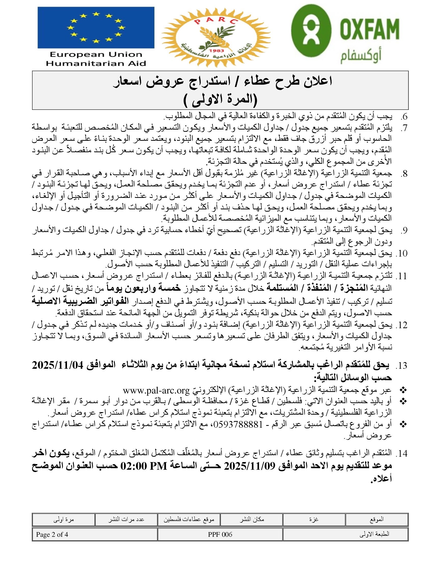 المؤسسة : جمعية التنمية الزراعية موقغ : https://pal-arc.org/tenders/ar بريد : info@pal-arc.org