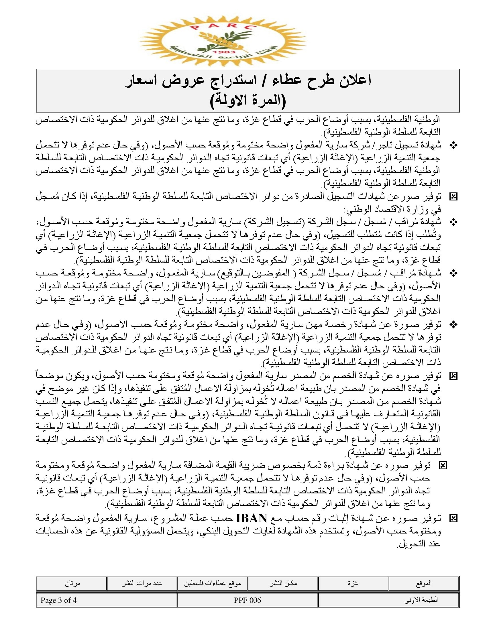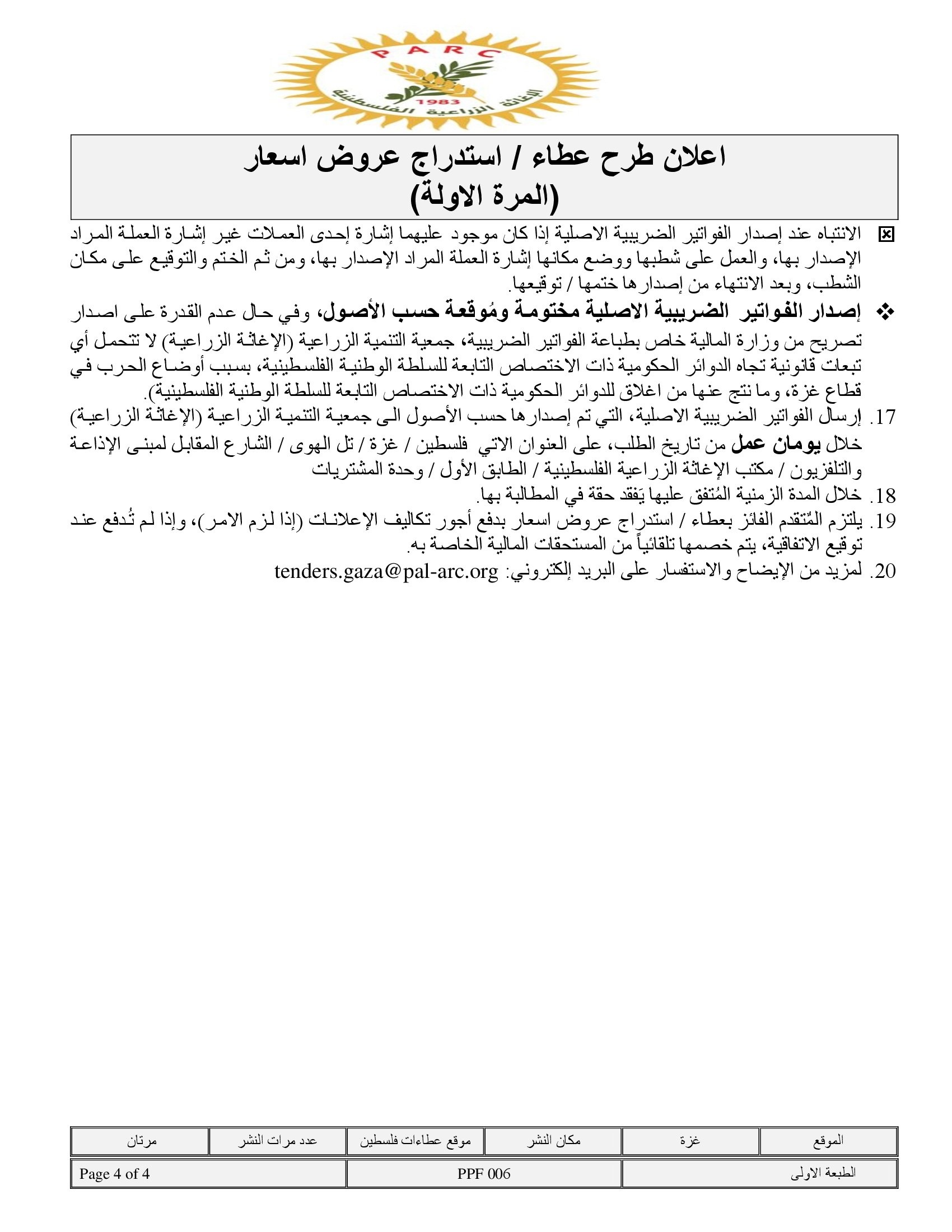 المؤسسة : جمعية التنمية الزراعية موقغ : https://pal-arc.org/tenders/ar بريد : info@pal-arc.org