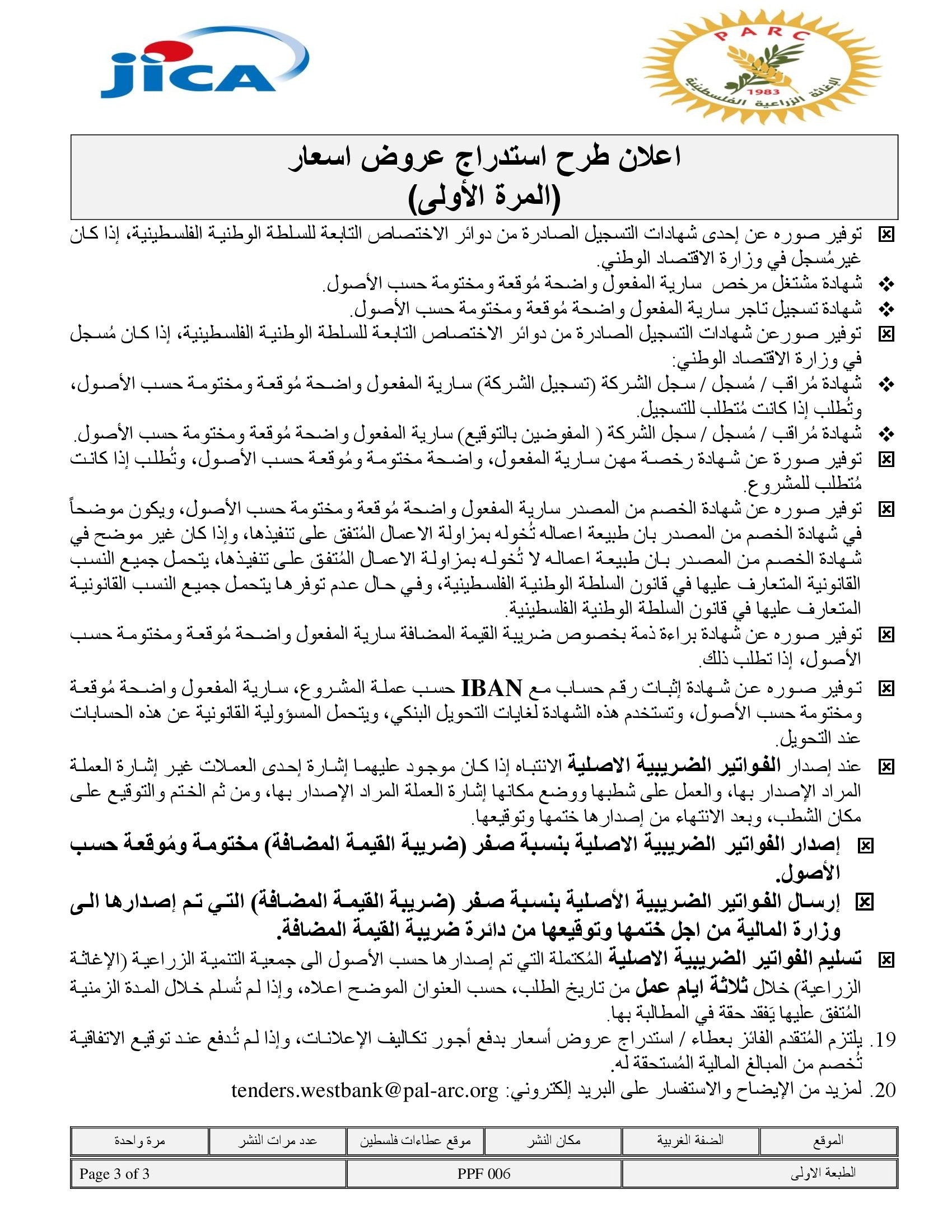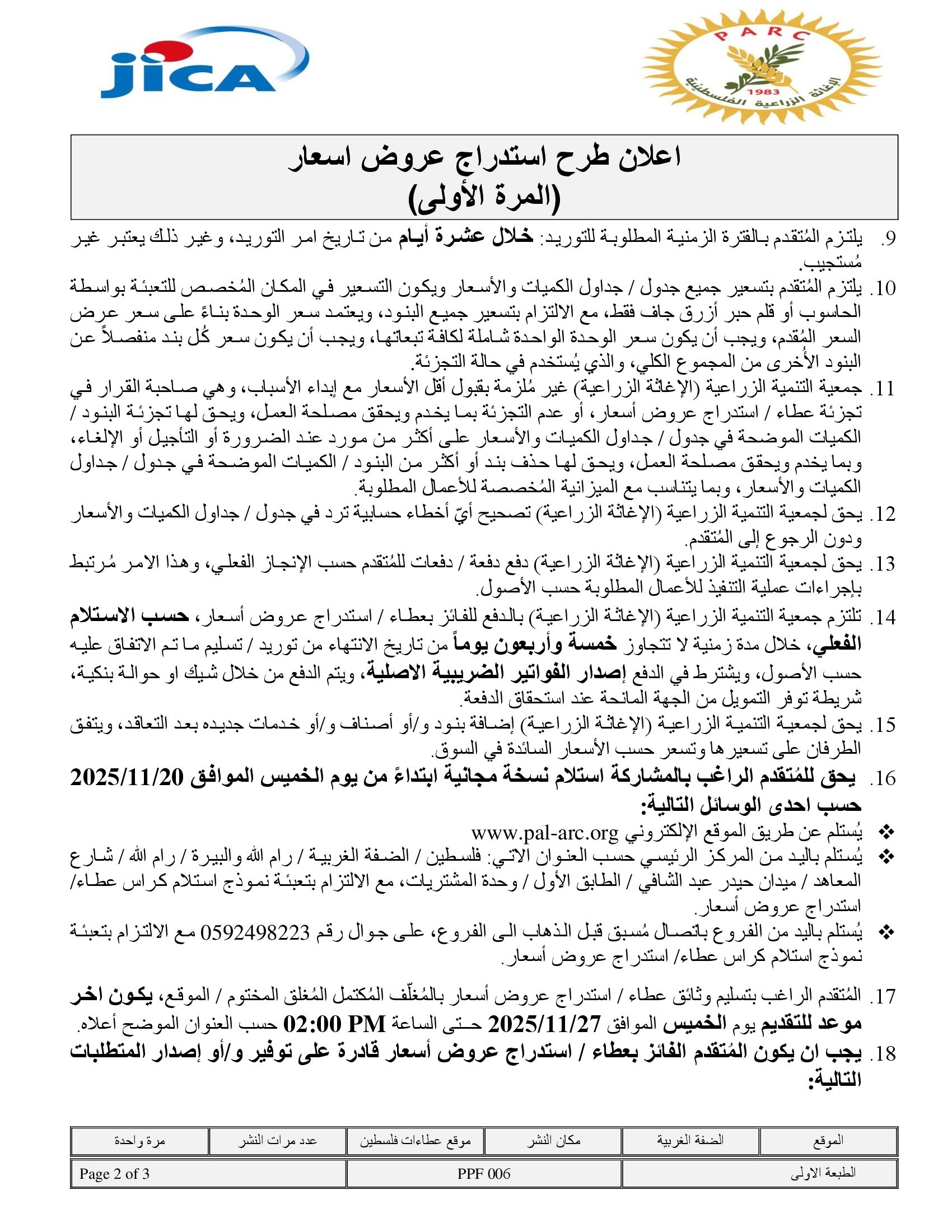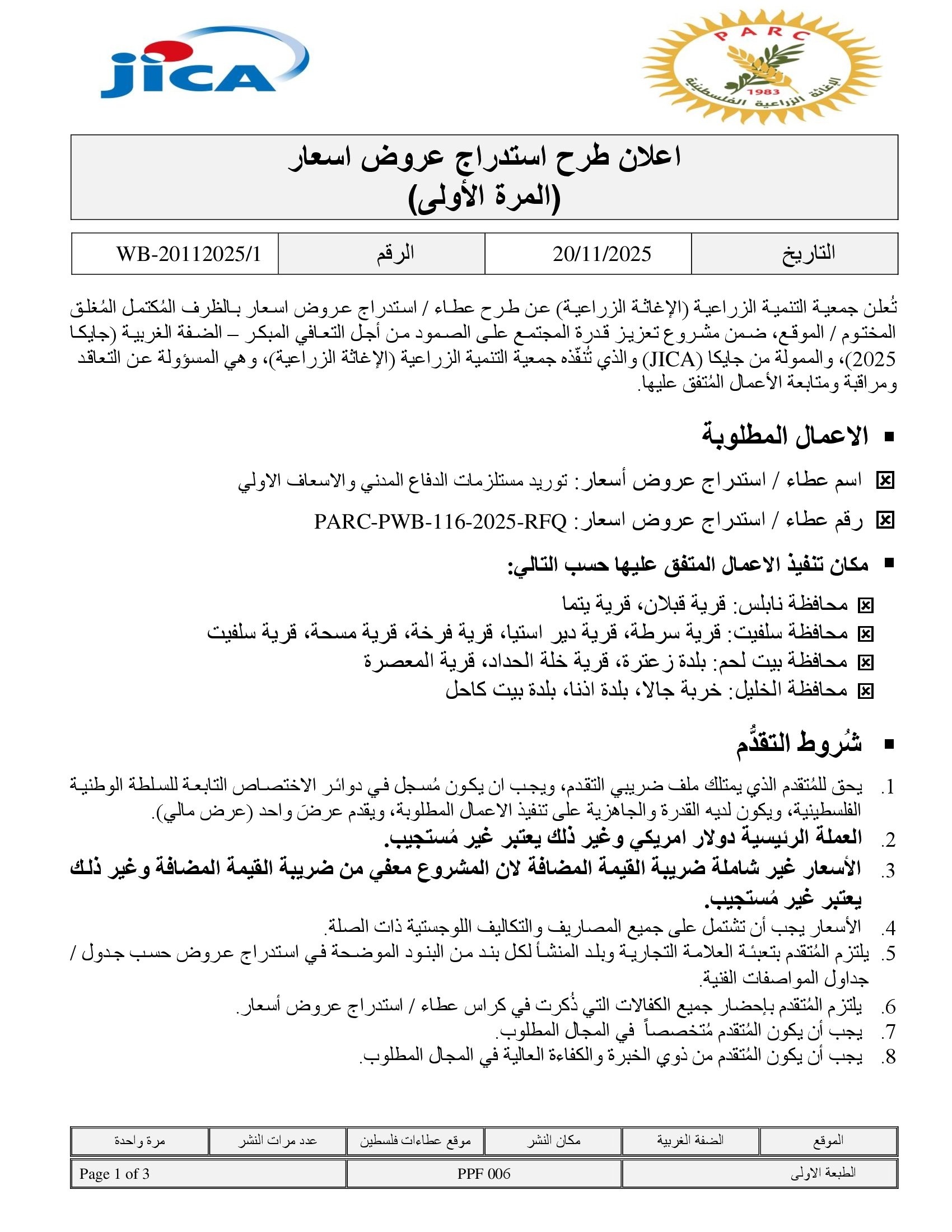المؤسسة : جمعية التنمية الزراعية موقغ : https://pal-arc.org/tenders/ar بريد : info@pal-arc.org