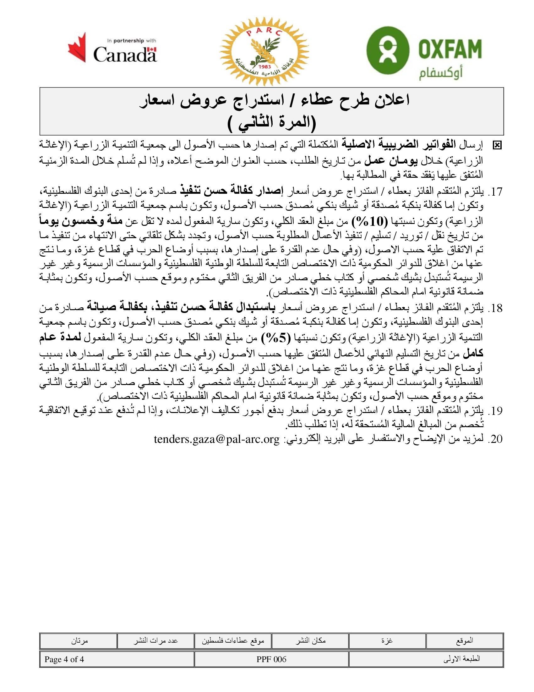 المؤسسة : جمعية التنمية الزراعية موقغ : https://pal-arc.org/tenders/ar بريد : info@pal-arc.org