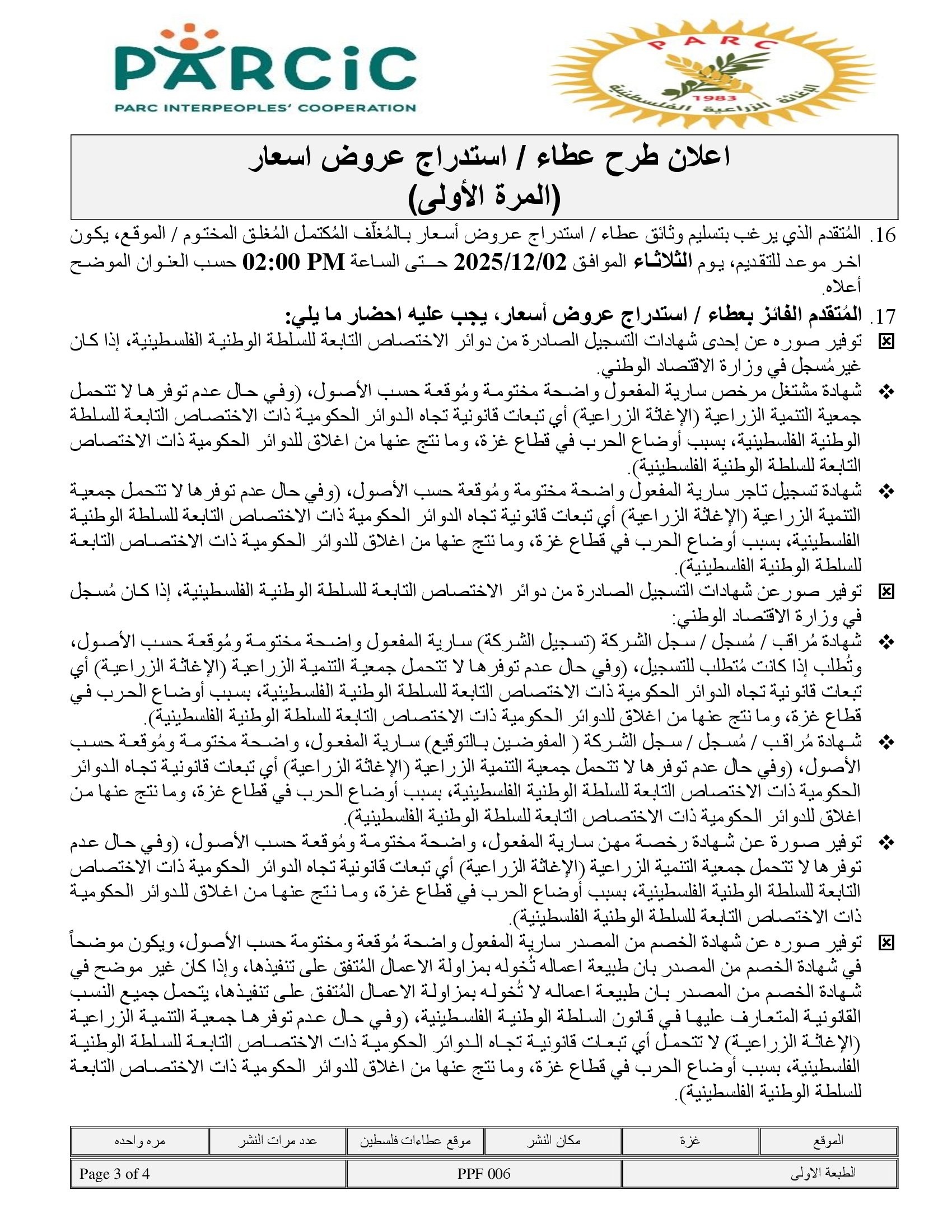 طرح عطاء توريد معدات الحماية والوقاية والاسعاف الاولي – محافظات الضفة