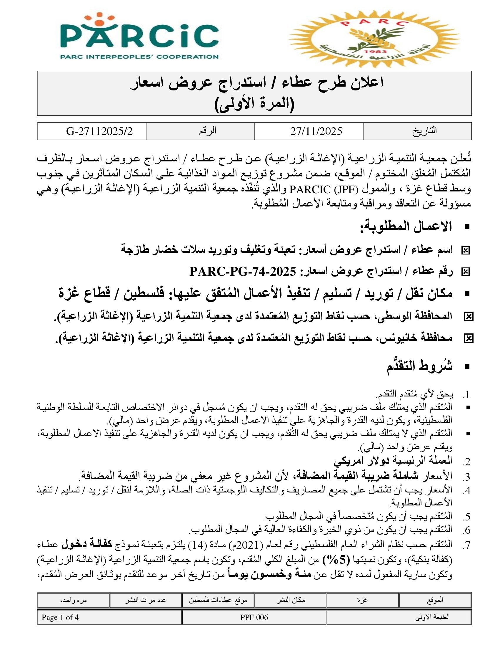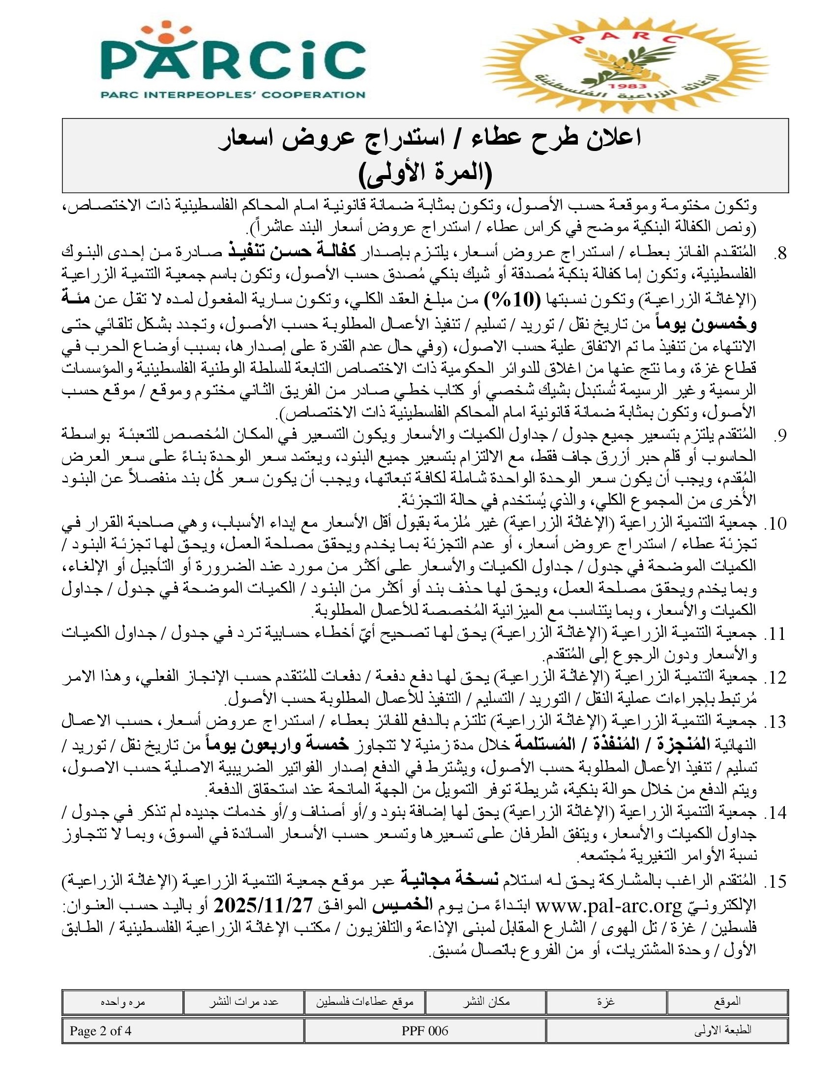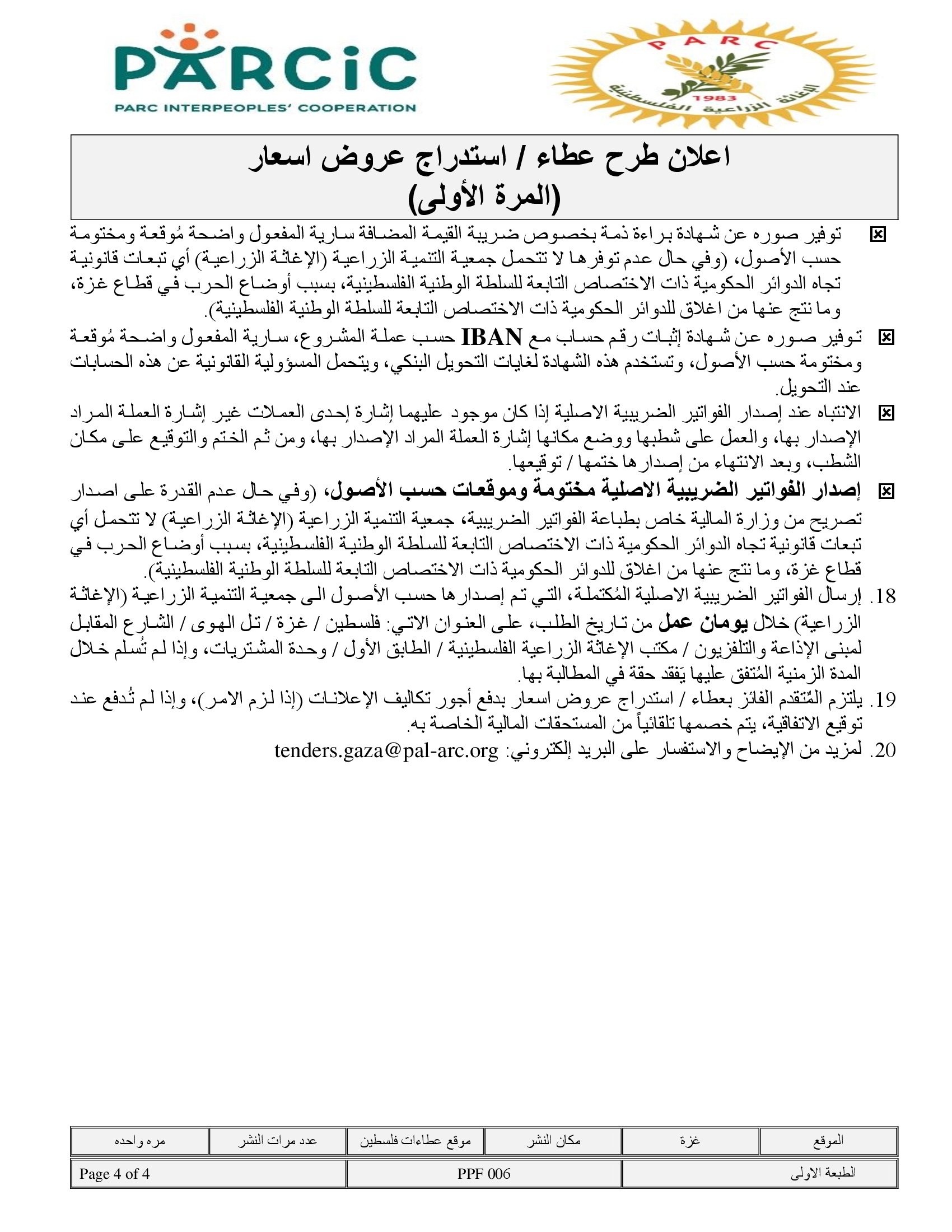 المؤسسة : جمعية التنمية الزراعية موقغ : https://pal-arc.org/tenders/ar بريد : info@pal-arc.org