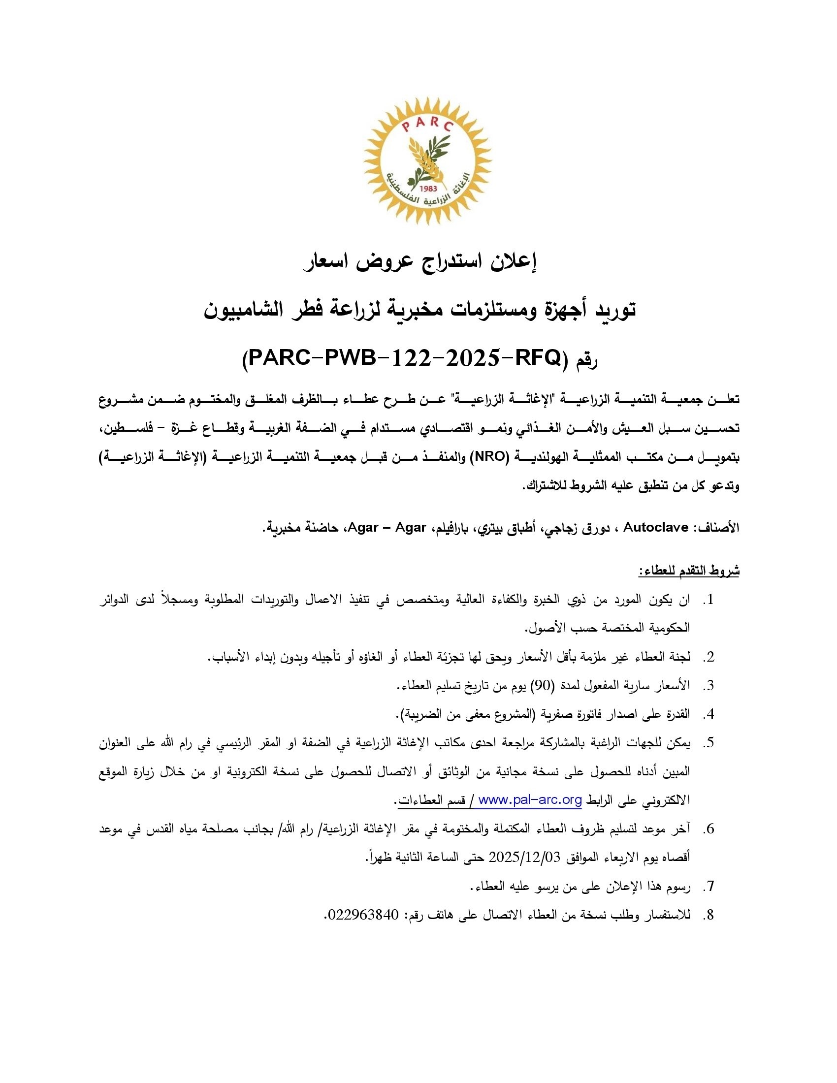 المؤسسة : جمعية التنمية الزراعية موقغ : https://pal-arc.org/tenders/ar بريد : info@pal-arc.org