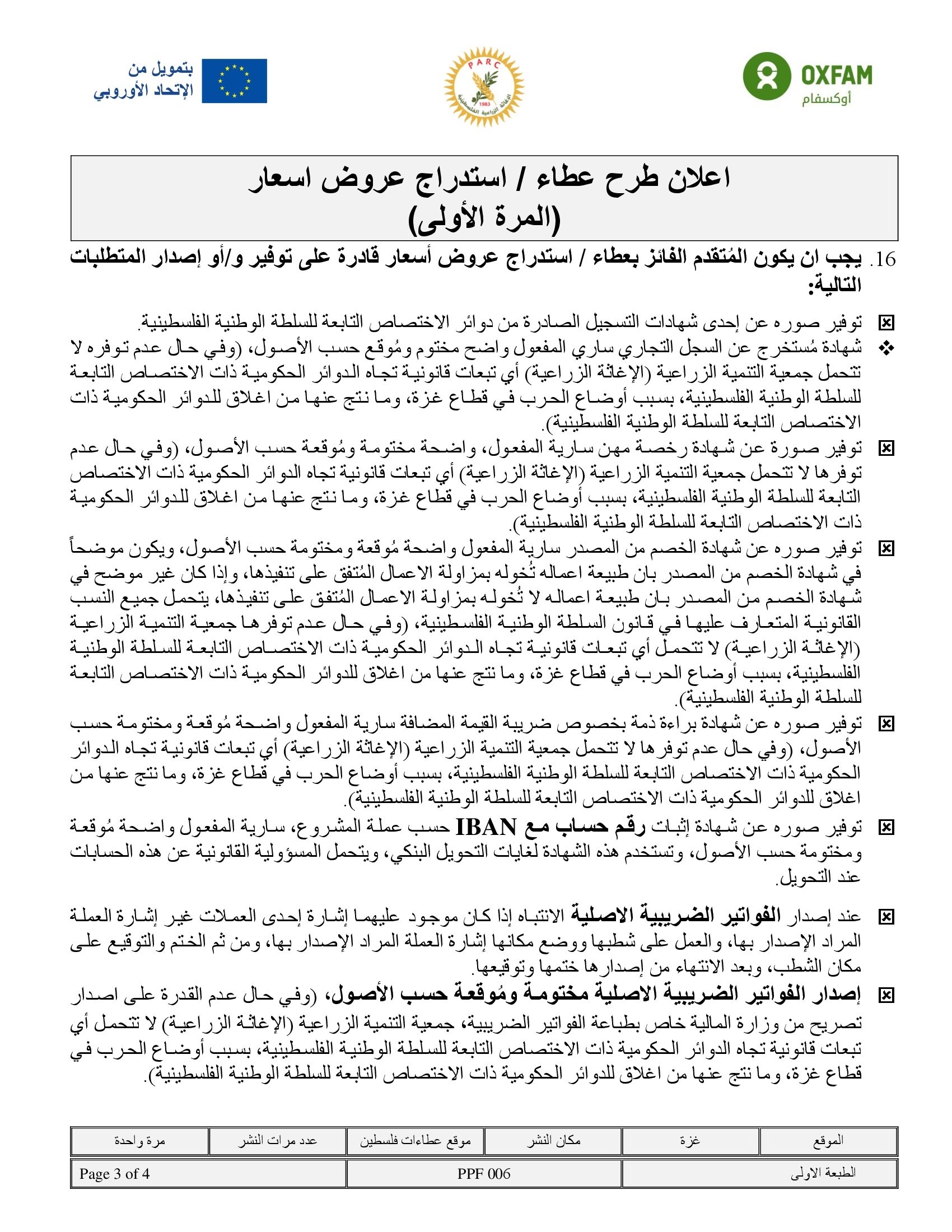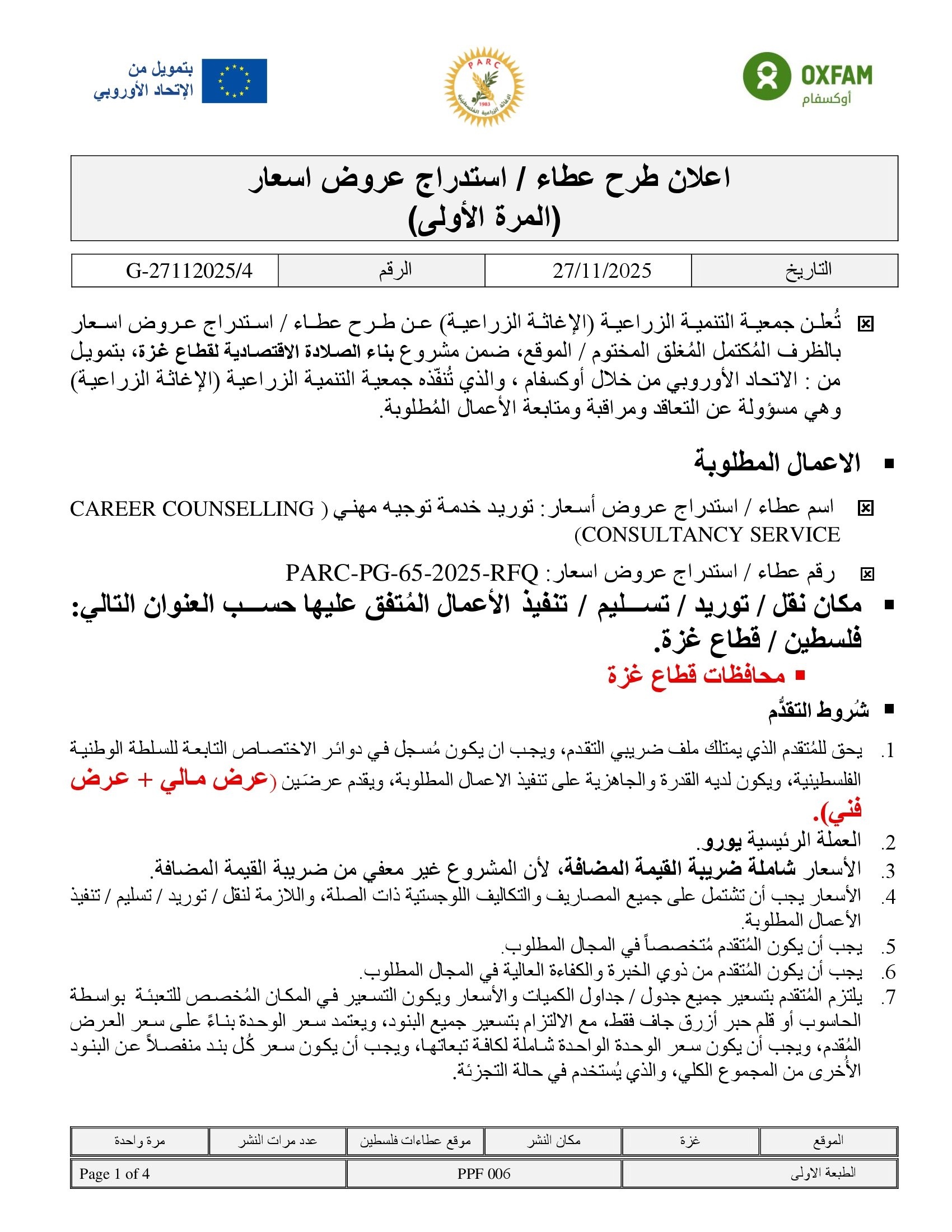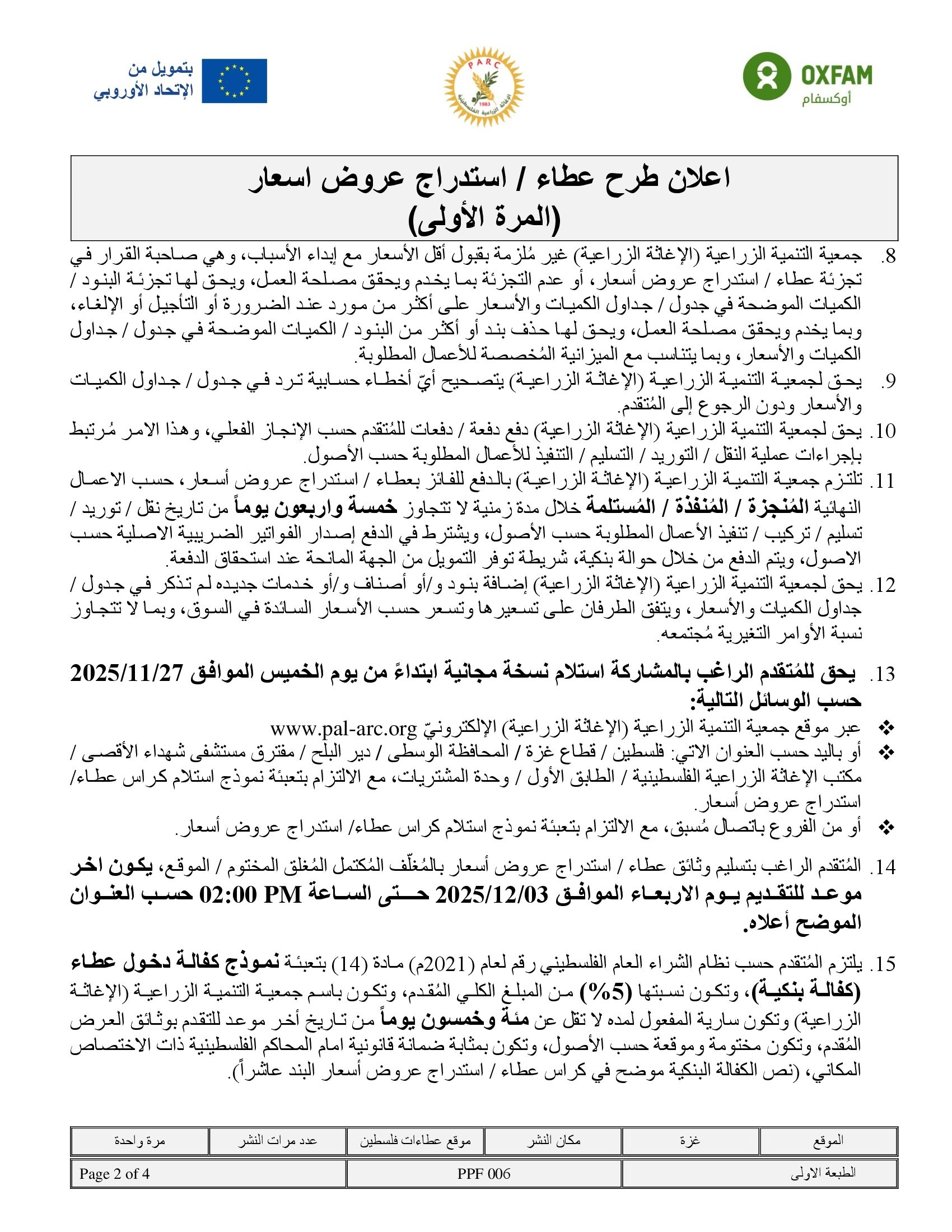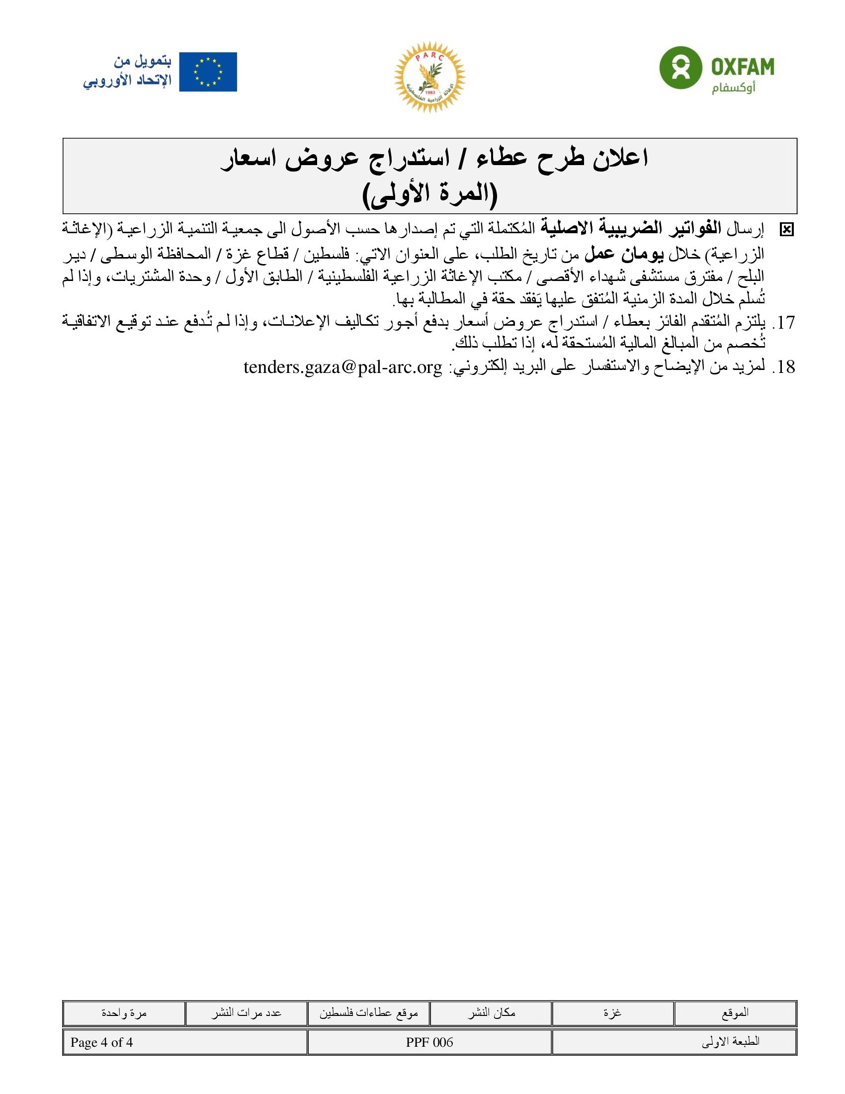المؤسسة : جمعية التنمية الزراعية موقغ : https://pal-arc.org/tenders/ar بريد : info@pal-arc.org